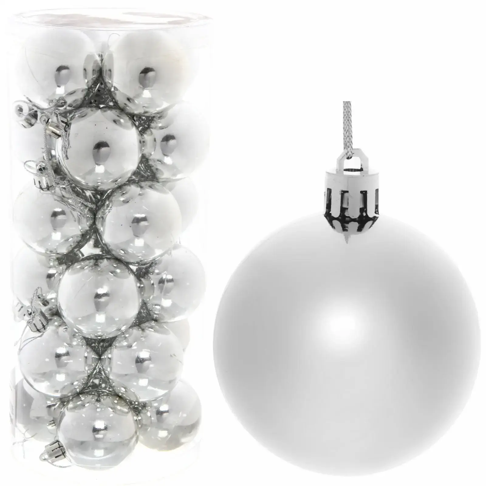 Каждый шар имеет стандартный размер 6 см, что делает их универсальными для любого стиля украшения. Изготовленные из прочного пластика, они легкие и безопасные, что особенно важно, если в вашем доме есть маленькие дети. Упаковка из 24 штук позволяет вам украсить елку или создать праздничный декор в любом количестве.