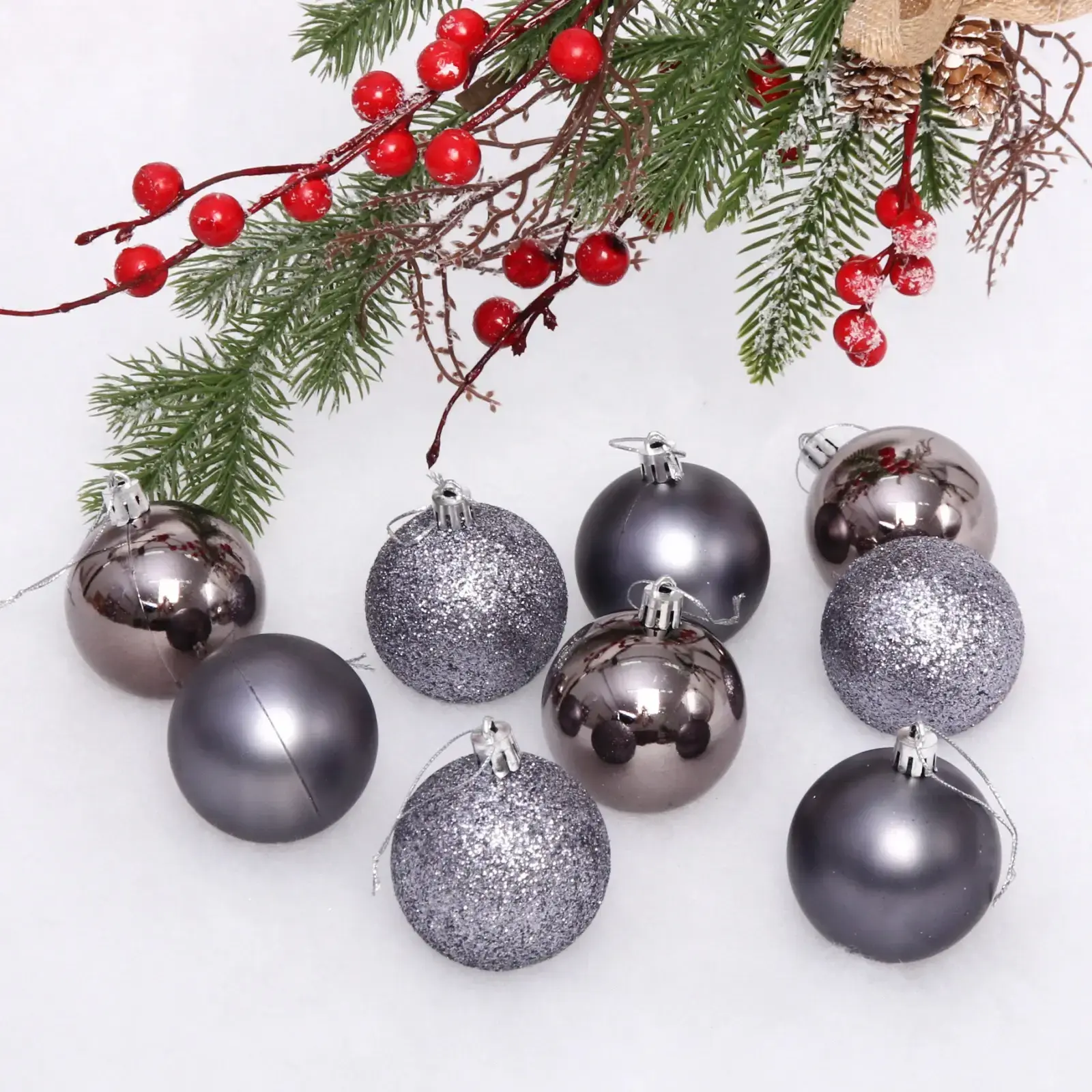 Выбор этого набора — это не только стильное решение, но и практичность. Шары выполнены из качественного пластика, что обеспечивает их долговечность и устойчивость к повреждениям. Они не боятся падений и легко очищаются от пыли, что делает их идеальными для многократного использования. Графитовый цвет и разнообразие фактур позволят вам легко сочетать их с другими элементами декора, создавая гармоничный и стильный вид.