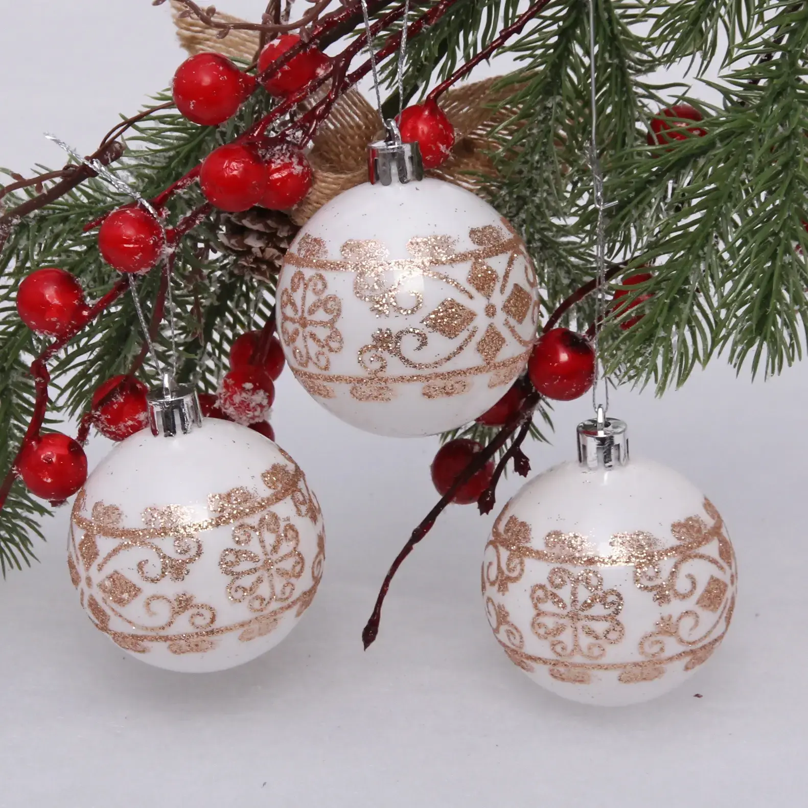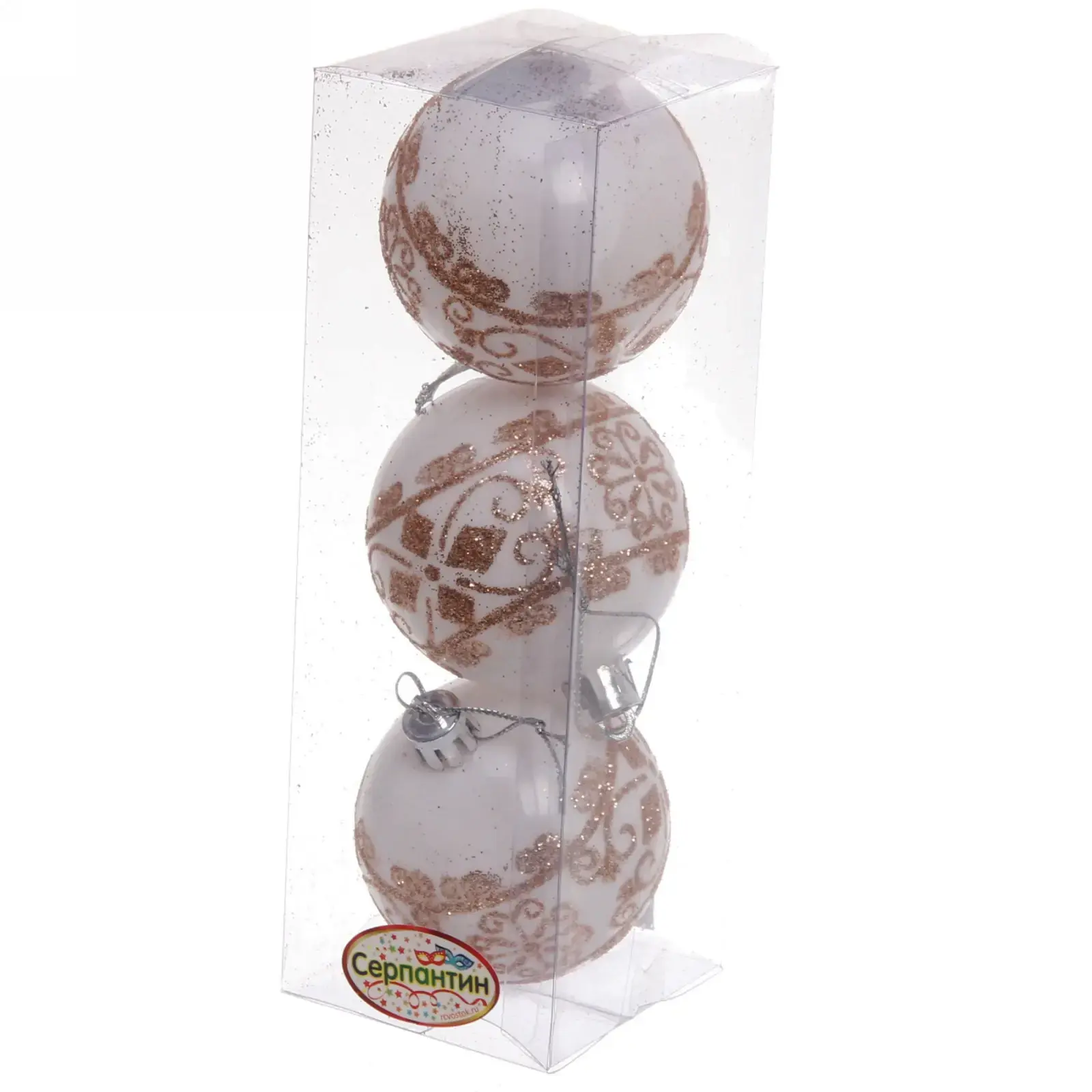 Эти изысканные новогодние шары станут идеальным украшением для вашей елки, добавляя ей волшебства и уюта. Каждый шар диаметром 6 см выполнен в белом цвете с золотыми узорами и блестками, что придаёт им особую элегантность. Набор из трех шаров позволит вам создать гармоничное оформление, которое будет радовать глаз в течение всего праздничного сезона.
