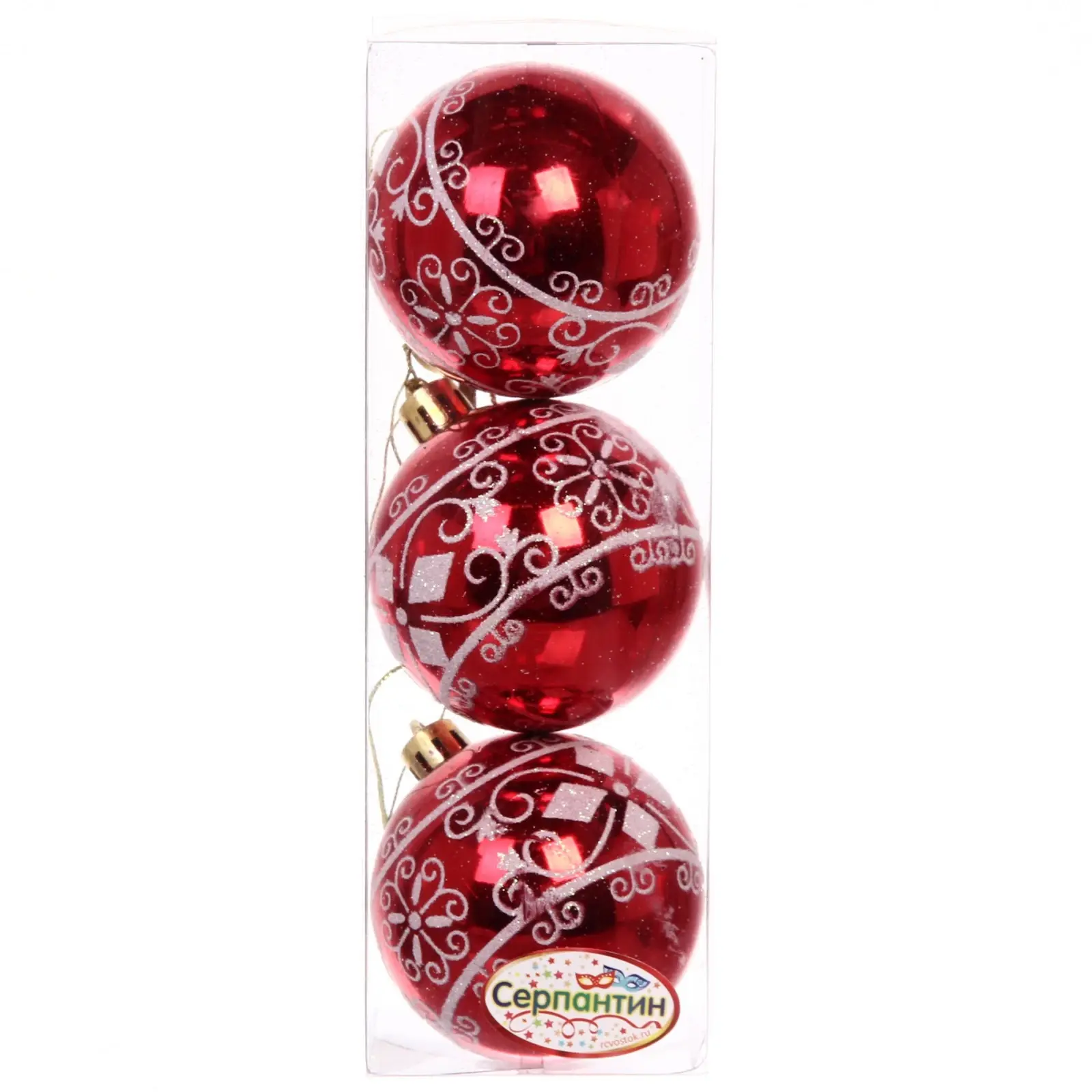 Три классических ёлочных шара в насыщенном красном цвете с ажурным узором станут стильным дополнением новогоднего декора. Глянцевая поверхность и продуманный дизайн создают эффект ручной росписи, добавляя интерьеру уютную праздничную атмосферу.