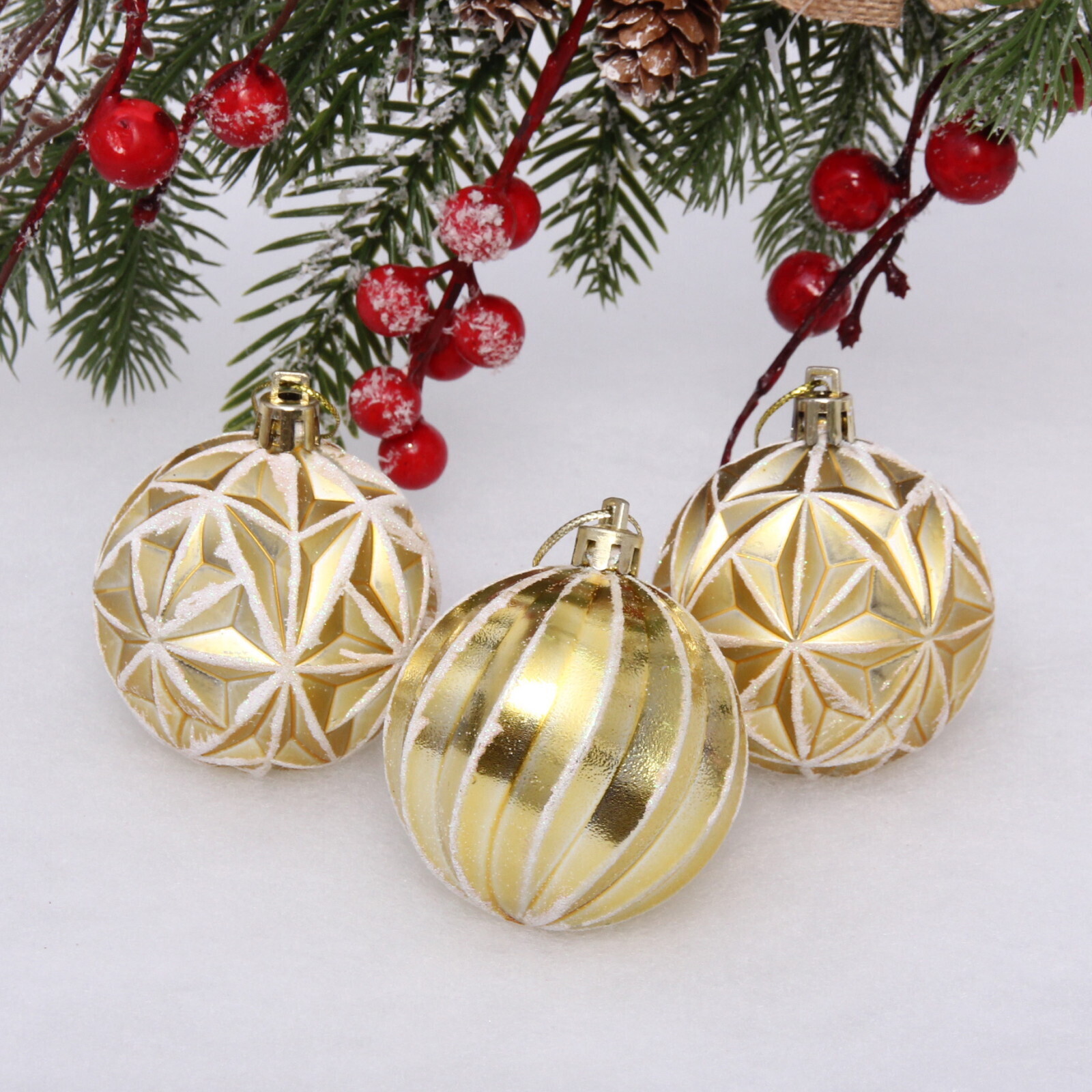 Тройной набор елочных шаров с уникальными узорами — идеальное решение для стильного новогоднего декора. Сочетание золотых рельефных орнаментов и снежно-белых акцентов превратит вашу елку в настоящее произведение искусства.