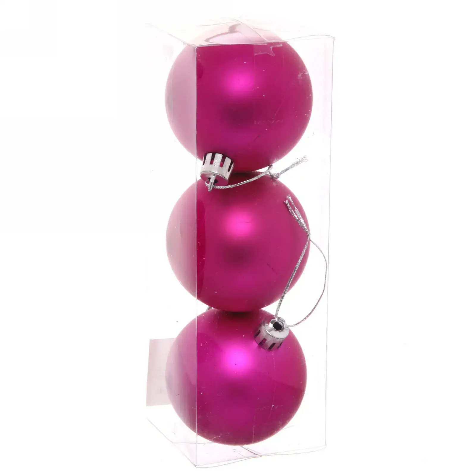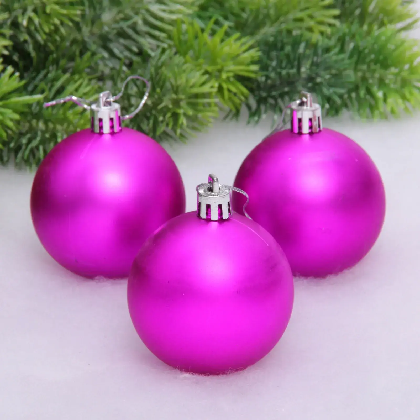Набор из трёх элегантных шаров для создания гармоничного новогоднего декора. Матовая поверхность фуксии смягчает свет гирлянд, создавая уютную атмосферу в интерьере любого стиля.