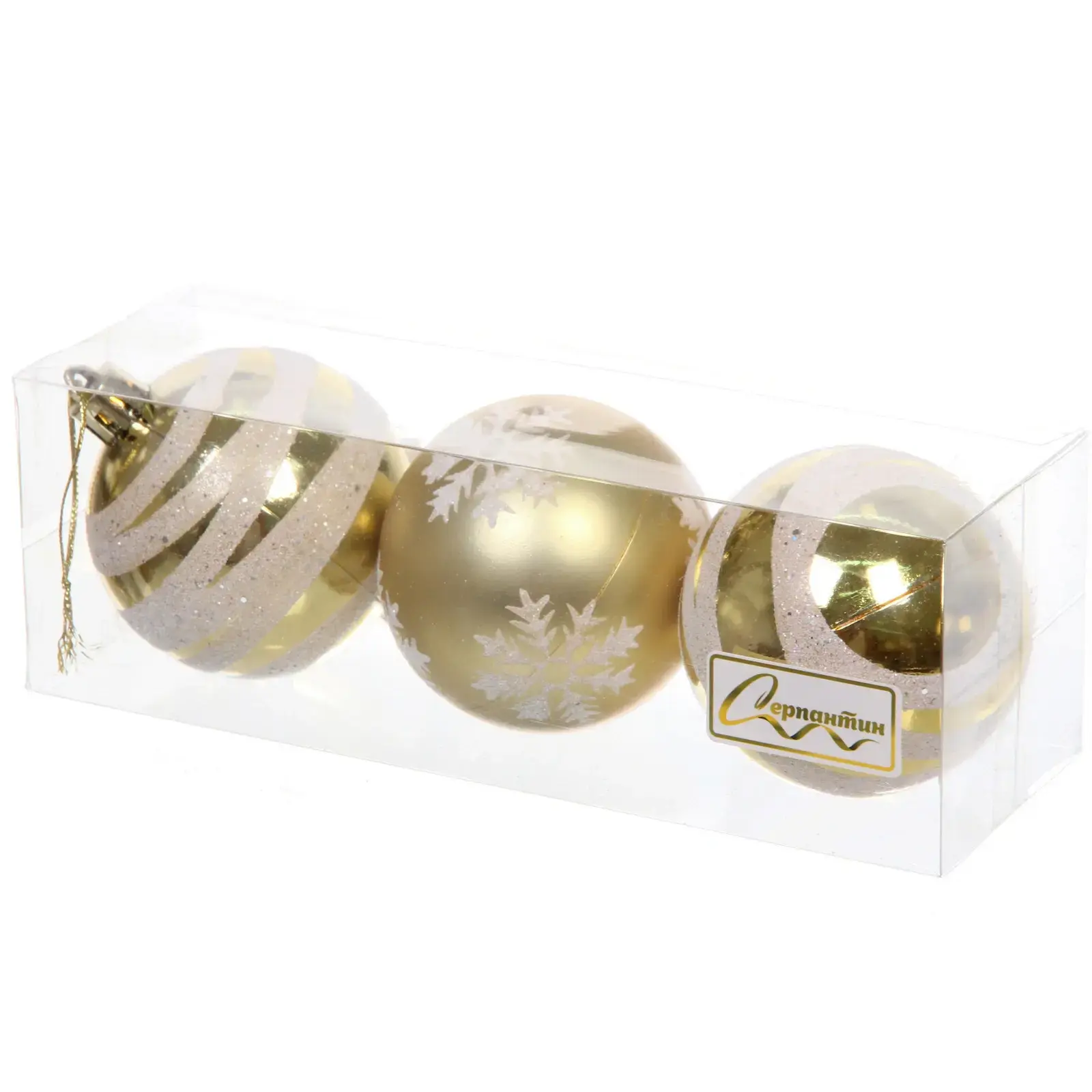 Шары диаметром 6 см идеально подходят для украшения елки, гирлянд или других новогодних декораций. Они легко крепятся благодаря металлическим фитингам, что позволяет быстро и удобно их развешивать. Набор состоит из трех шаров, каждый из которых имеет свой уникальный стиль: один с гладкой поверхностью и снежинками, другой с блестящими полосами, и третий с интересным сочетанием белого и золотого.