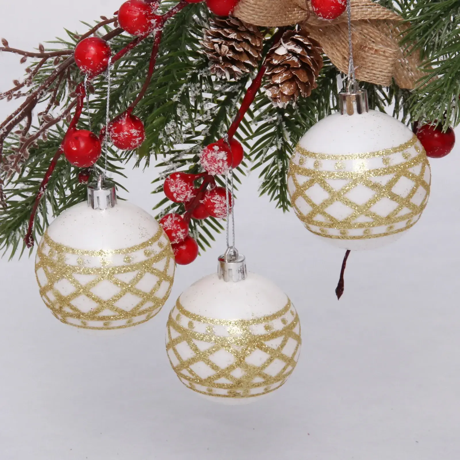 Эти новогодние шары с уникальным дизайном «Зимний узор» добавят изысканности и стиля в ваш праздничный декор. Их белый цвет с золотыми блестящими узорами создаст атмосферу уюта и тепла в вашем доме. Каждый шар диаметром 6 см выполнен из легкого и прочного пластика, что делает их идеальными для украшения елки или других праздничных элементов.