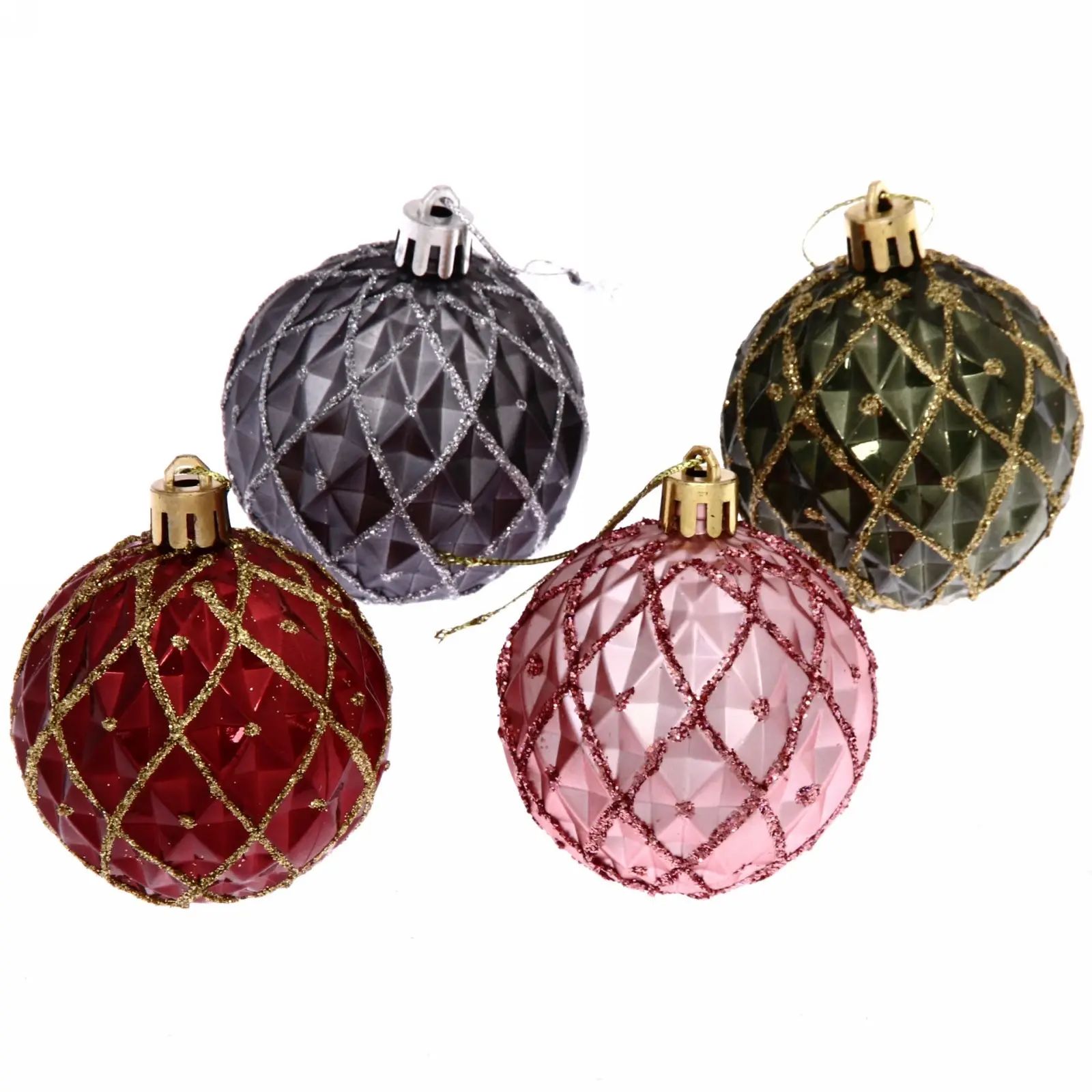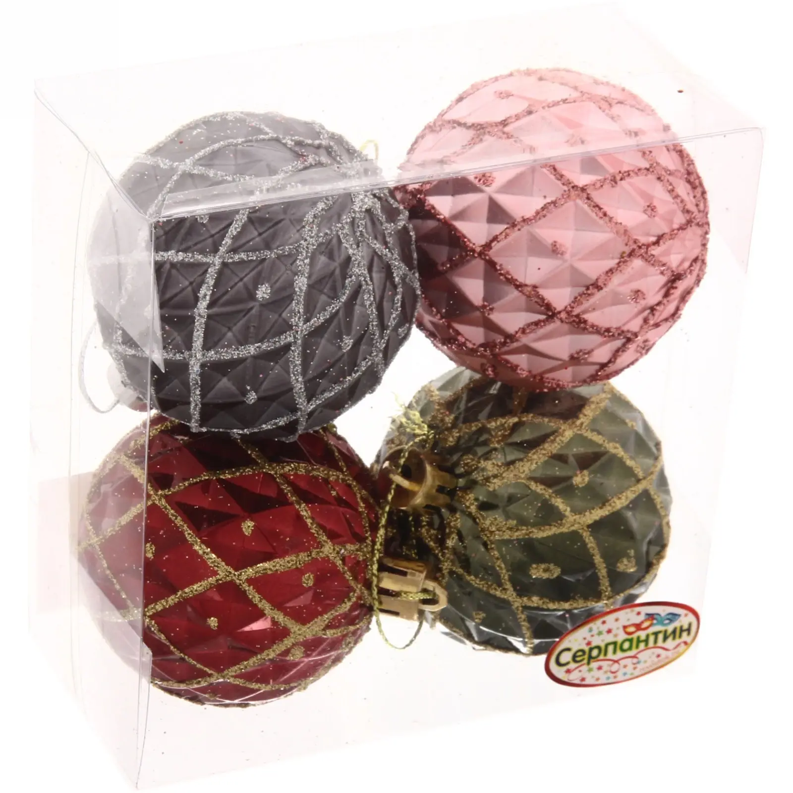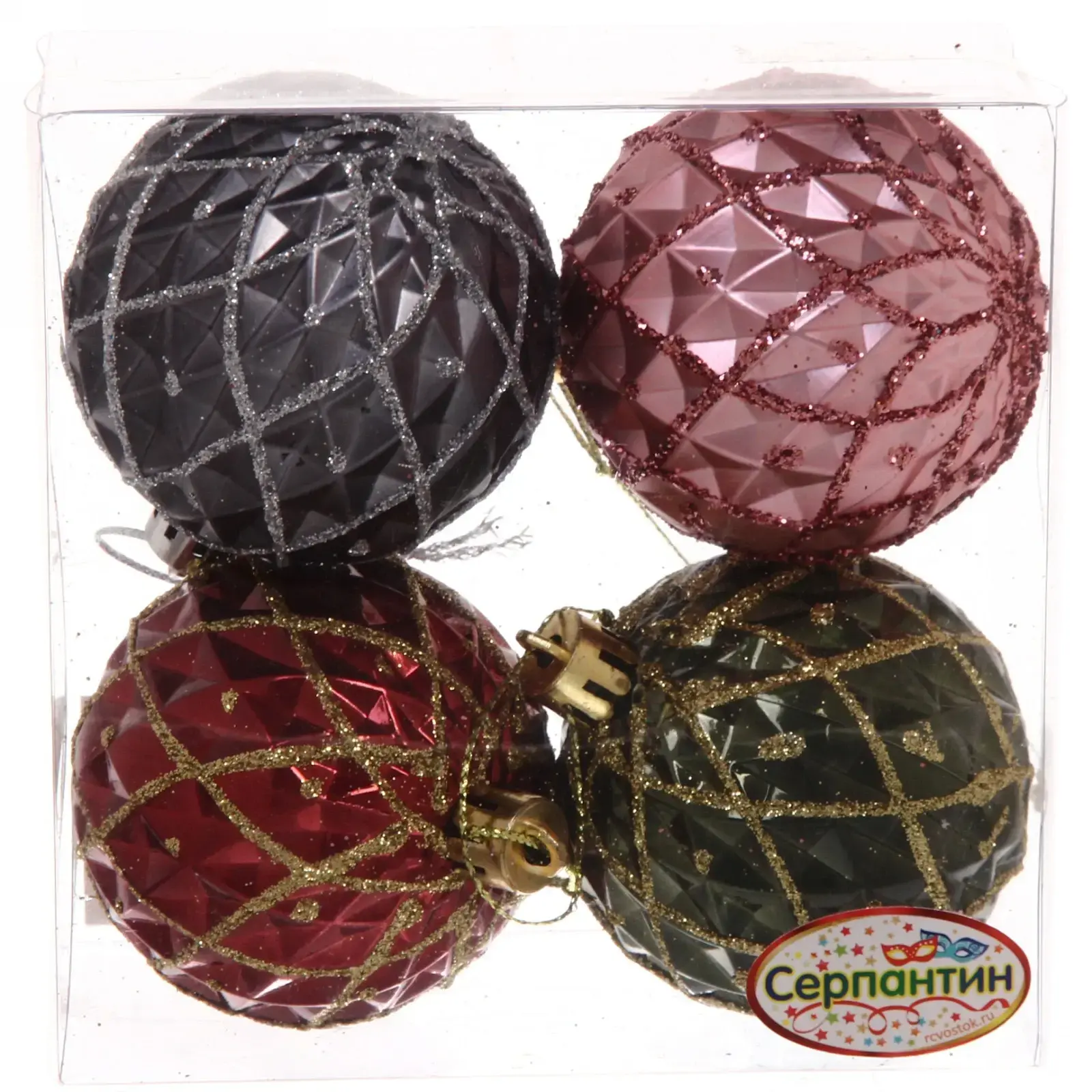 Этот набор включает четыре шарика в ярких цветах: серый, красный, розовый и зеленый, каждый украшен изысканным золотым или серебряным узором в виде сетки, что придает им праздничный блеск и изящество. Благодаря универсальным цветам и декоративным элементам, эти игрушки легко сочетаются с различным декором и создают атмосферу сказки в доме.