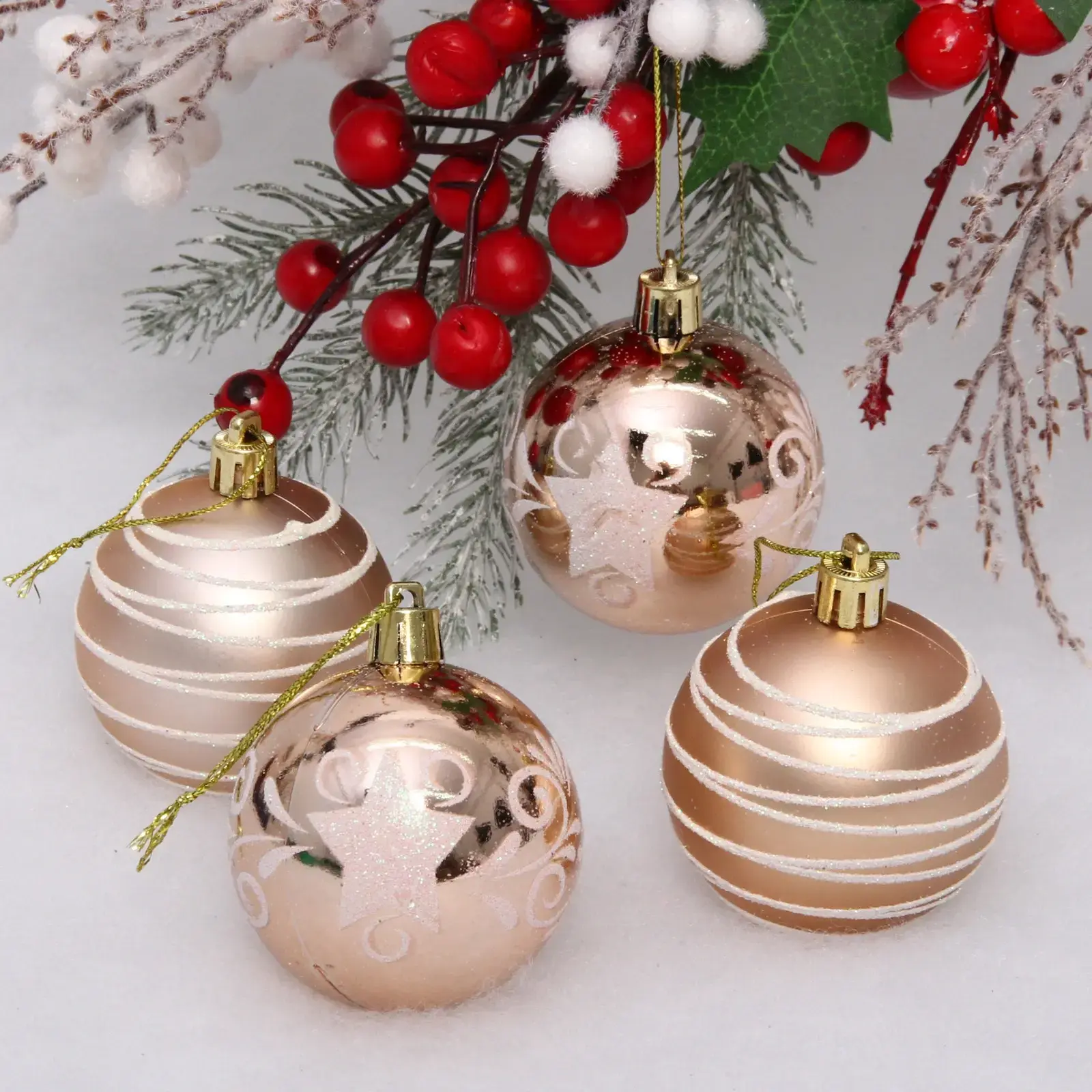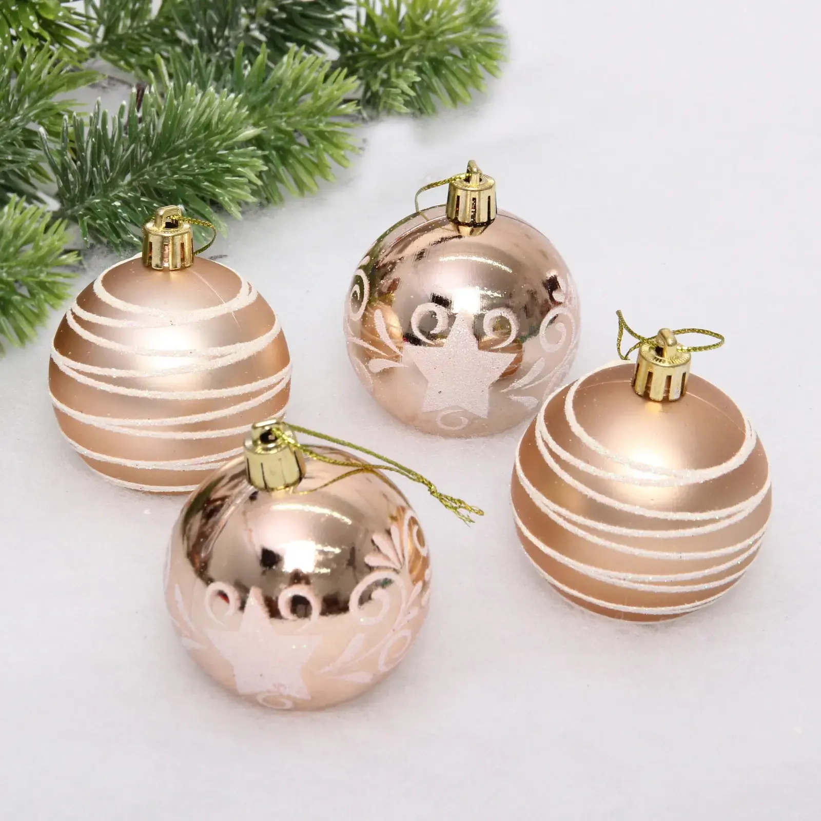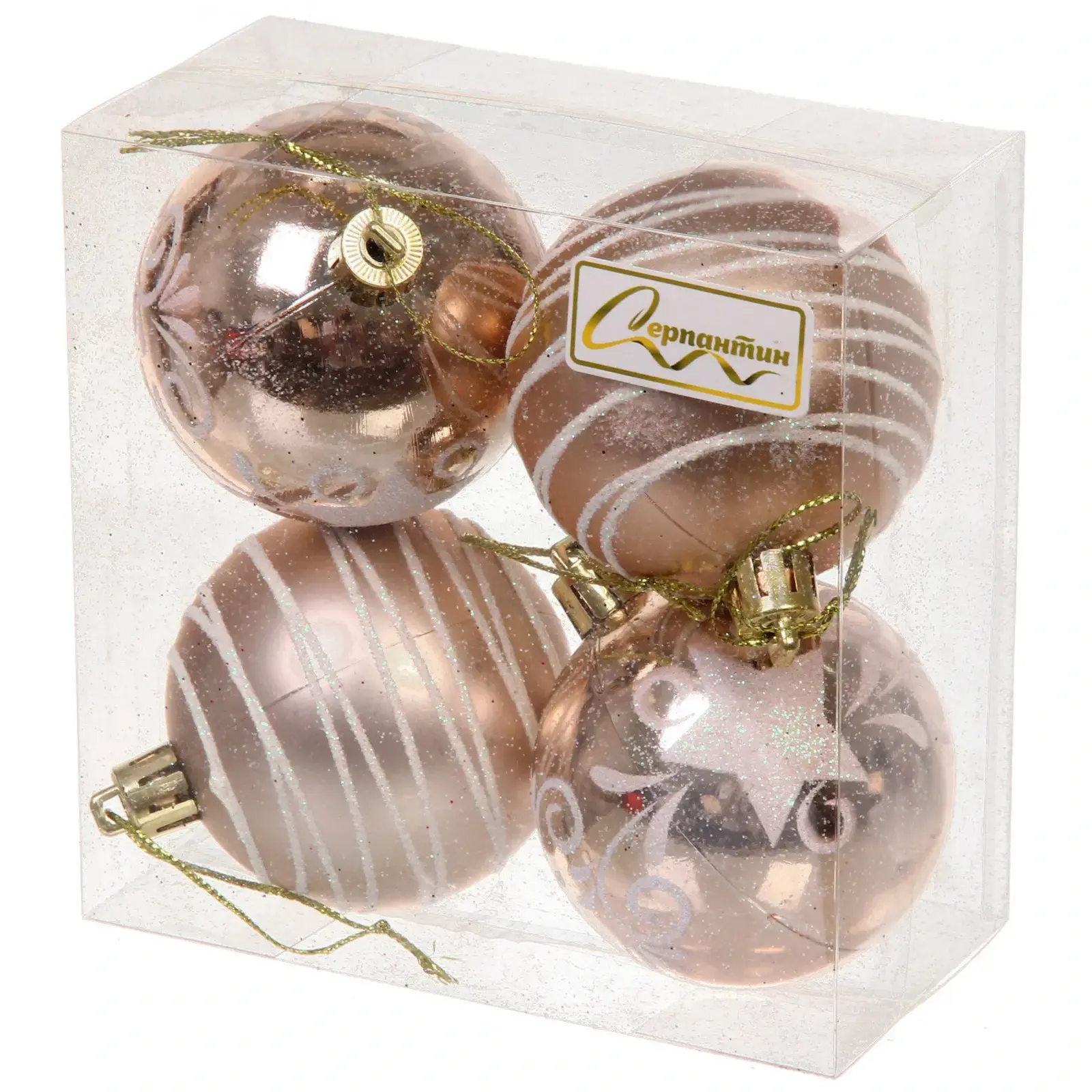 Шары легко подвешиваются благодаря золотистым металлическим веревочкам, что позволяет вам быстро и удобно декорировать ваше пространство. Набор состоит из четырех шаров, каждый из которых имеет уникальный дизайн: один украшен белыми полосами, другой — рельефным узором с звёздочкой и завитками. Эти игрушки подойдут как для домашнего использования, так и для оформления общественных мест.