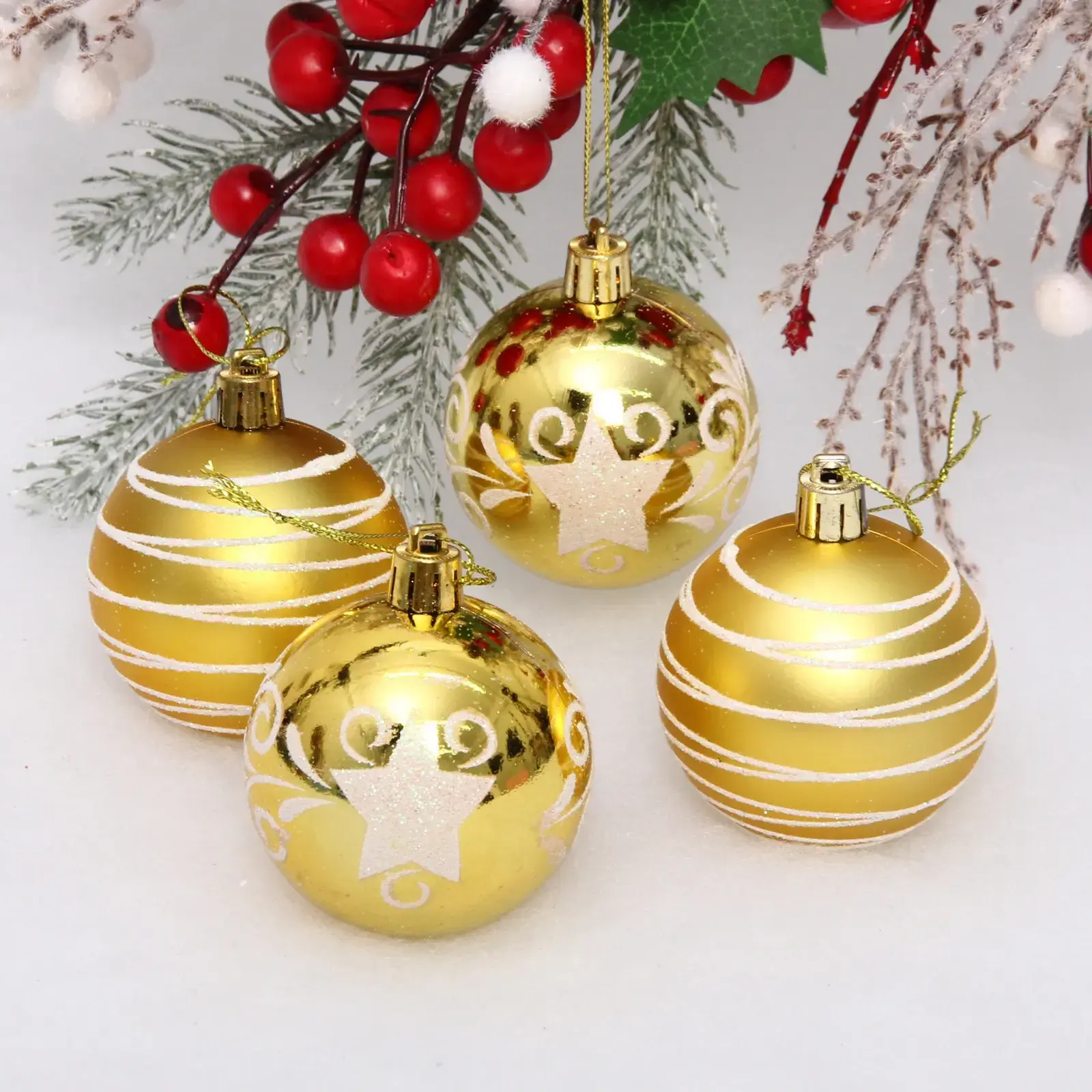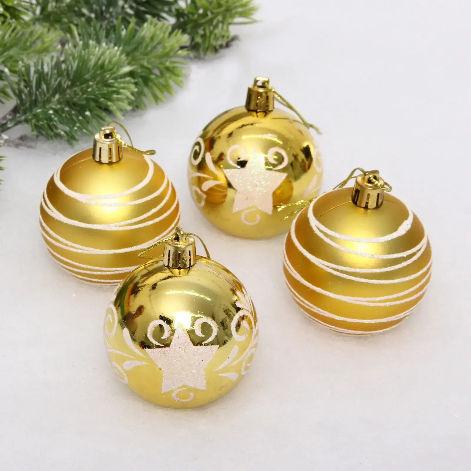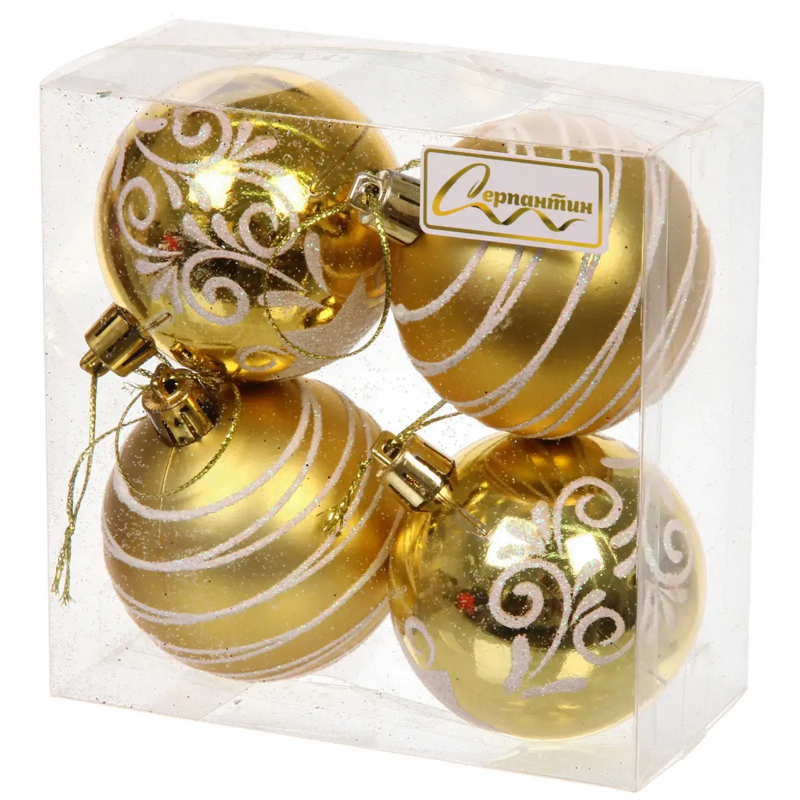 В набор входят 4 шара, каждый из которых имеет стандартный размер 6 см. Золотой цвет с белыми узорами делает их универсальными для любого новогоднего декора. Упаковка прозрачная, что позволяет увидеть содержимое и оценить красоту шаров еще до покупки.