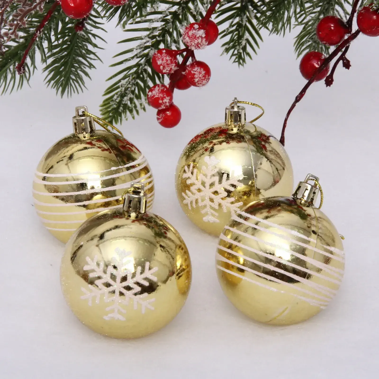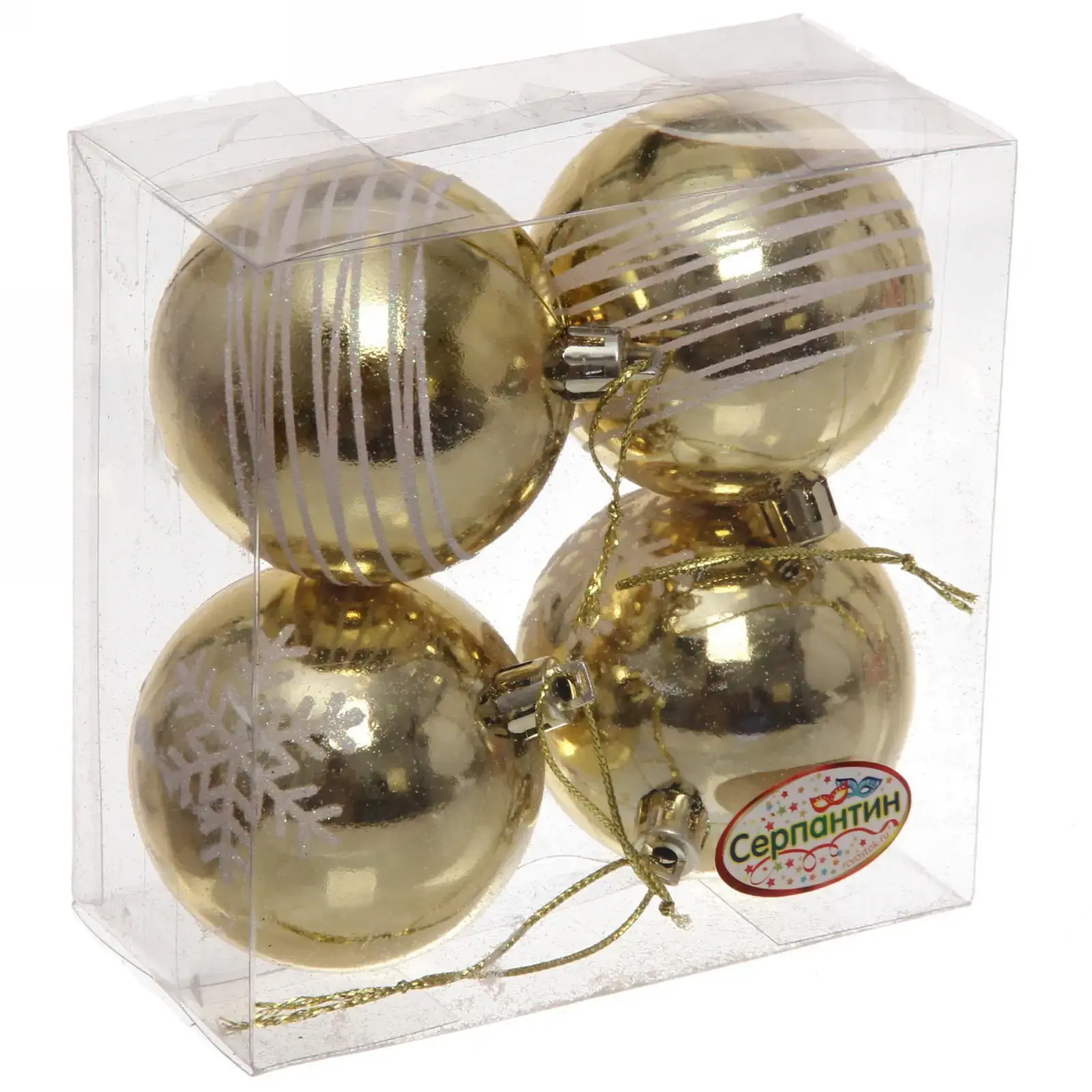 Шары имеют стандартный размер 6 см, что делает их универсальными для любого стиля оформления. Набор включает четыре шара, каждый из которых отличается дизайном, что позволяет вам проявить креативность в декорировании. Цветовая гамма в золотых и белых тонах прекрасно сочетается с любыми новогодними темами.
