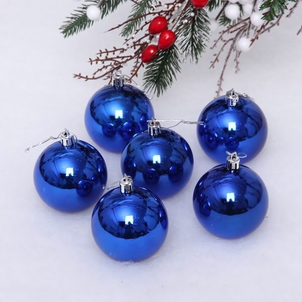 Диаметр каждого шара 6 см, материал — ПВХ с глянцевым покрытием. Цвет — насыщенный синий, крепления серебристые. Набор упакован и готов к использованию. Эти шары — стильная основа для праздничных композиций и надёжное украшение на долгие годы.