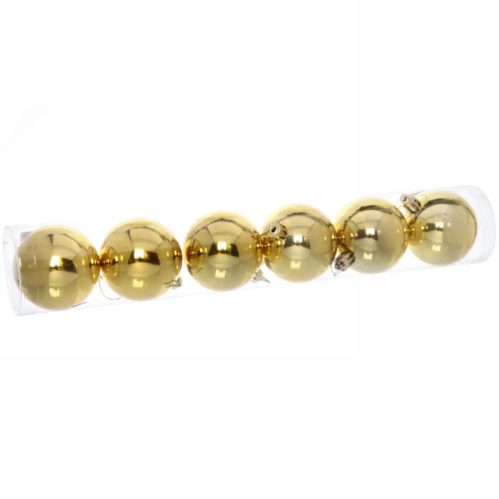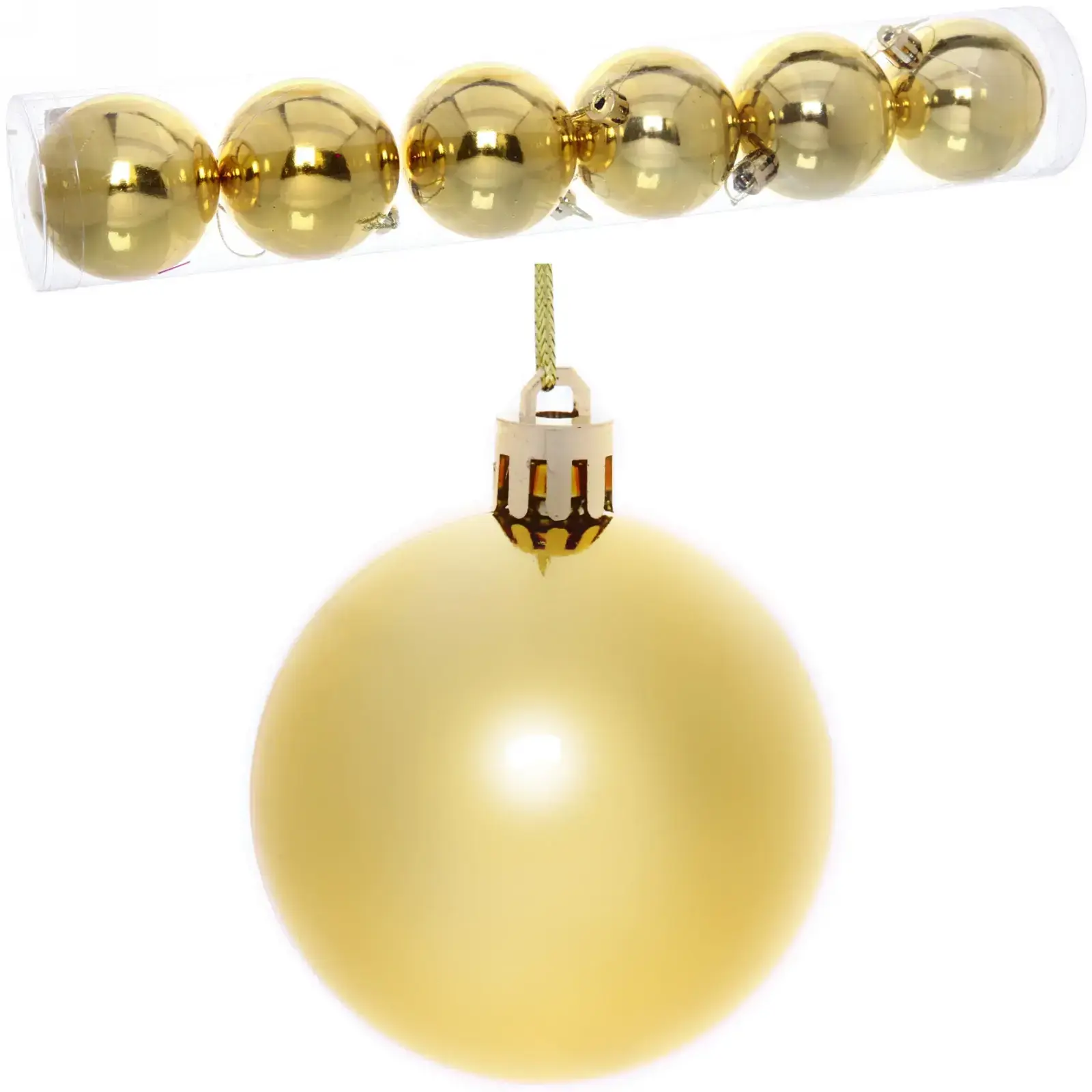 Каждый шар имеет стандартный размер 6 см, что делает их универсальными для любого стиля декора. Золотой цвет шаров создает праздничное настроение и отлично сочетается с другими оттенками. Набор упакован в прозрачный контейнер, что позволяет удобно хранить шары и защищает их от повреждений.