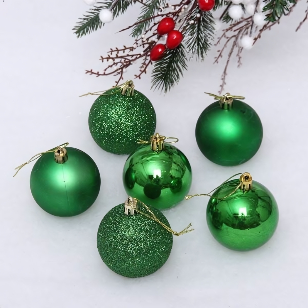 Погрузитесь в мир праздника с набором новогодних шаров 'Микс фактур'. Эти шары диаметром 6 см, выполненные в различных оттенках зеленого, добавят яркие акценты в ваш новогодний декор. Каждый шар имеет уникальную текстуру: от глянцевого до матового, а один из них украшен блестящими частицами, что придаст вашему интерьеру особый шарм.