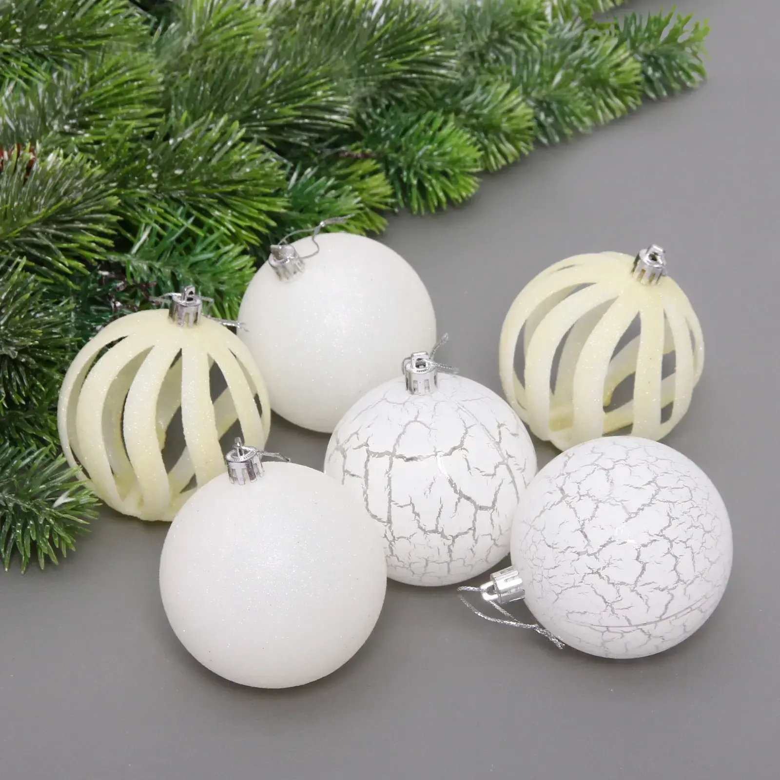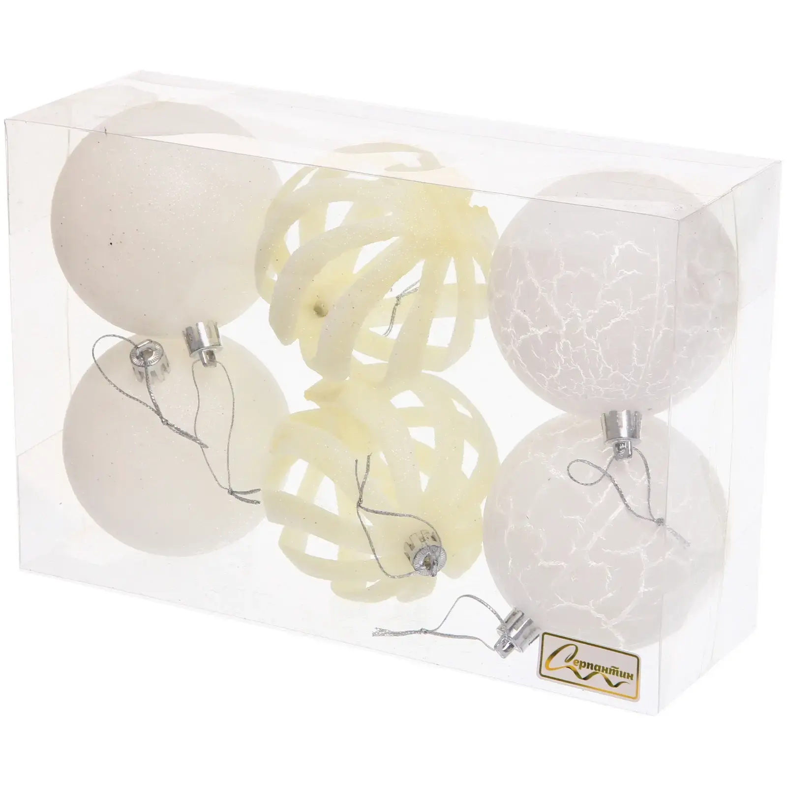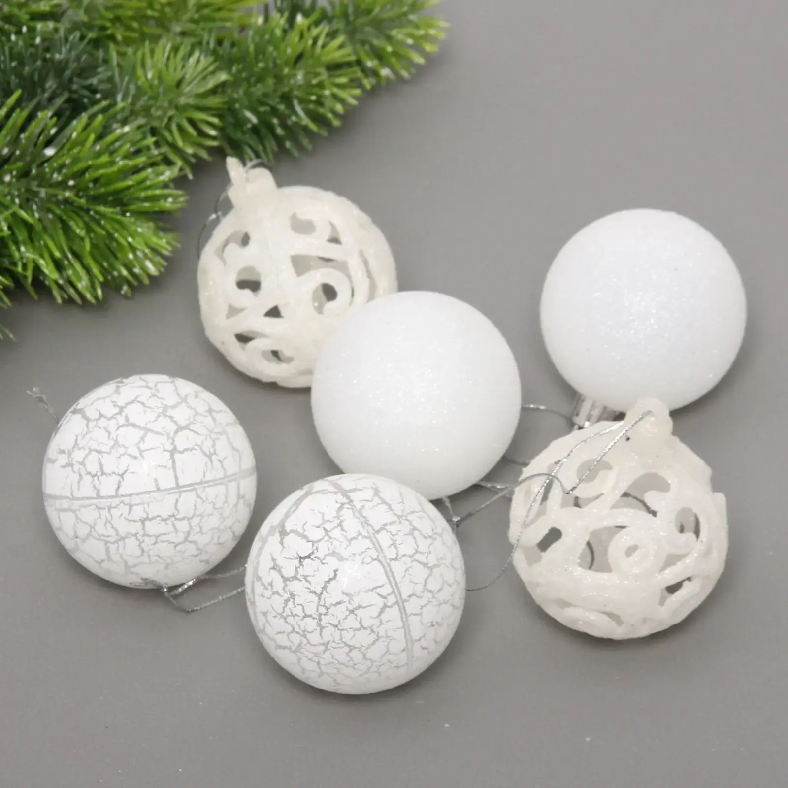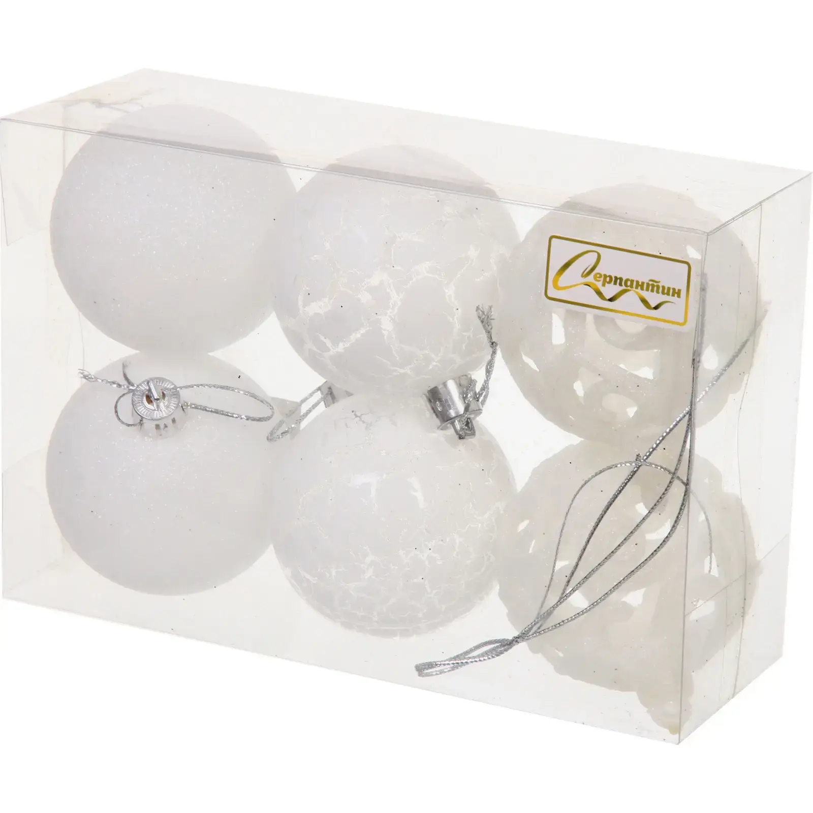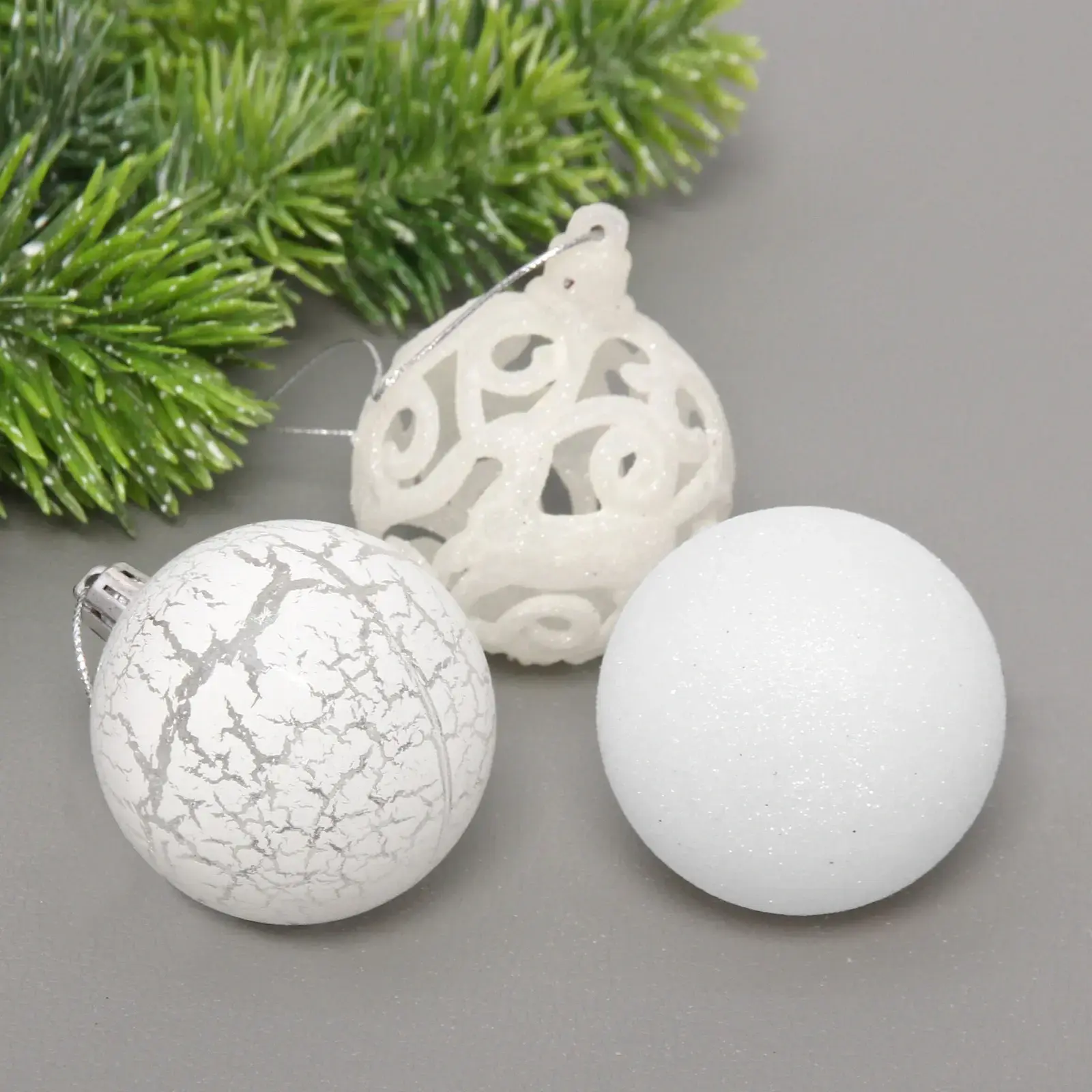 Каждый шар имеет диаметр 6 см и представлен в белом цвете с различными фактурами: матовые, блестящие и ажурные. Упакованы шары в прозрачную коробку, что позволяет удобно хранить их после праздников. Эти новогодние шары — отличный выбор для тех, кто ценит качество и стиль в праздничном оформлении.