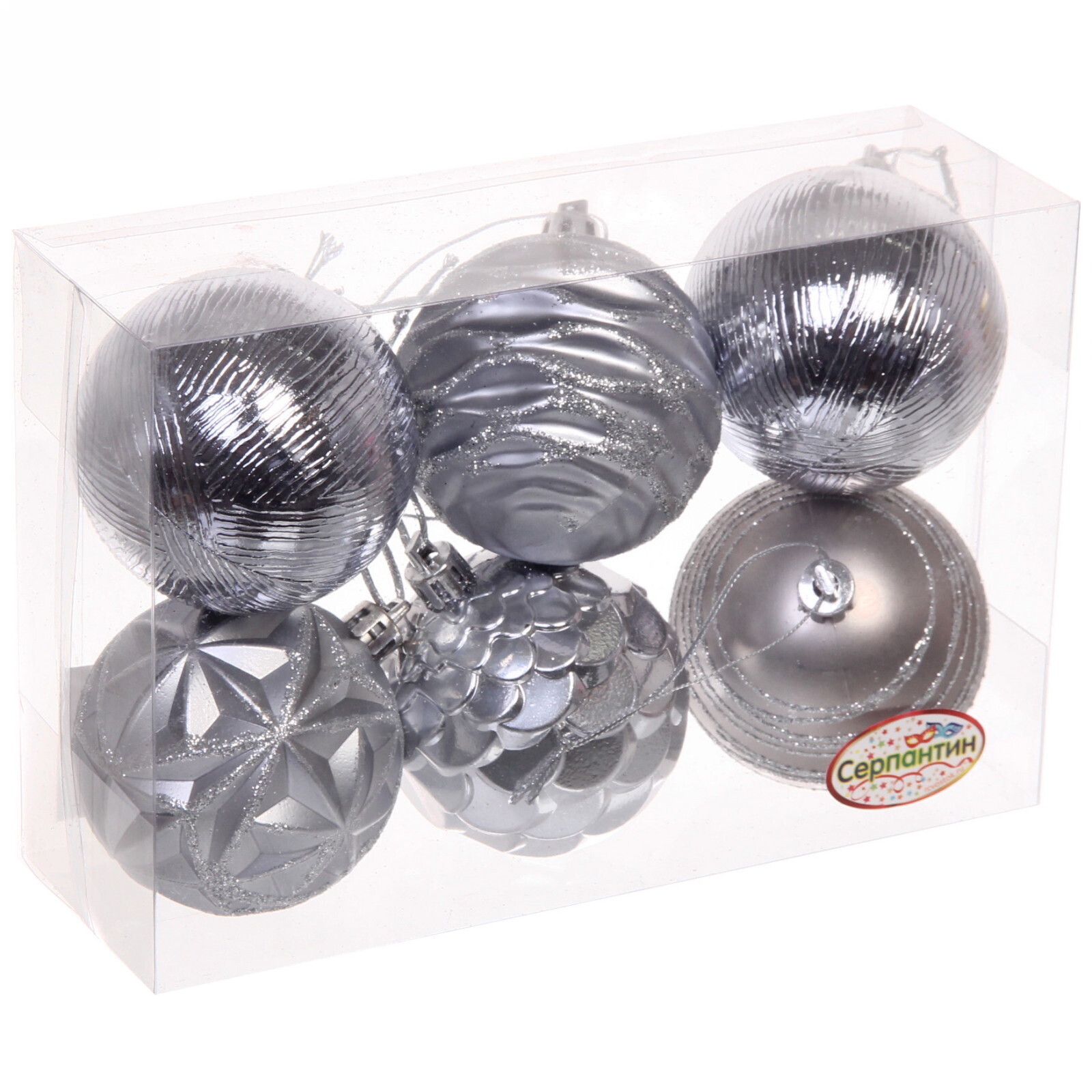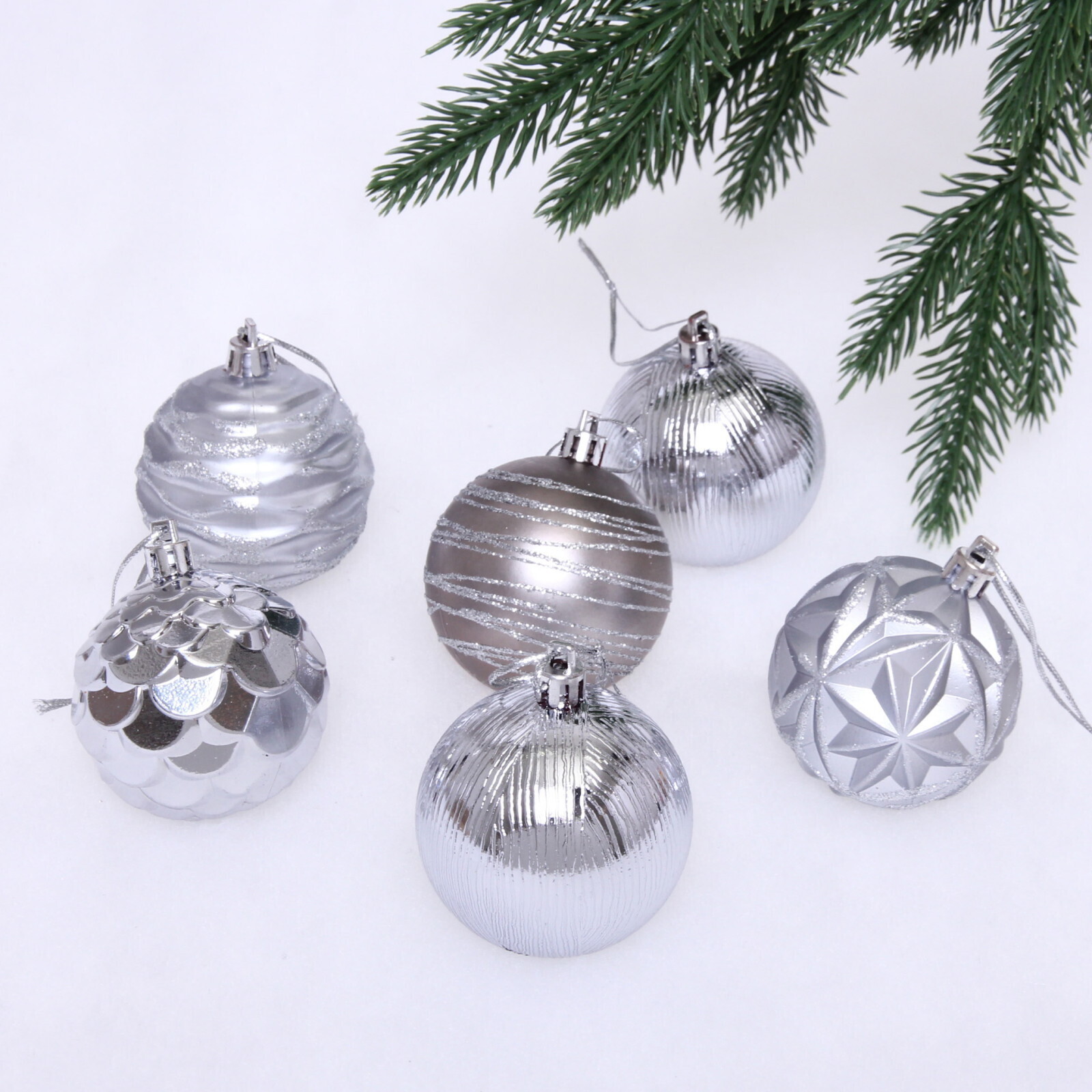 Каждый шар диаметром 6 см создан из качественного пластика с различными фактурами, что позволяет создать многогранный блестящий эффект при искусственном освещении.