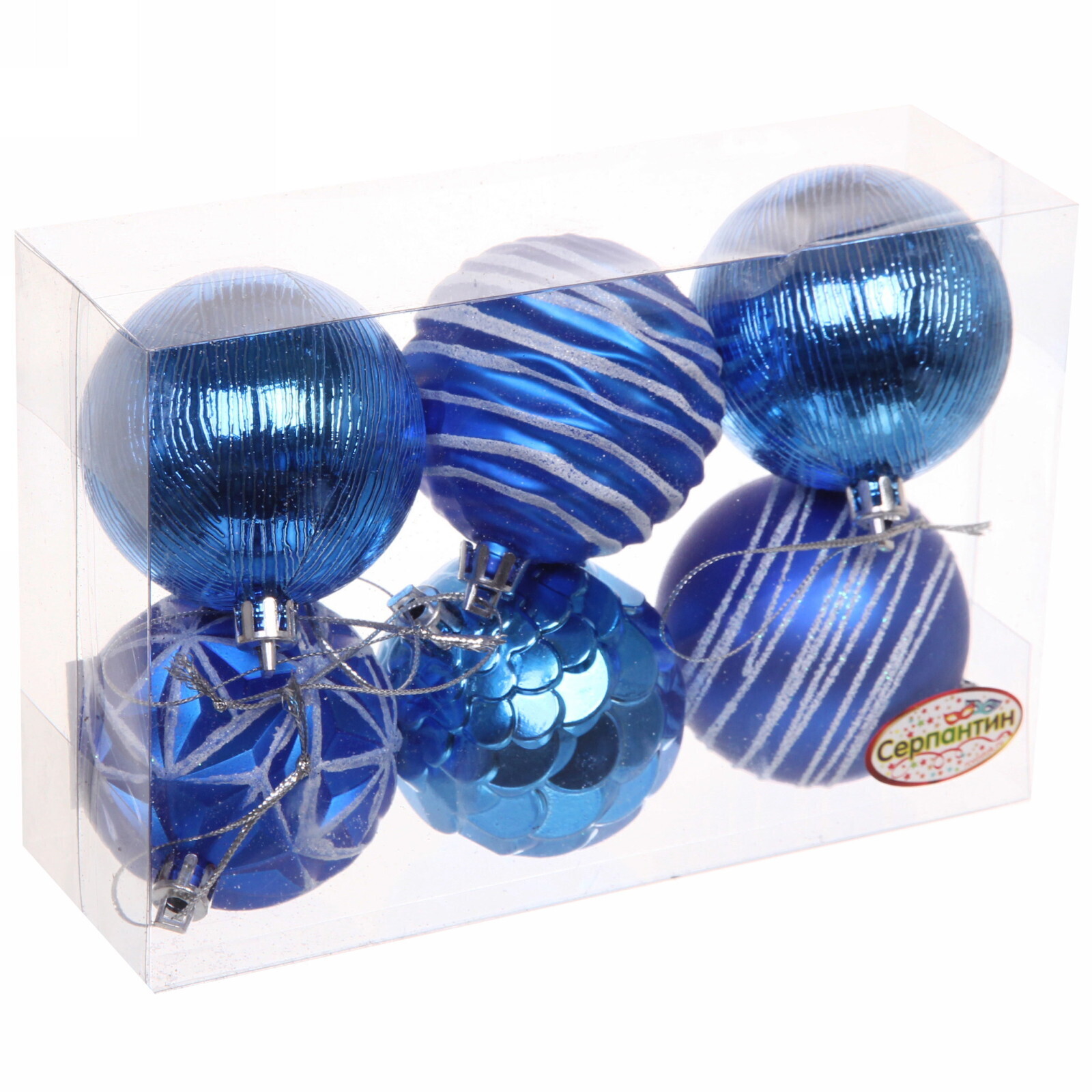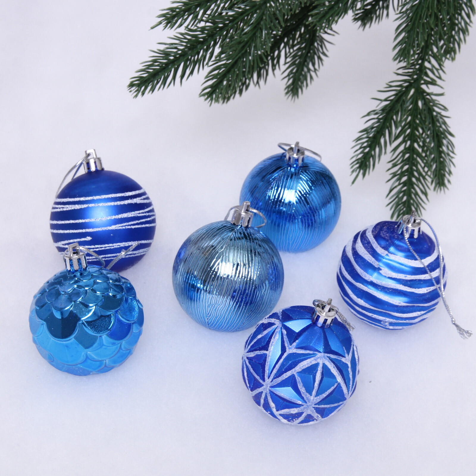 В набор входят шесть шаров, каждый из которых имеет свои особенности: один с зеркальной гладкой поверхностью, другой с рифленой текстурой, третий с чешуйчатым дизайном, а остальные украшены полосами и геометрическими узорами. Эти детали делают набор универсальным для любого стиля оформления. Упаковка прозрачная, что позволяет увидеть все шары и выбрать идеальный вариант для вашего праздника.