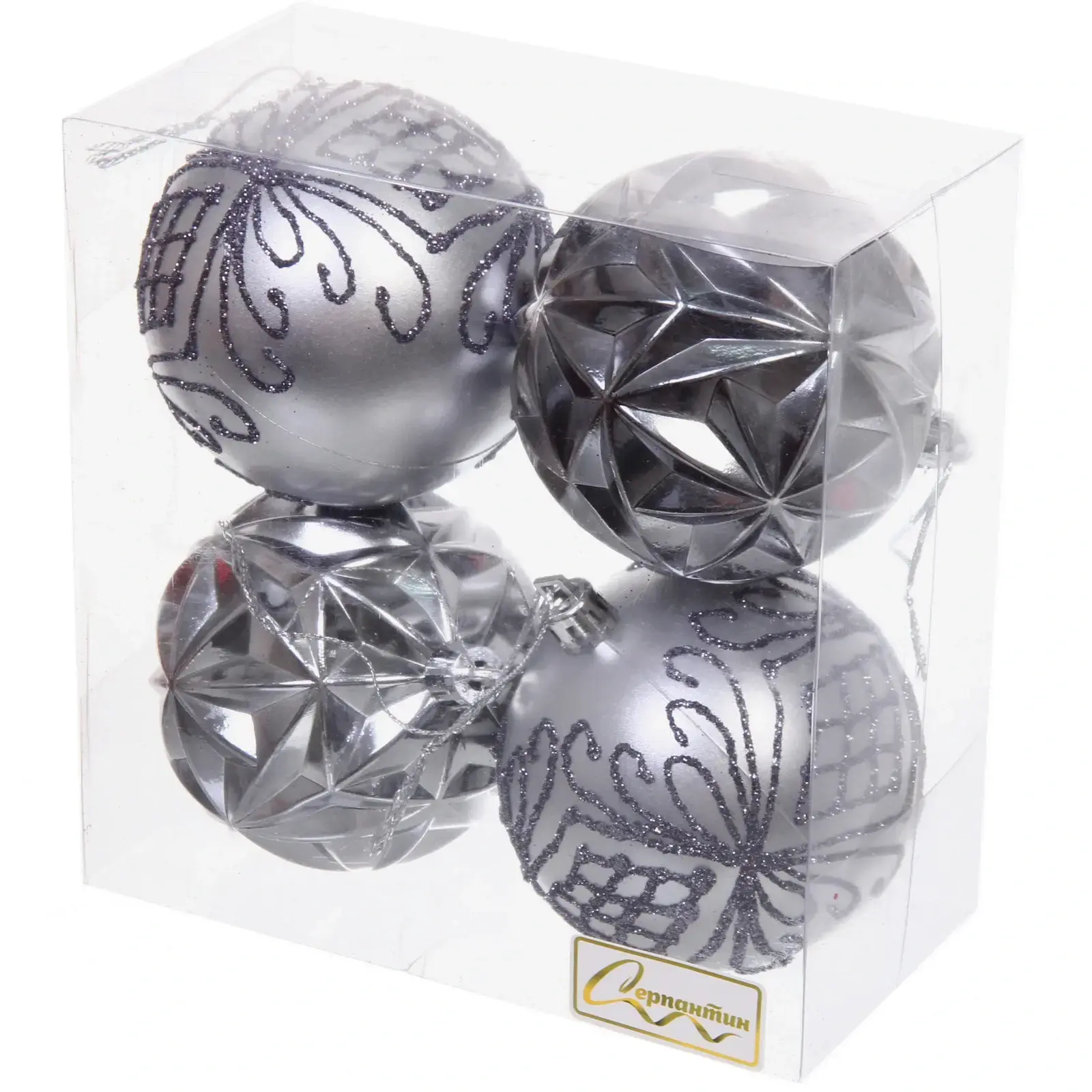 В набор входят четыре шара, каждый из которых имеет свой оригинальный дизайн. Шары выполнены из прочного пластика, что обеспечивает их долговечность и легкость. Они упакованы в прозрачную коробку, что позволяет удобно хранить их после праздников. Размер каждого шара составляет 7 см, что делает их идеальными для любой елки.