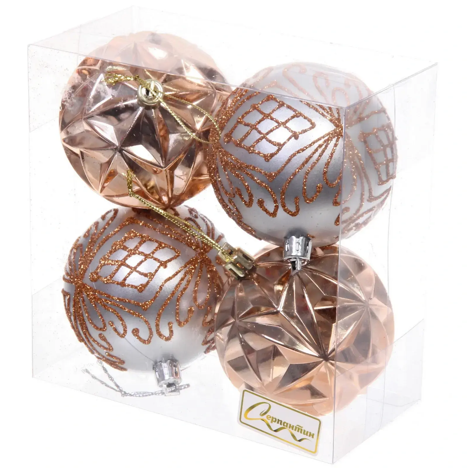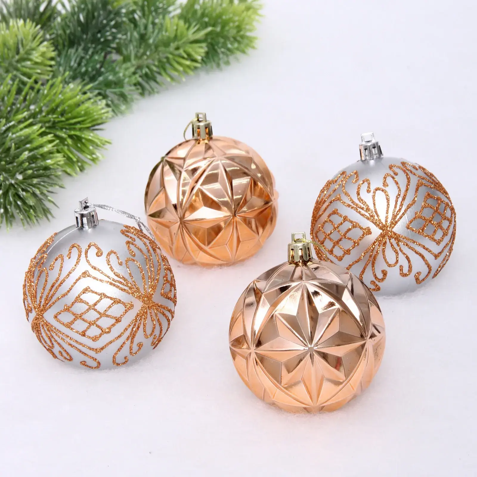 Эти новогодние шары станут идеальным дополнением к вашему праздничному декору, придавая ему атмосферу уюта и волшебства. Каждый шар диаметром 7 см выполнен из прочного пластика, что обеспечивает долговечность и надежность в использовании. Набор состоит из четырех шаров, два из которых имеют изысканный шампановый цвет с рельефным рисунком, а два других — серебристый с блестящими узорами. Такой набор не только украсит вашу елку, но и станет прекрасным подарком для близких.