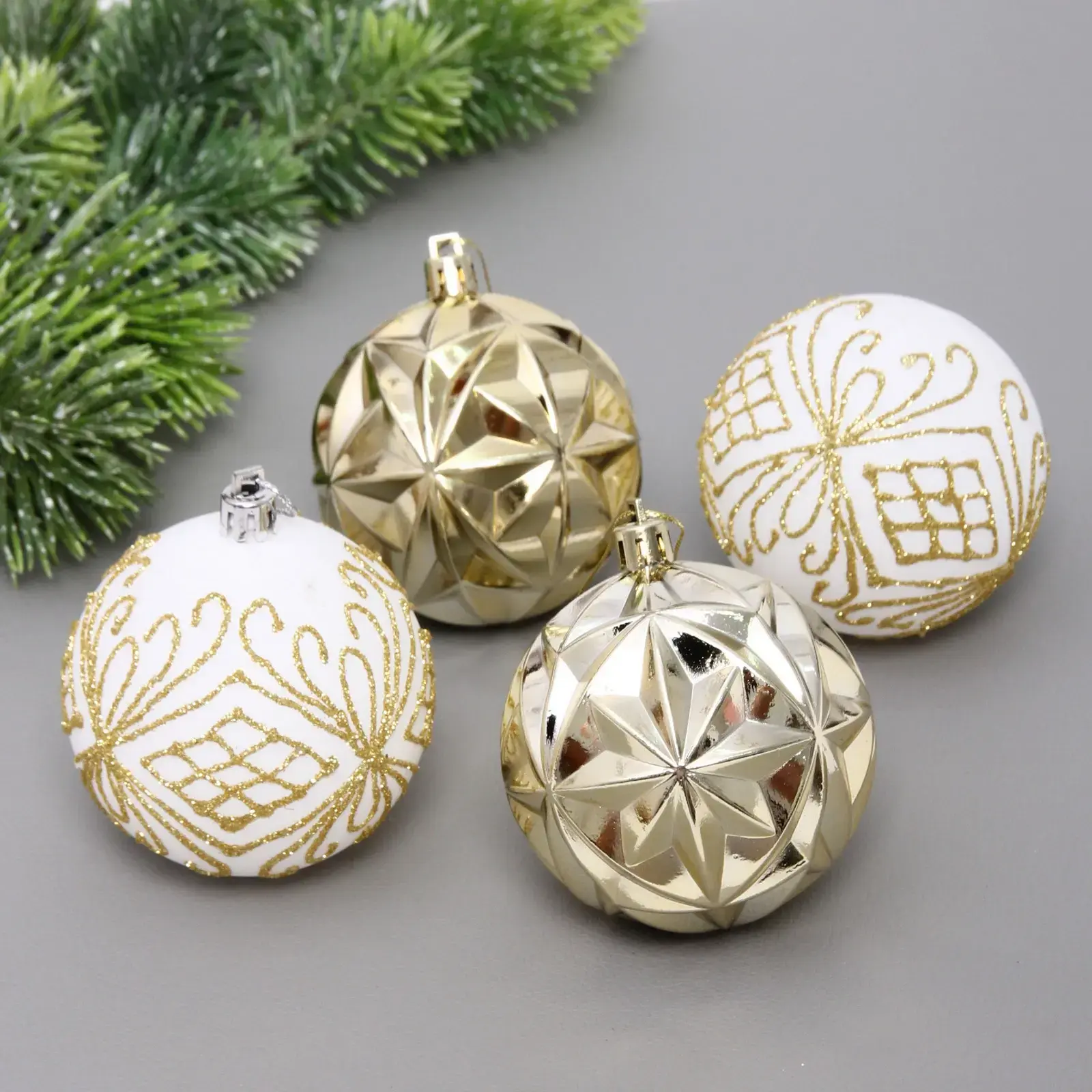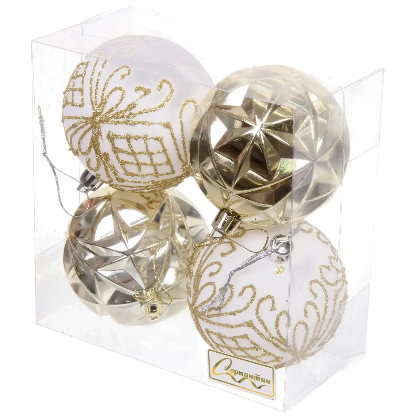 В набор входят четыре шара: два белых с золотыми узорами и два золотых с фактурной поверхностью. Каждый шар имеет стандартный размер 7 см, что делает их универсальными для любого стиля оформления. Упаковка выполнена из прозрачного пластика, что позволяет видеть шары и защищает их от повреждений.