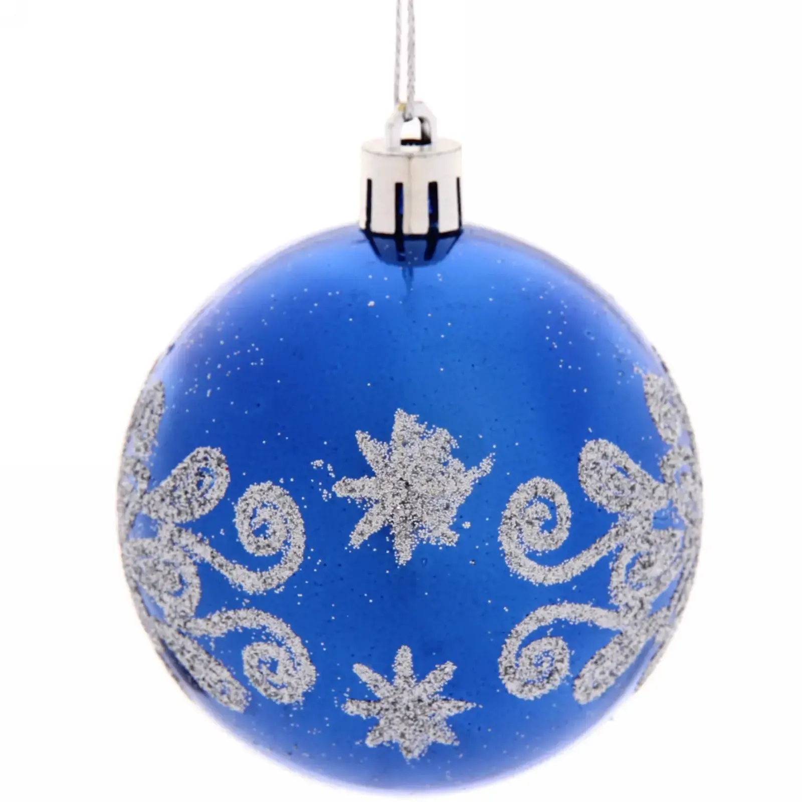 Размер каждого шара – 7 см в диаметр, цвет – насыщенный синий, покрытие – глянцевый блестящий слой с серебряным узором «Павлиний хвост». В упаковке три единицы, каждая с собственной металлической петлей для подвешивания. Бренд – Серпантин, производитель – Hua Sheng Industrial Co., LTD, страна изготовления – Китай.