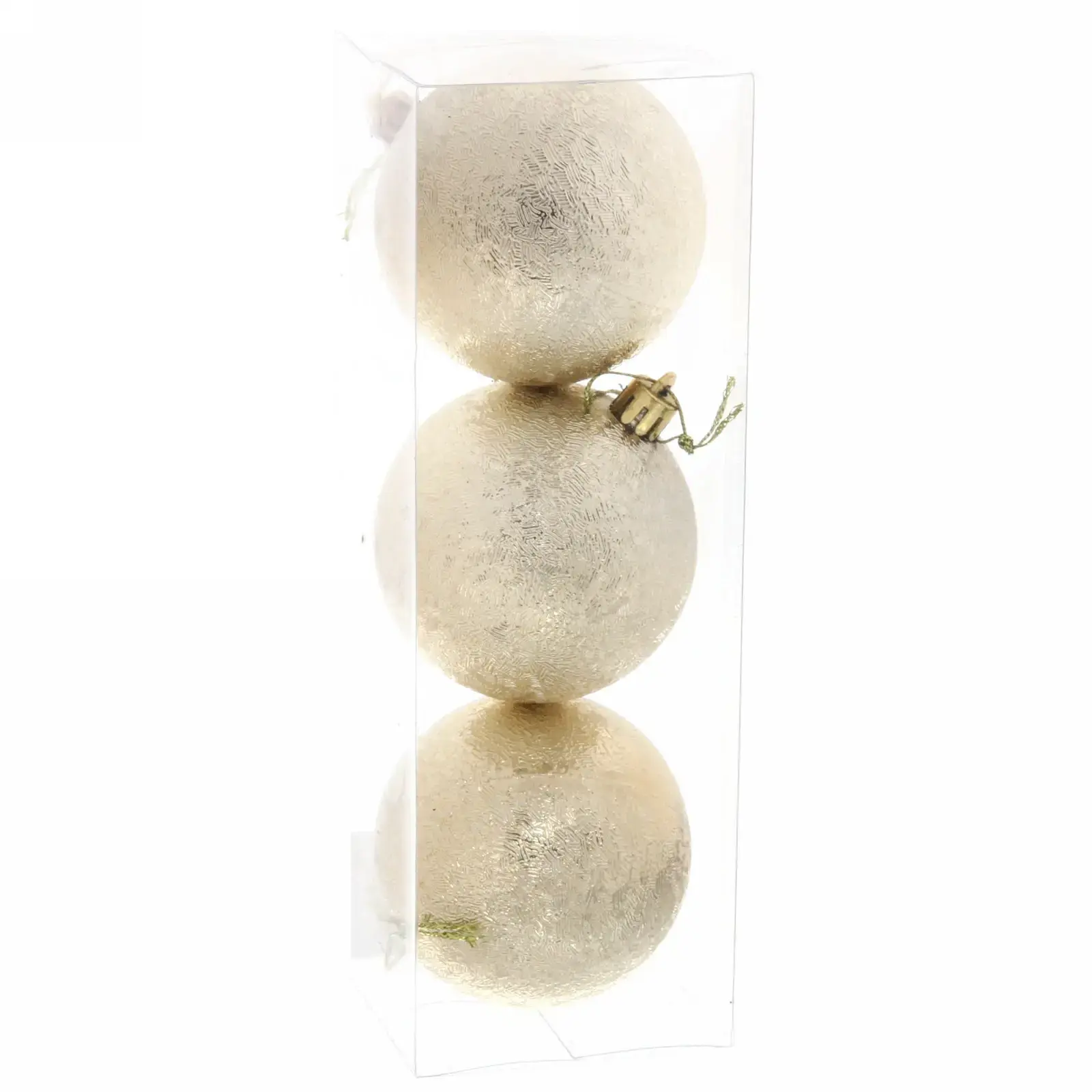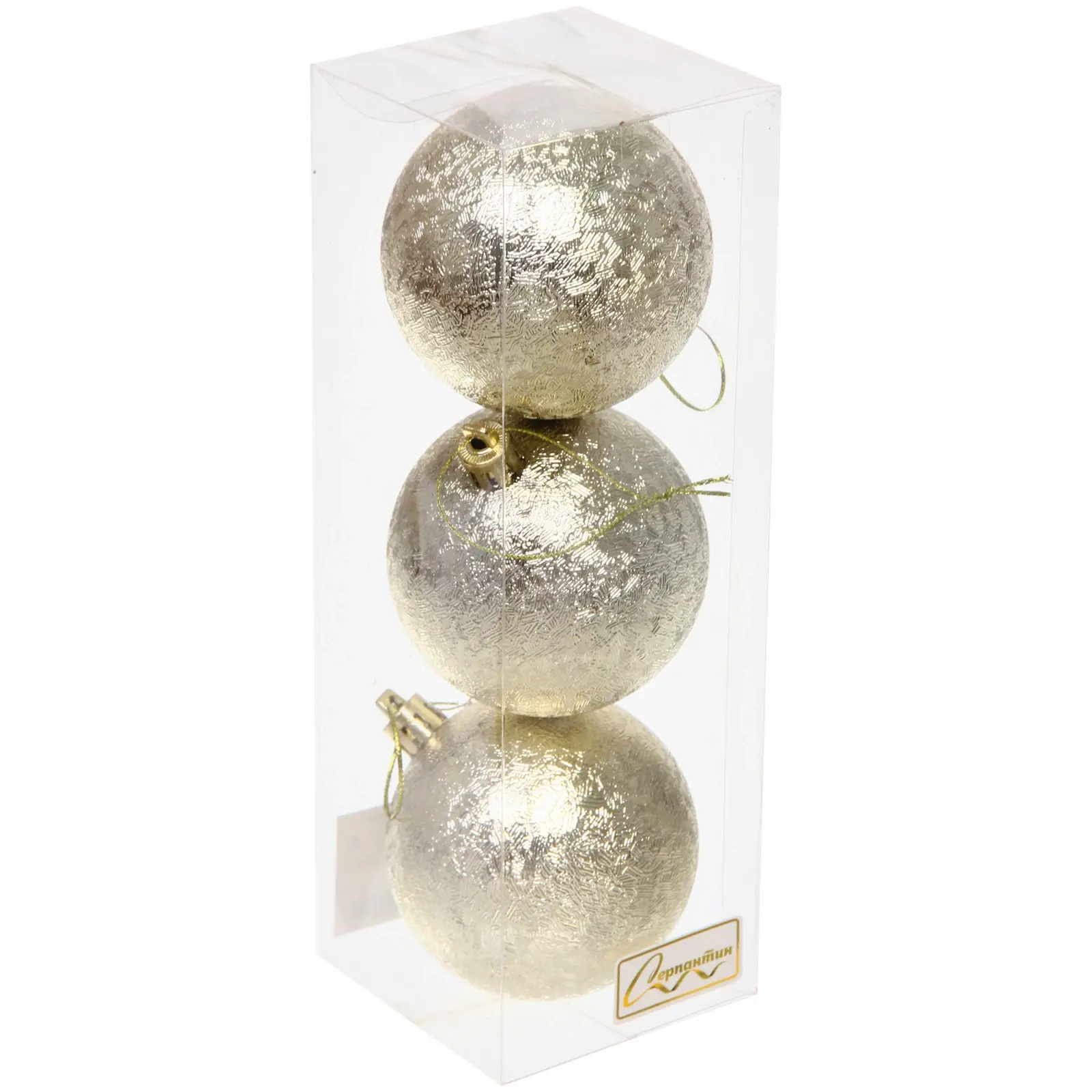 Размер каждого шара – 7 см в диаметре, материал – доброжелательный прочный пластик, цвет – золотой с мягким блеском, металлическое крепление с петлёй для надёжного подвешивания.