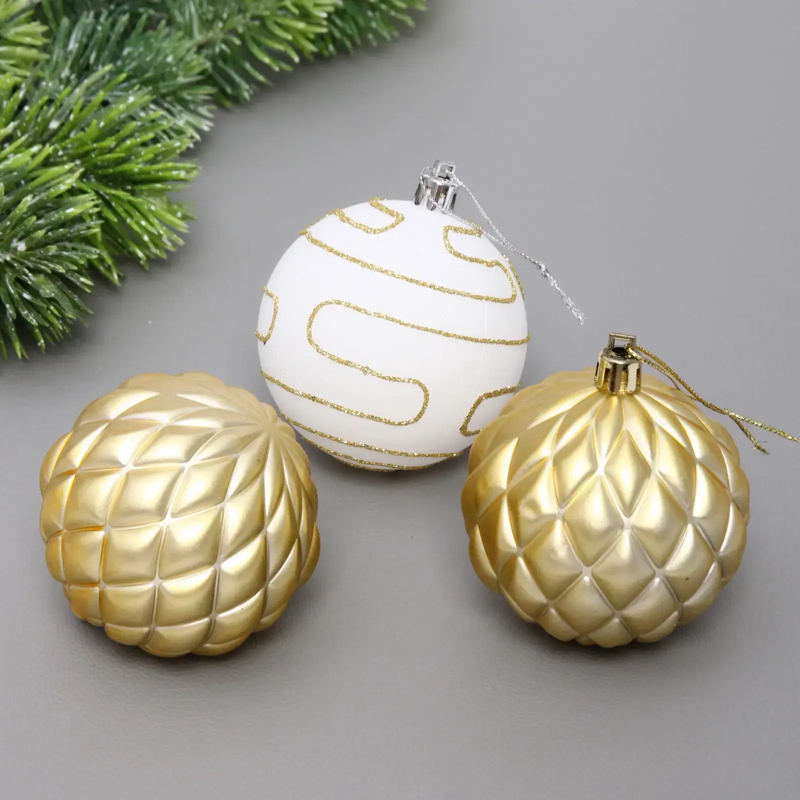 Размер каждого шара составляет 7 см в диаметре, что делает их идеальными для украшения как больших, так и маленьких елок. Белый шар украшен золотыми спиральными узорами, а золотые шары имеют рельефный дизайн, напоминающий текстуру шишек. Эти шары станут отличным дополнением к вашему новогоднему декору и подарят радость вам и вашим близким.