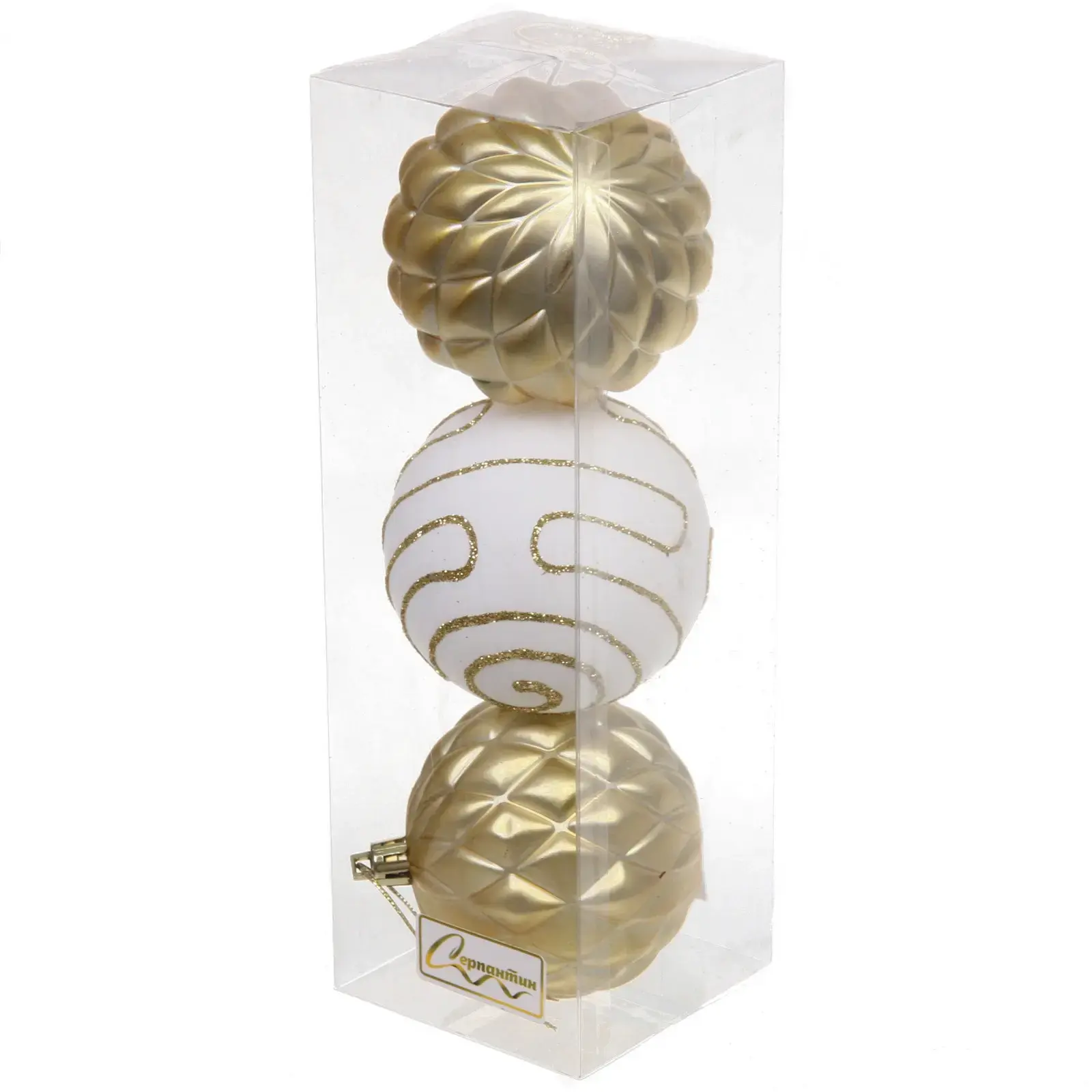 Шары идеально подходят для украшения новогодней ели, а также могут использоваться для декорирования интерьера в праздничные дни. Благодаря своей легкости и прочности, они легко подвешиваются и не требуют особого ухода. Набор состоит из трех шаров: один белый с золотыми узорами и два золотых с рельефной текстурой, что делает его универсальным для любого стиля оформления.