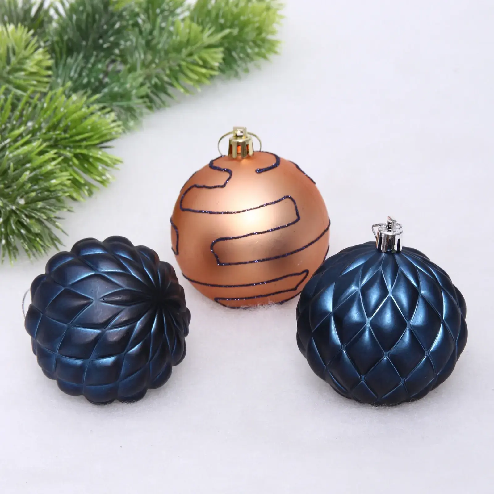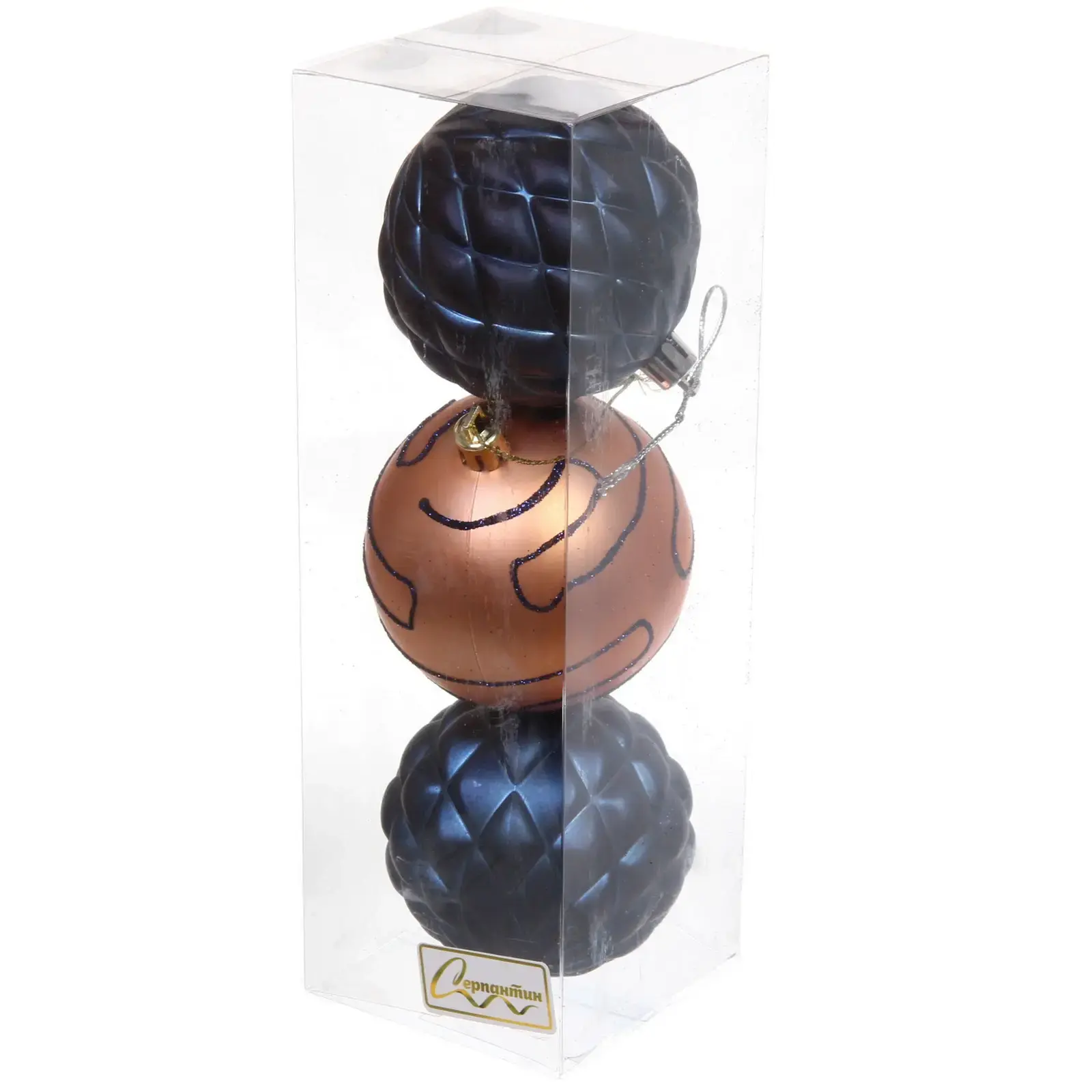 Каждый шар имеет уникальный дизайн: один с рифленой поверхностью, другой с гладкой отделкой и третий с сетчатым рельефом. Размеры шаров составляют 7 см в диаметре, что делает их универсальными для любого типа елки. Упаковка из прозрачного пластика позволяет видеть содержимое и защищает шары от повреждений при хранении.