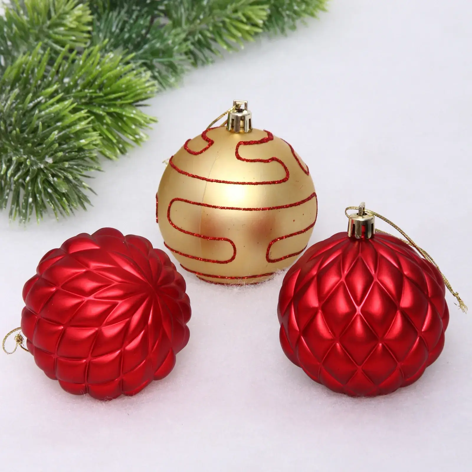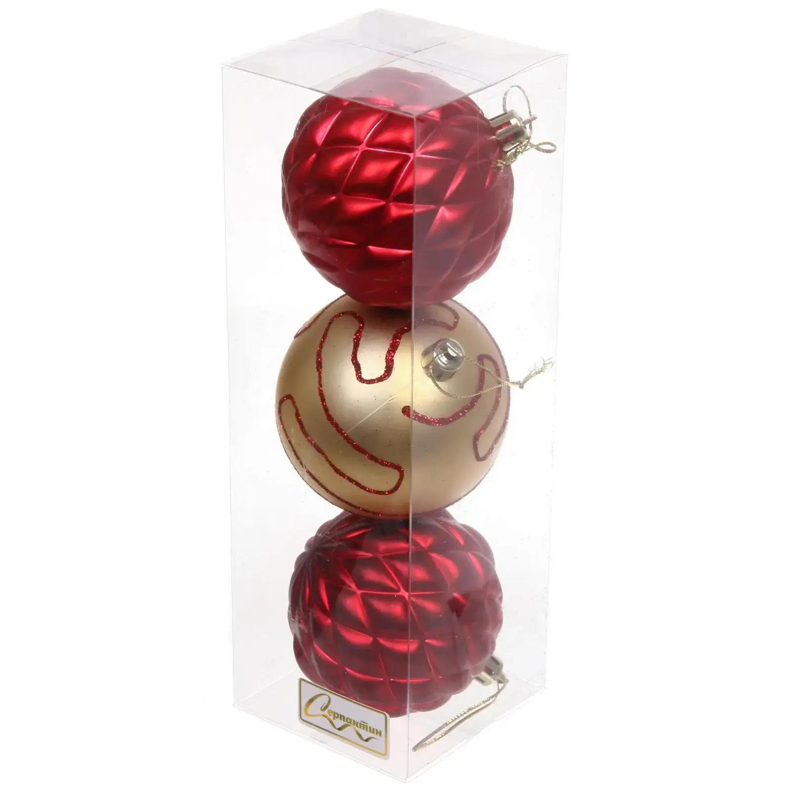 Каждый шар имеет диаметр 7 см и выполнен из качественного пластика, что обеспечивает долговечность и легкость в использовании. Красные шары имеют рельефную поверхность с ромбовидным узором, а золотой шар украшен красной блестящей линией, что придаёт им уникальность. Упакованы шары в прозрачную коробку, что позволяет удобно хранить их после праздников.