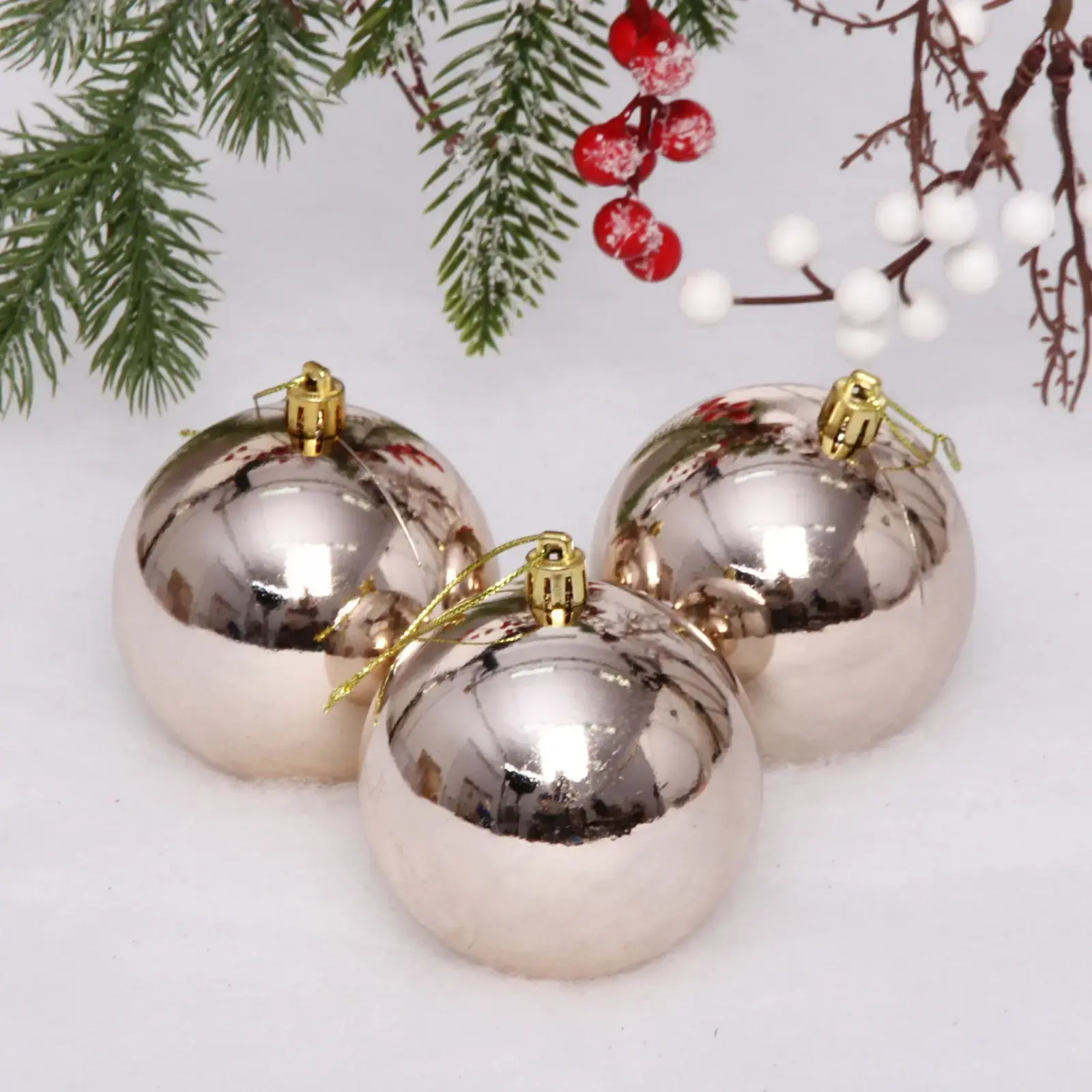 Новогодние шары — это не просто украшения, это символы праздника, которые наполняют ваш дом атмосферой уюта и радости. Набор из трех глянцевых шаров в цвете шампань станет идеальным дополнением к вашей новогодней елке или офисному декору. Эти шары не только красивы, но и практичны, ведь они легко крепятся благодаря удобным петелькам. Подарите себе и своим близким частичку волшебства в этот праздничный сезон!