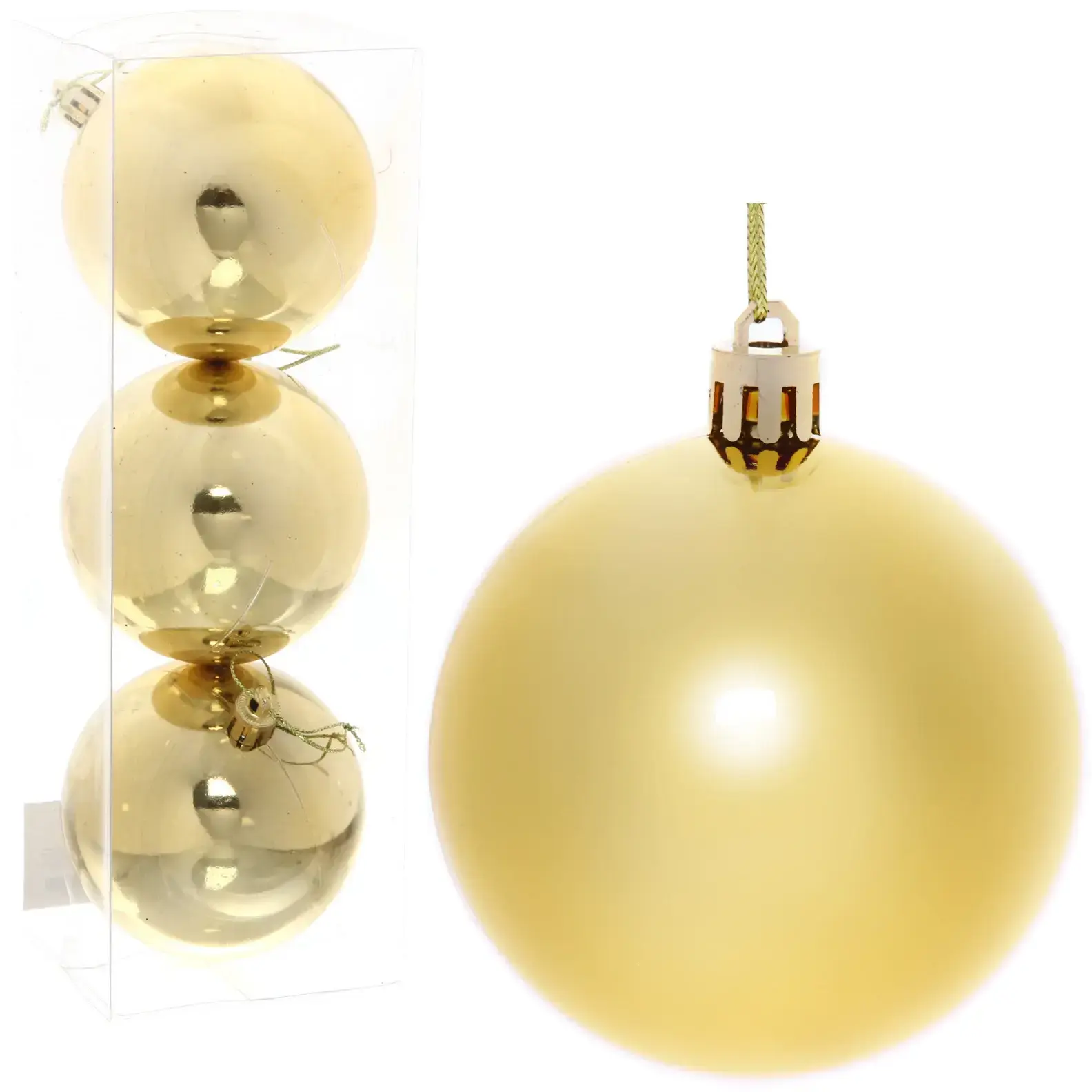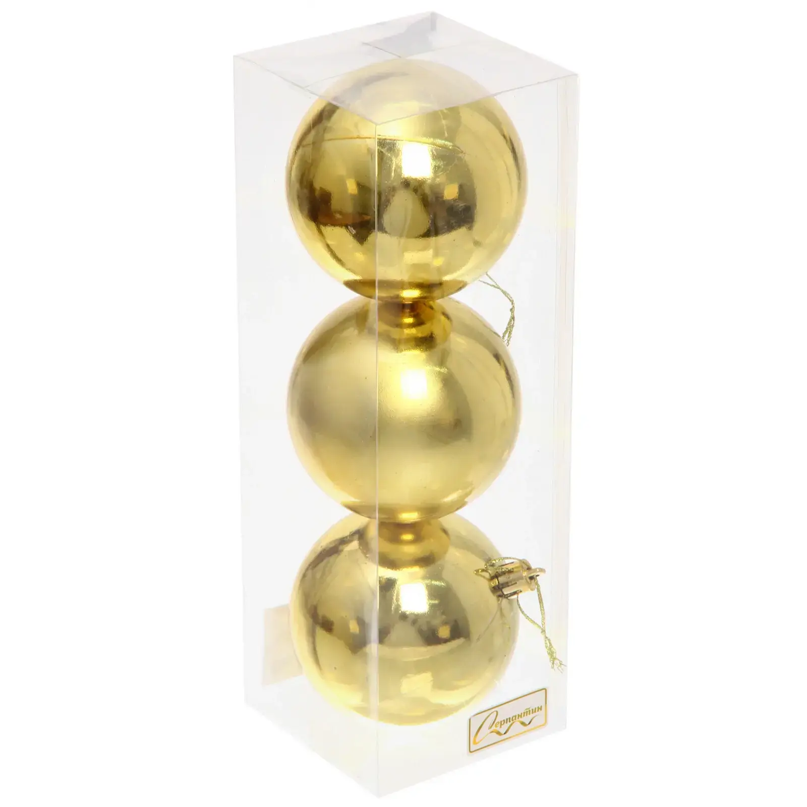 В набор входят три шара, каждый из которых имеет одинаковый размер и форму. Их золотой цвет с глянцевым эффектом добавляет элегантности и стиля. Упаковка выполнена из прозрачного пластика, что позволяет видеть содержимое и делает их отличным подарком. Эти шары станут прекрасным дополнением к вашему новогоднему декору и создадут атмосферу праздника.