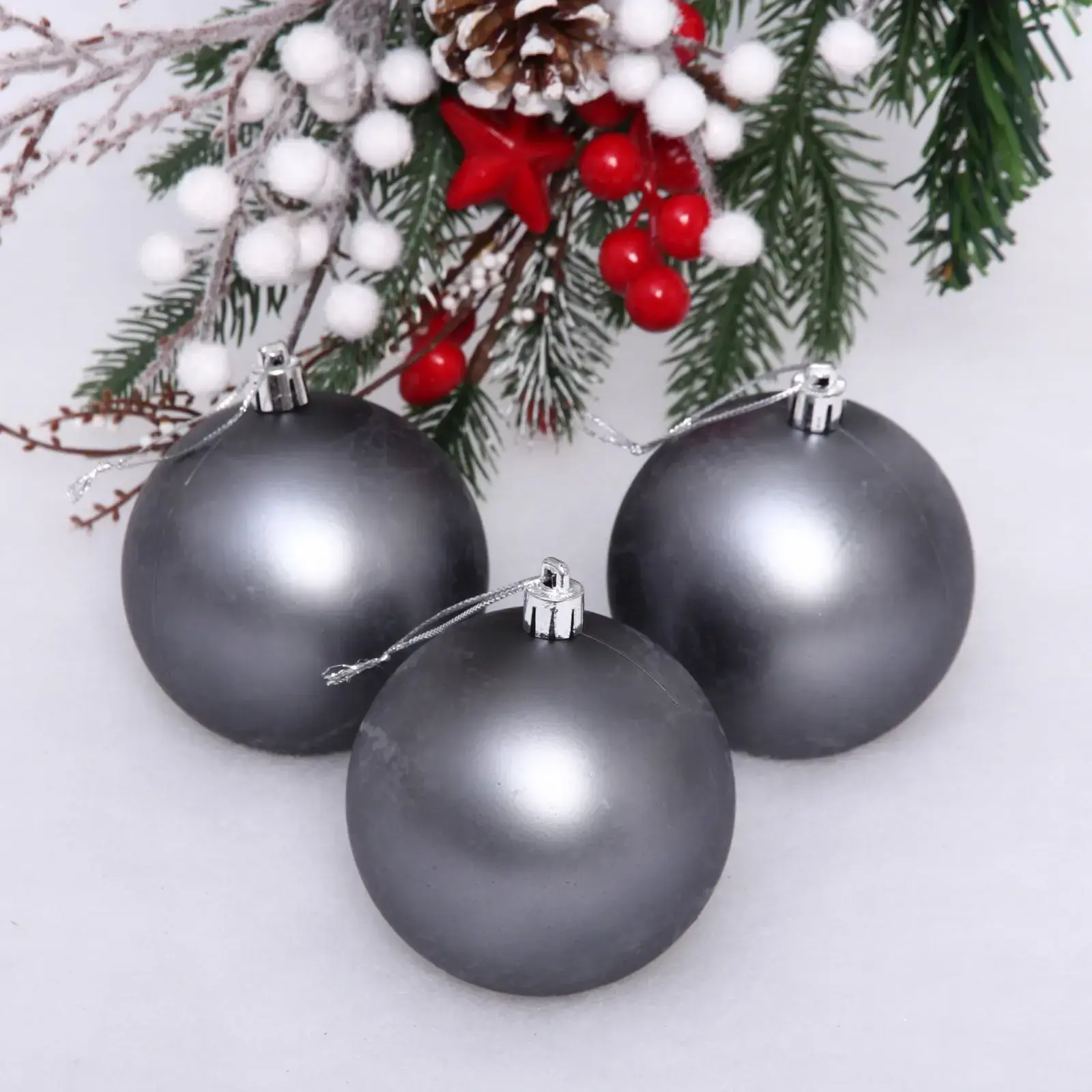 Выбирая наши новогодние шары, вы получаете не только красивое украшение, но и долговечный продукт, который будет радовать вас не один год. Матовая поверхность шаров придает им элегантный вид, а графитовый цвет легко вписывается в любой интерьер. Эти шары не только украсят ваш дом, но и станут отличным подарком для близких и друзей, которые ценят стиль и качество.