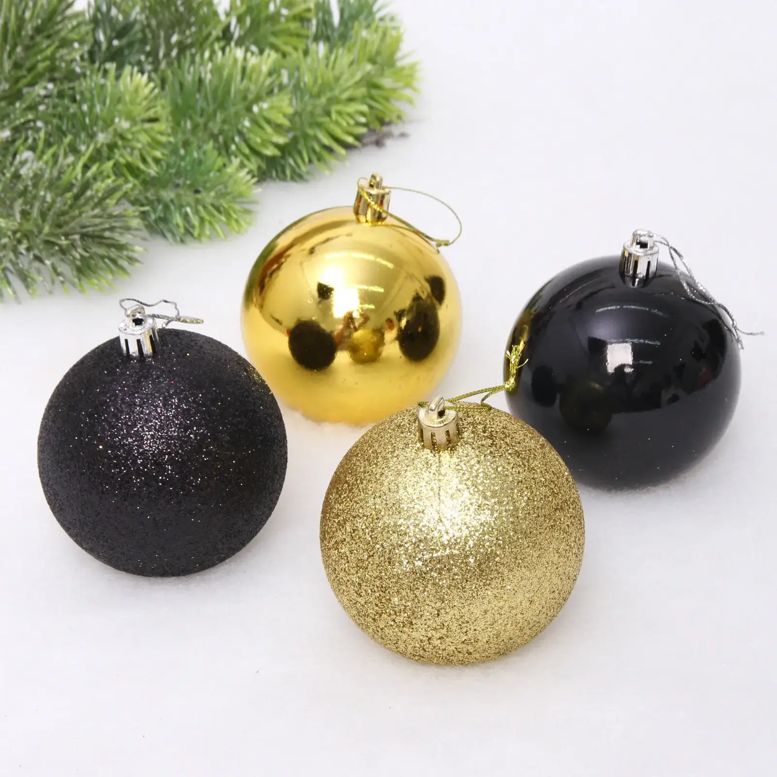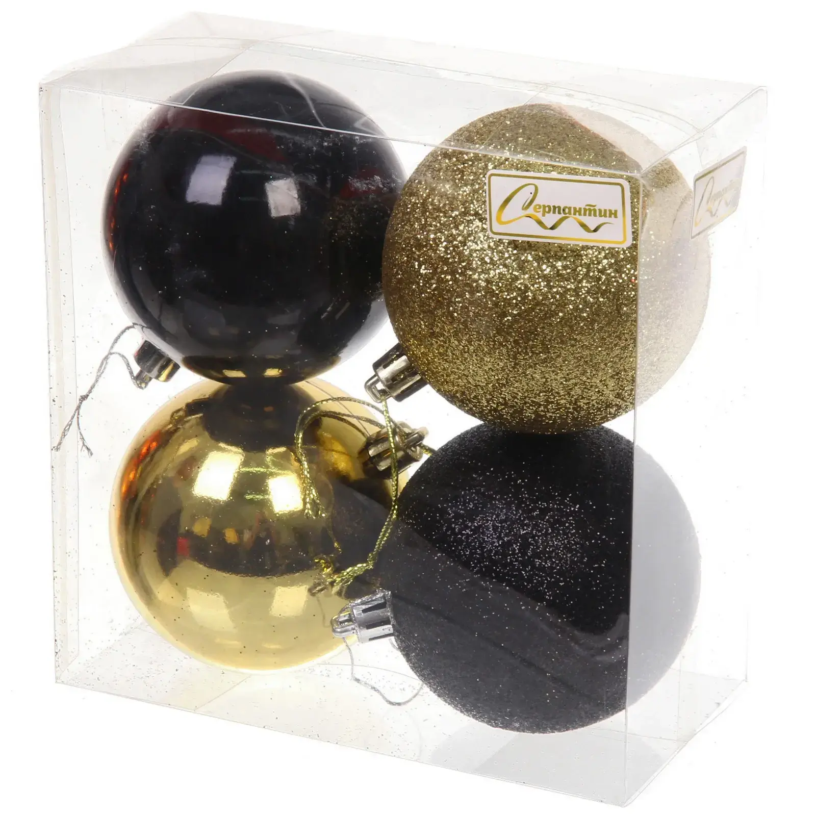 В набор входят четыре шара: два черных, один золотой и один с блестками. Каждый шар имеет стандартный размер 8 см и оснащен креплением для подвешивания. Изготовлены из прочного пластика, они устойчивы к повреждениям и прослужат вам не один праздник.