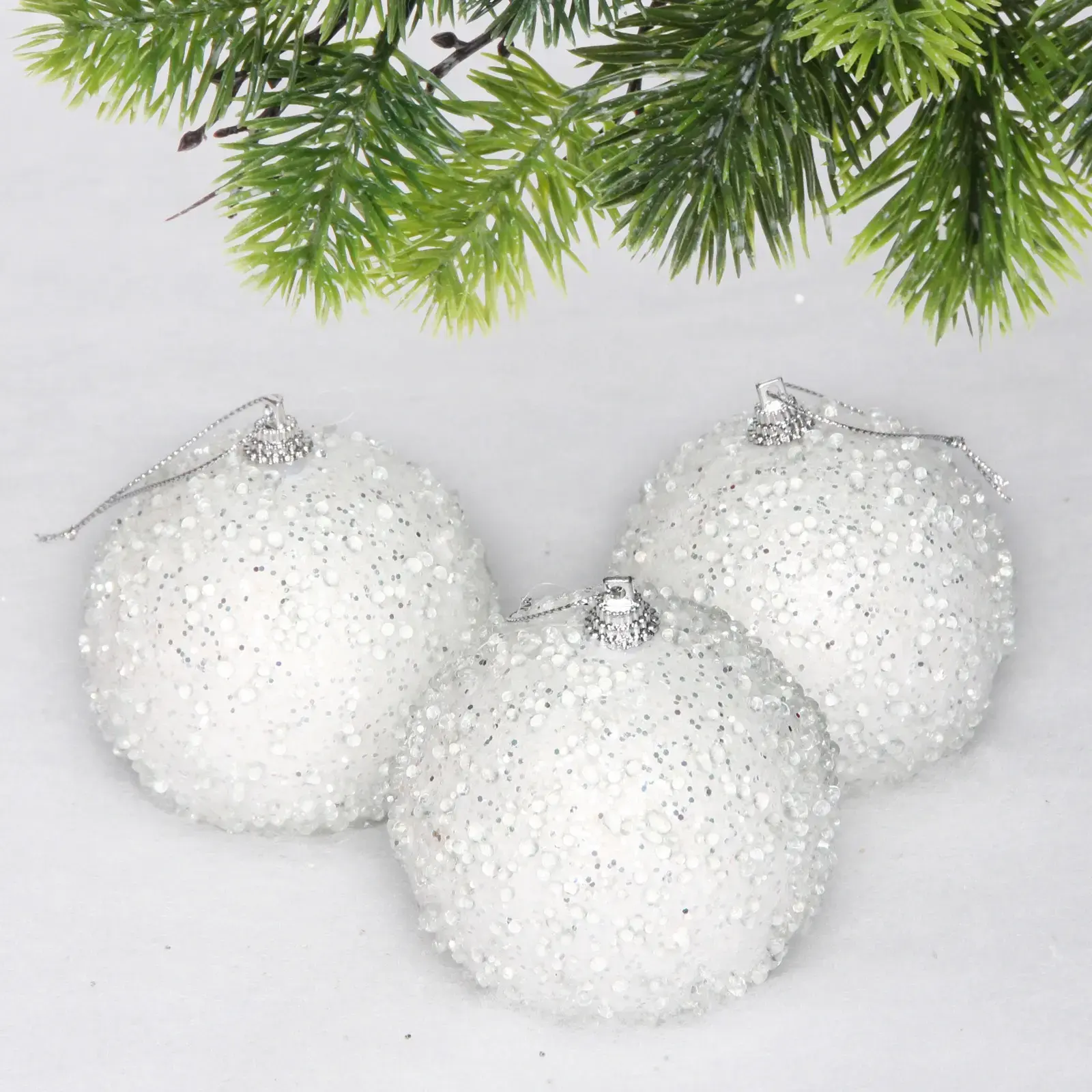 Эти белые новогодние шары добавят изысканности и блеска в ваш праздничный декор. Их уникальный дизайн с мелкими блестками создает эффект сияния, который будет радовать глаз и поднимать настроение в зимние праздники. Шары идеально подходят для украшения елки, гирлянд или создания стильных композиций на столе.