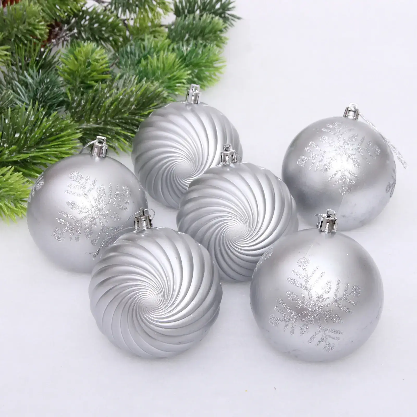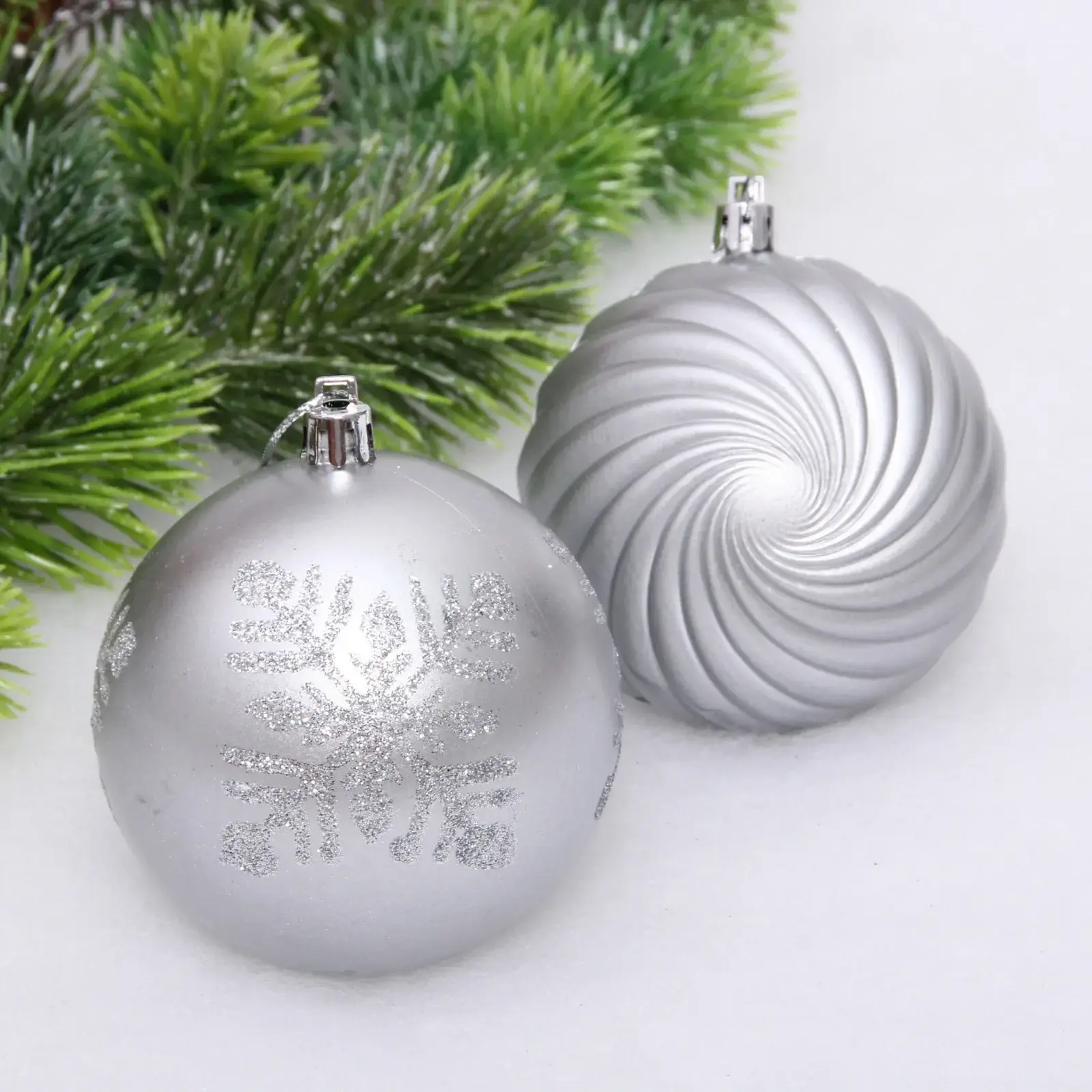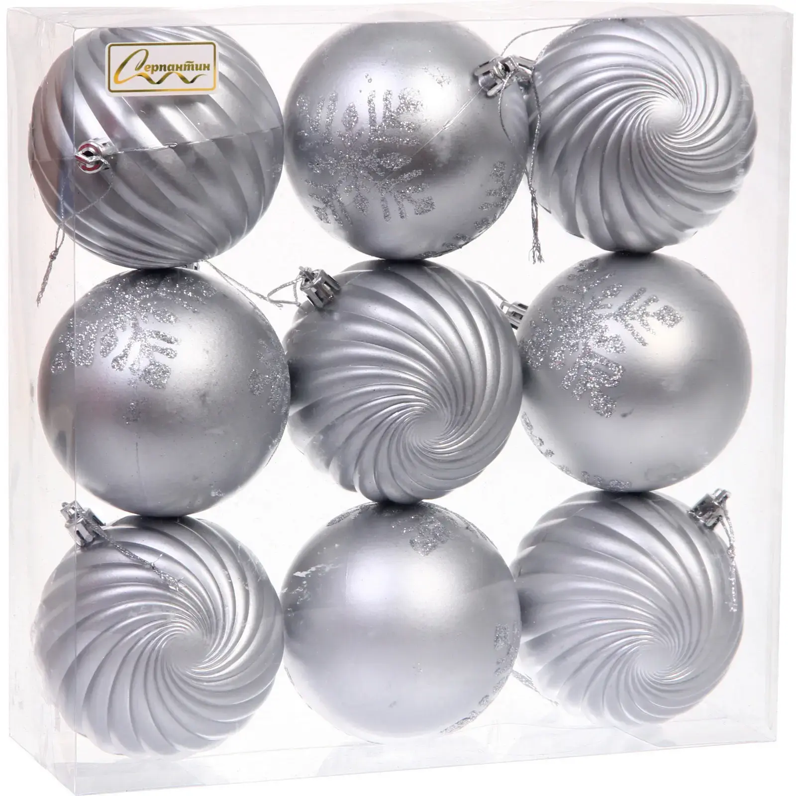 Серебристая гамма сочетается с любыми цветовыми решениями интерьера и традиционной новогодней палитрой. Разнообразие текстур и узоров создает эффект движения и глубины, а блестящее покрытие усиливает светоотражение от гирлянд. Набор упакован в прозрачную презентабельную коробку — готовое решение для подарка.
