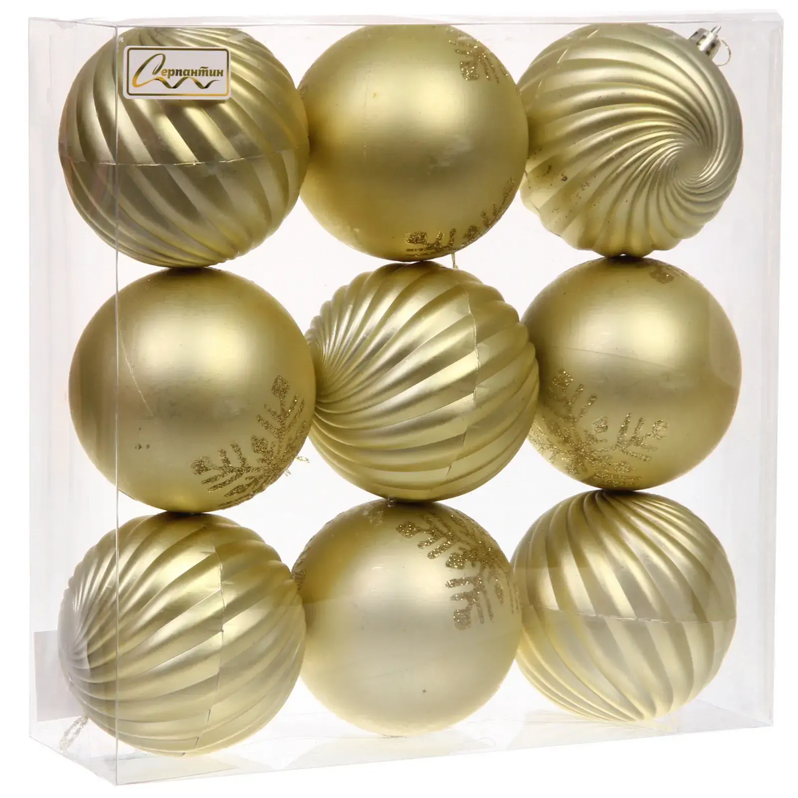 Набор из 9 шаров позволяет создать сбалансированную композицию без необходимости докупки дополнительных украшений. Золотистый оттенок гармонично сочетается с классическими зелёными ветвями и современными декоративными решениями.