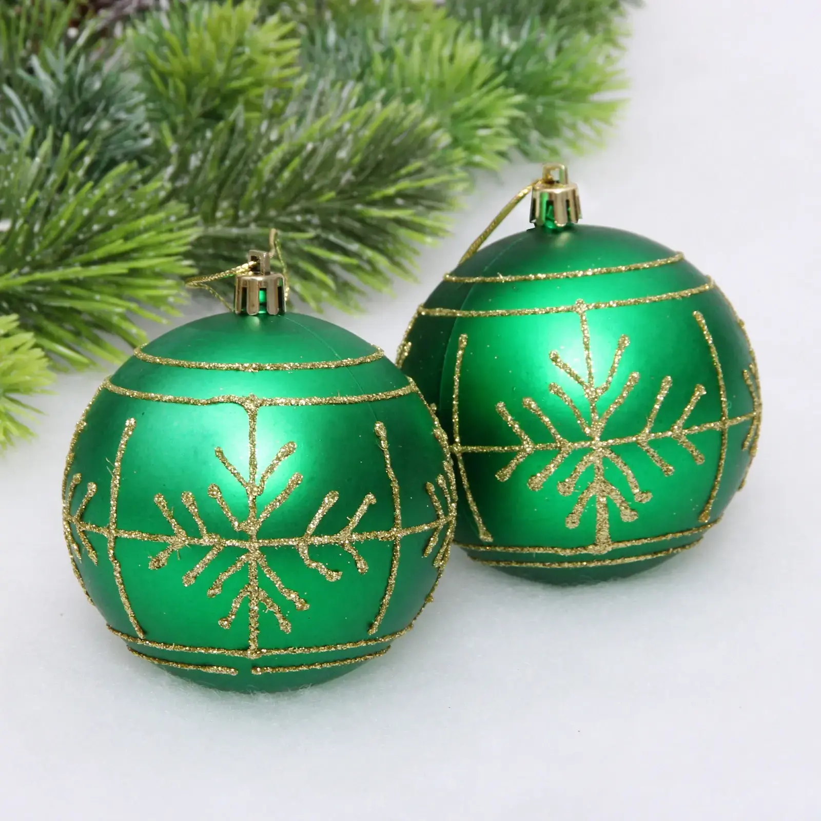 Погрузитесь в атмосферу праздника с новогодними шарами «Сияние». Эти ярко-зеленые шары диаметром 8 см с матовой поверхностью и золотистыми узорами в виде снежинок и линий добавят изысканности и уюта в ваше новогоднее оформление. Они идеально подойдут для украшения елки, создавая атмосферу тепла и радости в вашем доме.