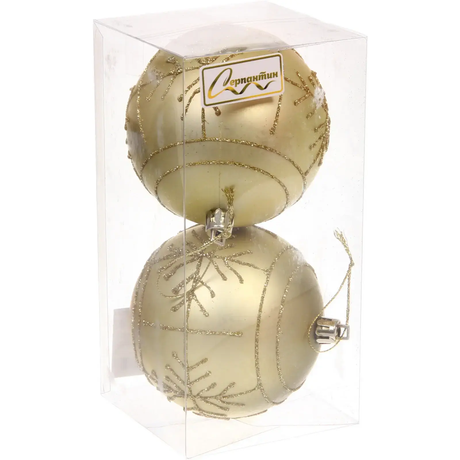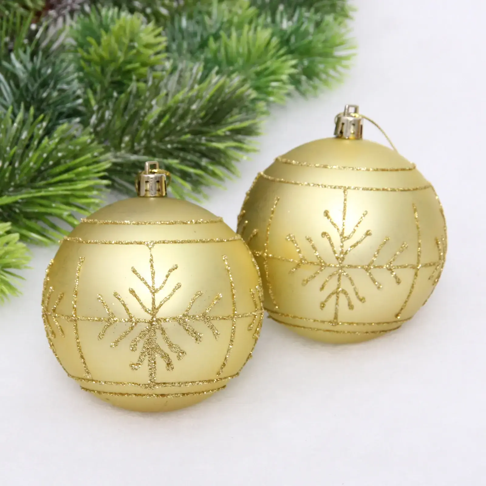 Создайте атмосферу волшебства с набором из двух золотых шаров «Сияние». Матовые поверхности с изящными блестящими снежинками добавят элегантности вашей ёлке или интерьеру.