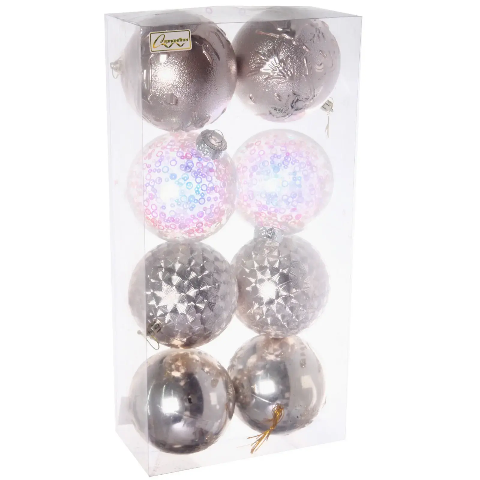 Диаметр каждого шара - 10 см. В наборе 8 штук, упакованных в удобный прозрачный контейнер, который защищает игрушки при хранении и транспортировке.