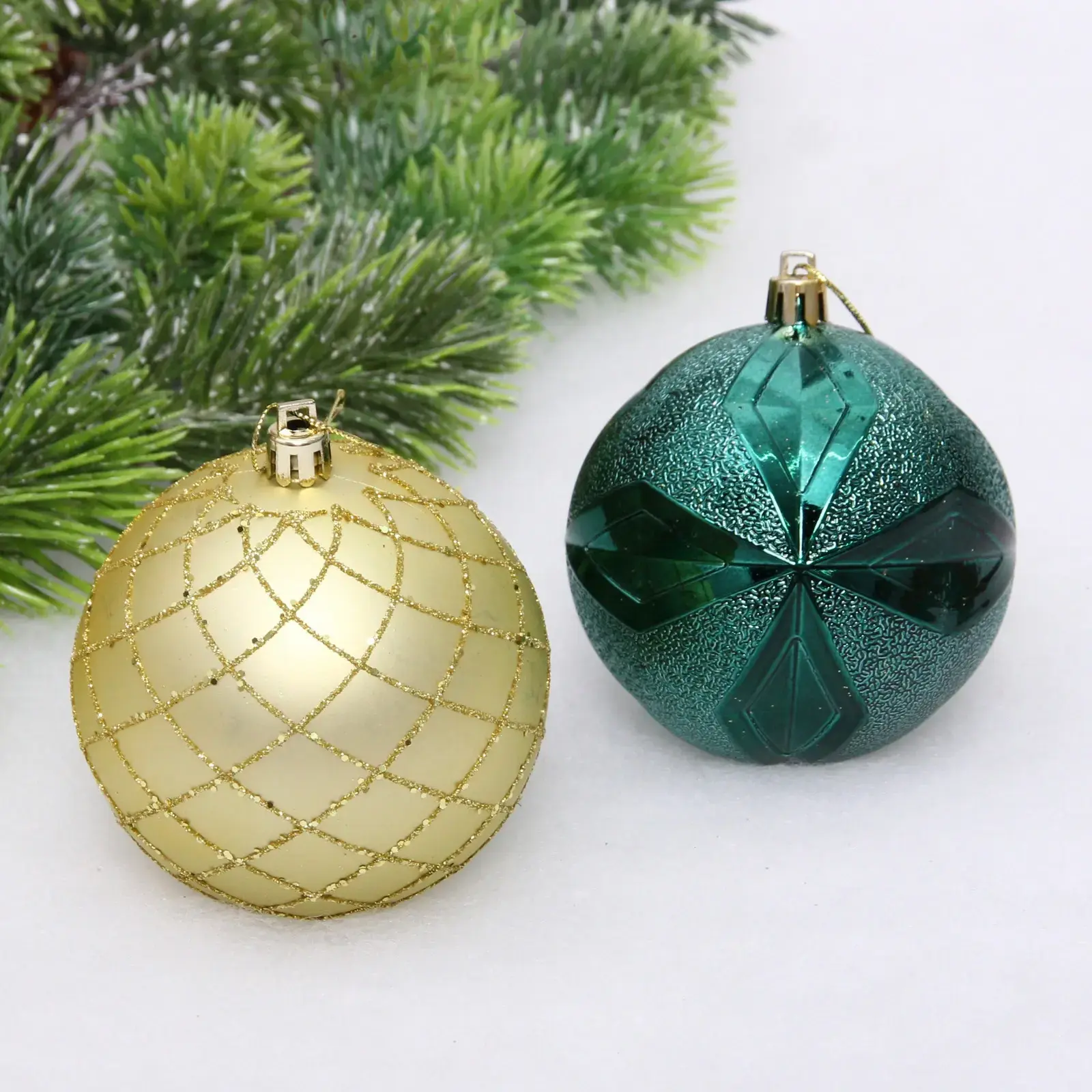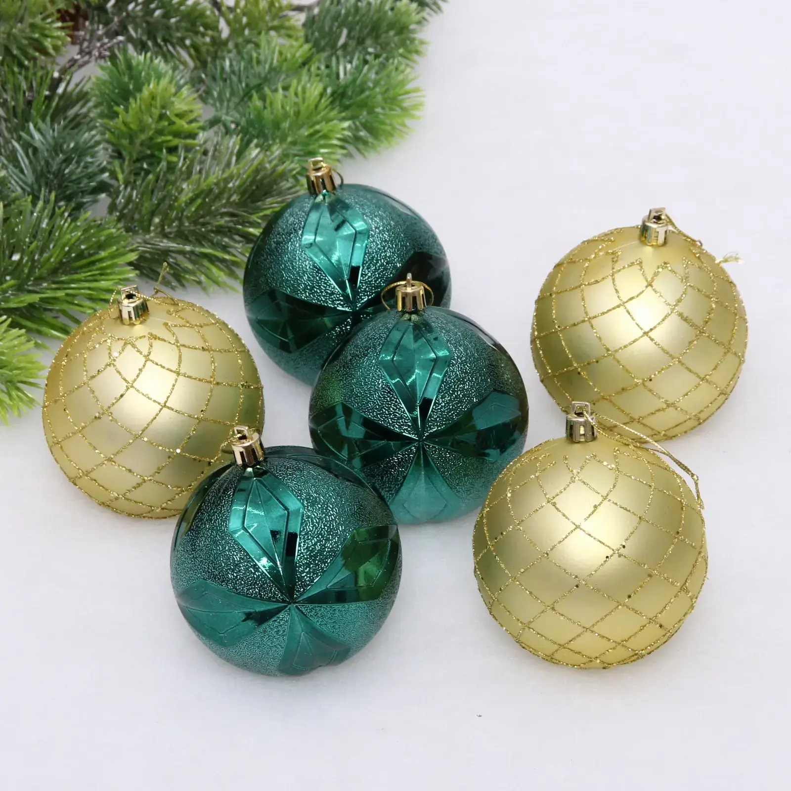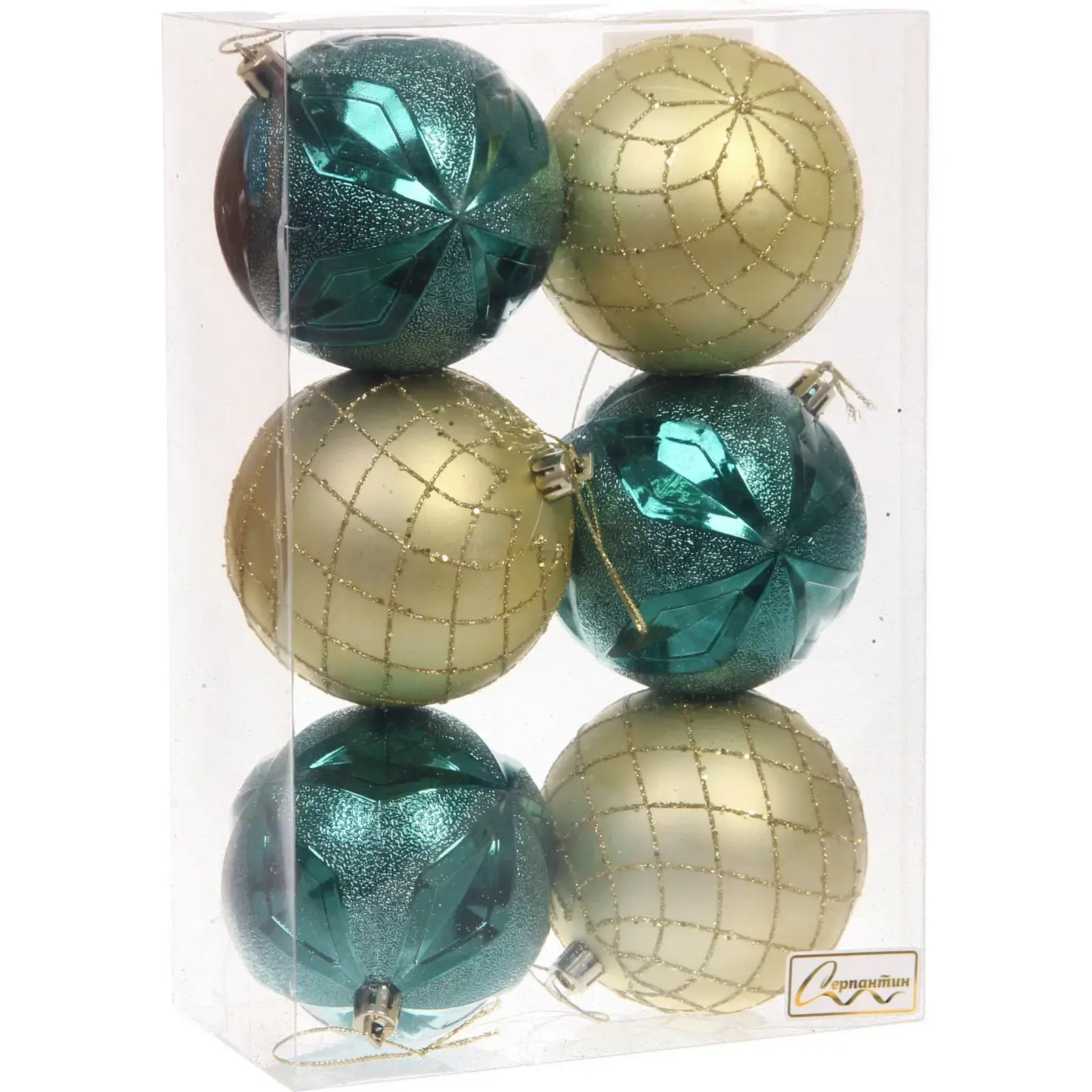 Шары имеют стандартный размер 8 см и представлены в двух цветах: три изумрудных и три золотых. Каждый шар украшен уникальным дизайном, который включает геометрические узоры и блестящие акценты. Упаковка из прозрачного пластика позволяет удобно хранить шары, защищая их от повреждений.