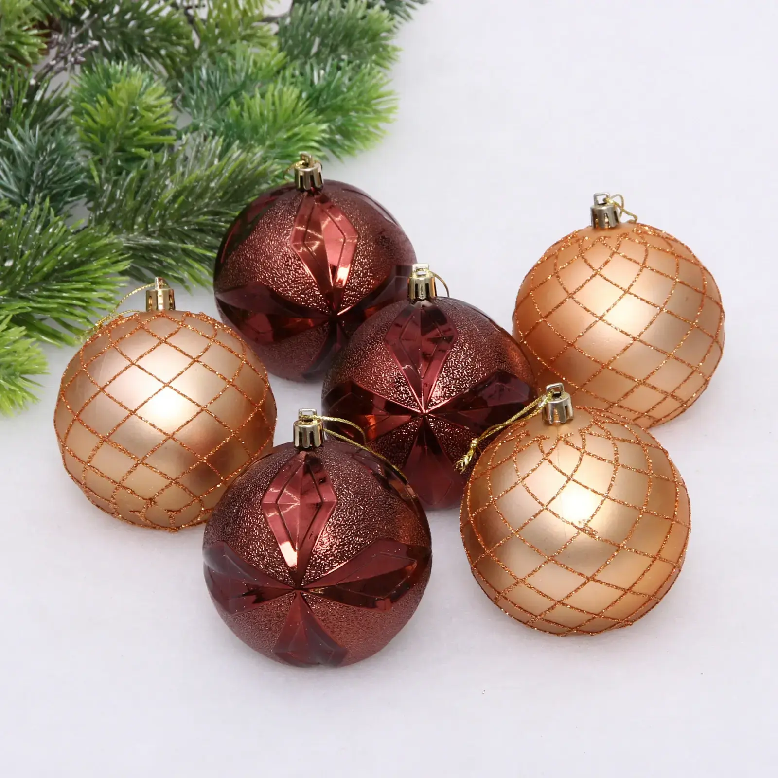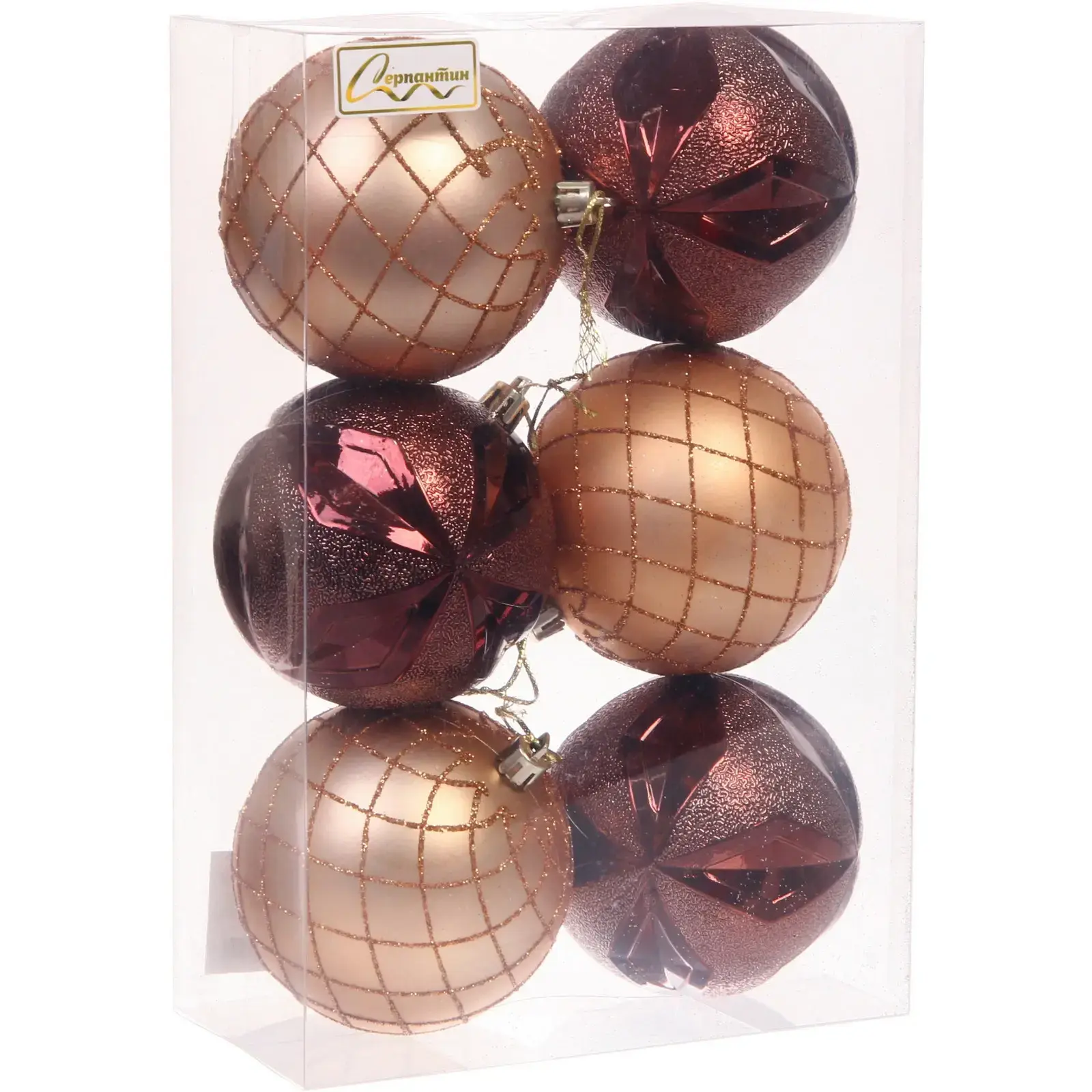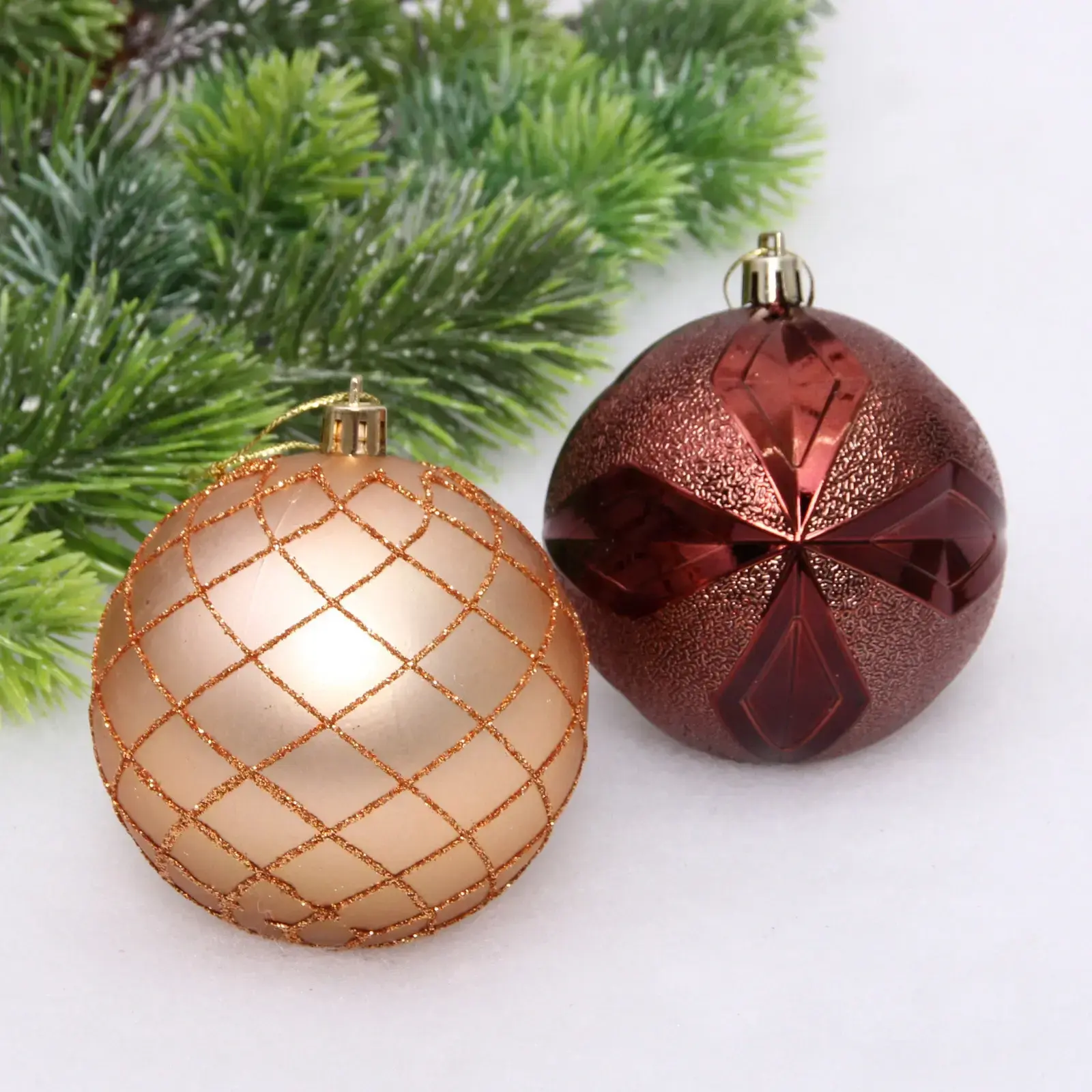 Эти новогодние шары станут идеальным украшением для вашей ёлки, добавляя в интерьер уют и праздничное настроение. Набор из шести шаров диаметром 8 см выполнен в элегантных шоколадных и шампань оттенках, что позволяет легко сочетать их с другими элементами декора. Каждый шар имеет уникальный дизайн: два шара с рельефными узорами и четыре с сетчатым декором, что придаёт им особую изысканность.