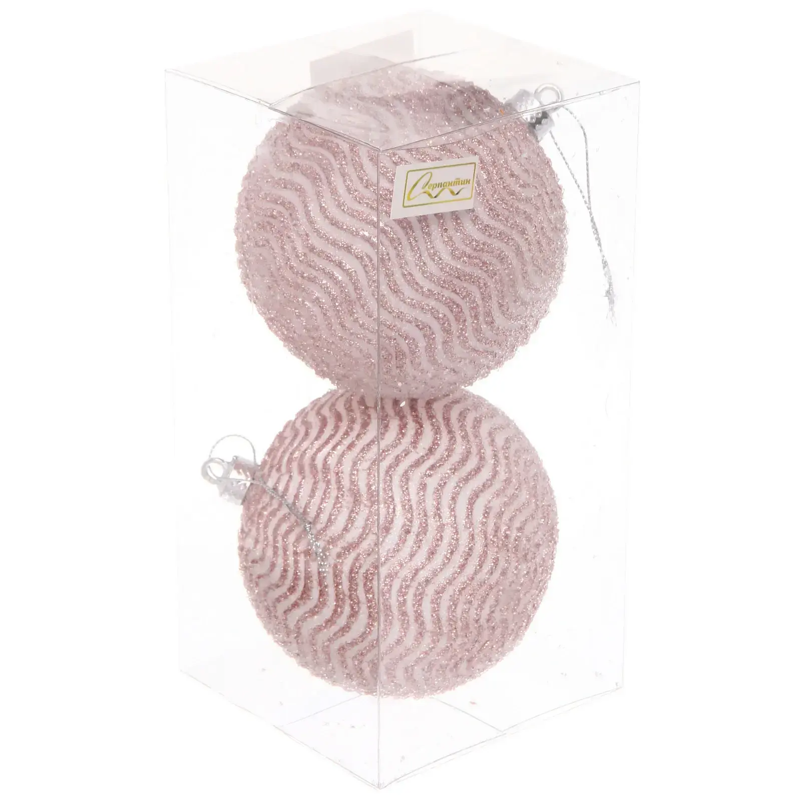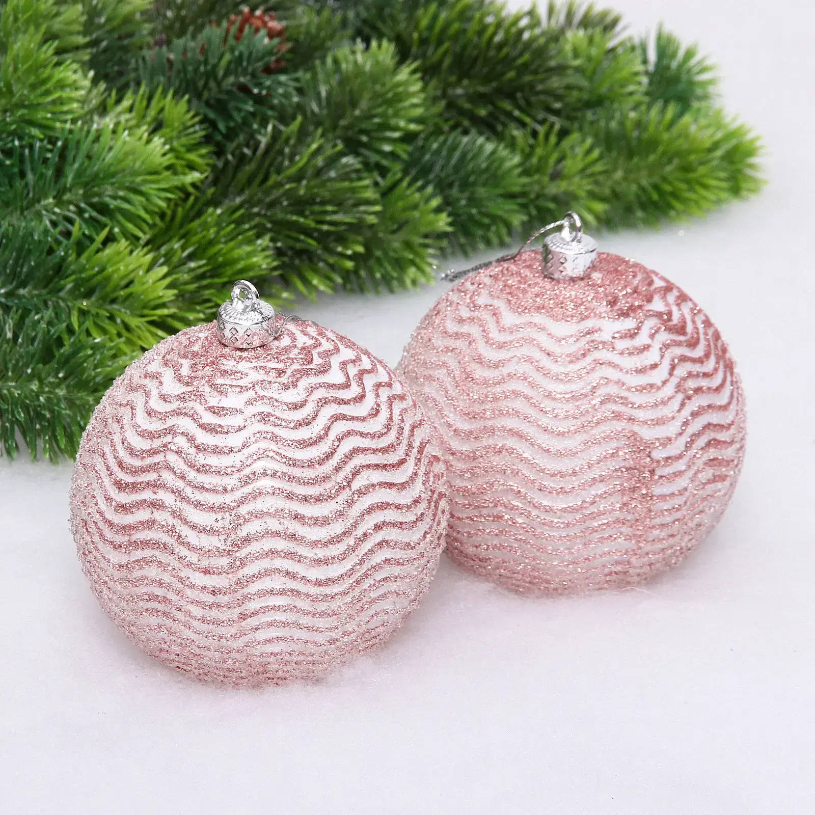 Создайте волшебную атмосферу с двумя мерцающими шарами в нежном розовом оттенке. Фактурный узор с блёстками переливается при свете гирлянд, превращая ёлку в главное украшение интерьера.