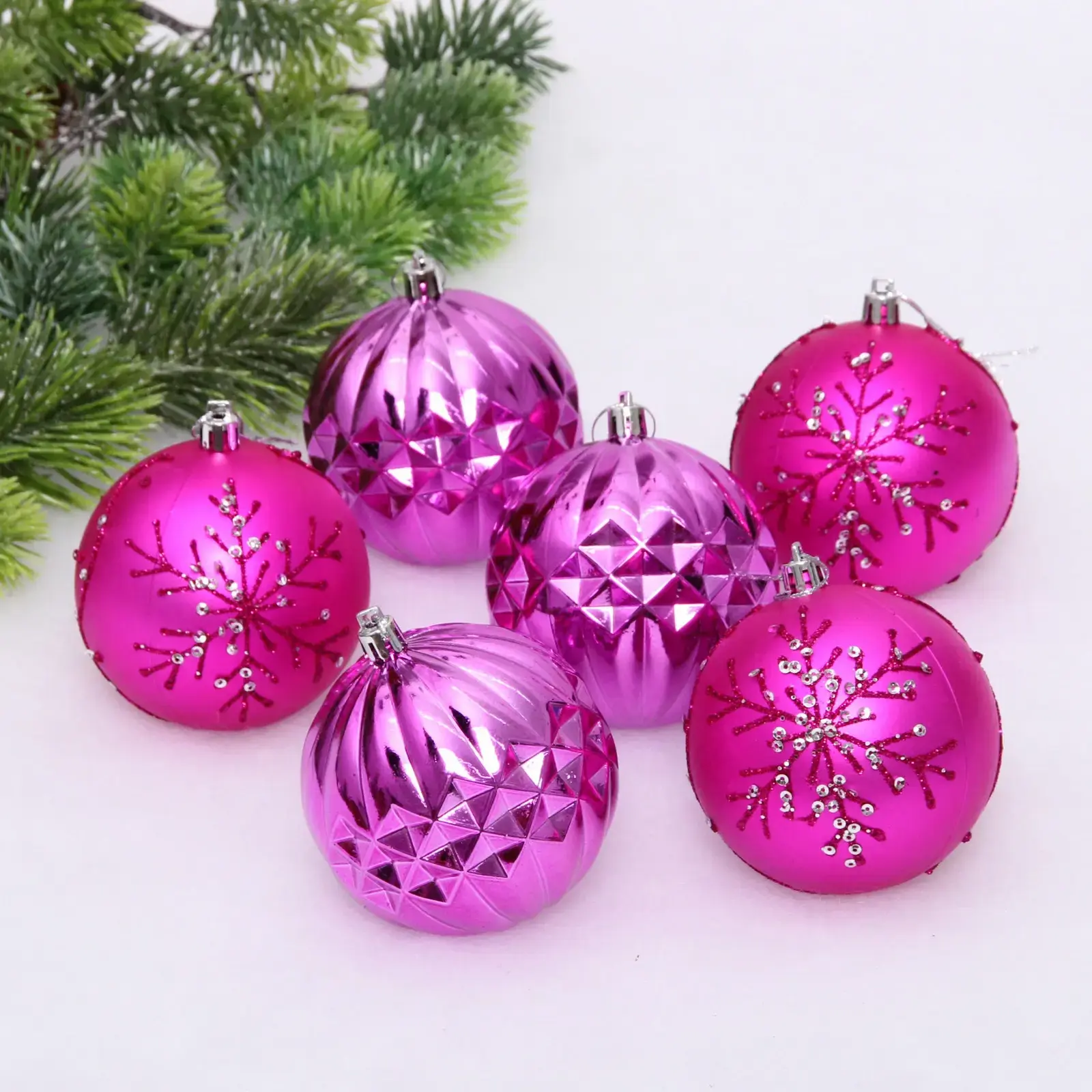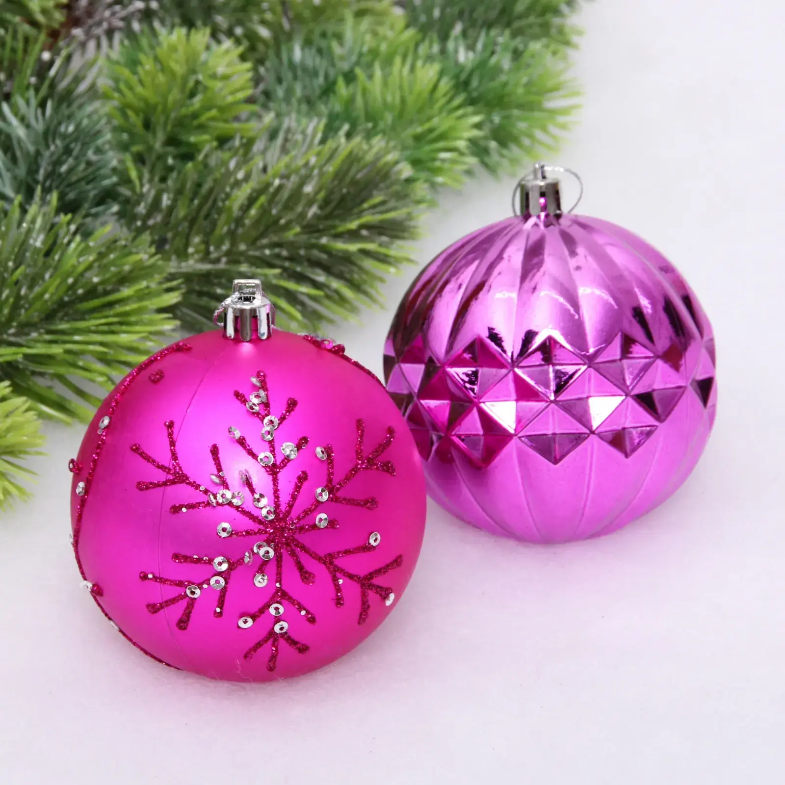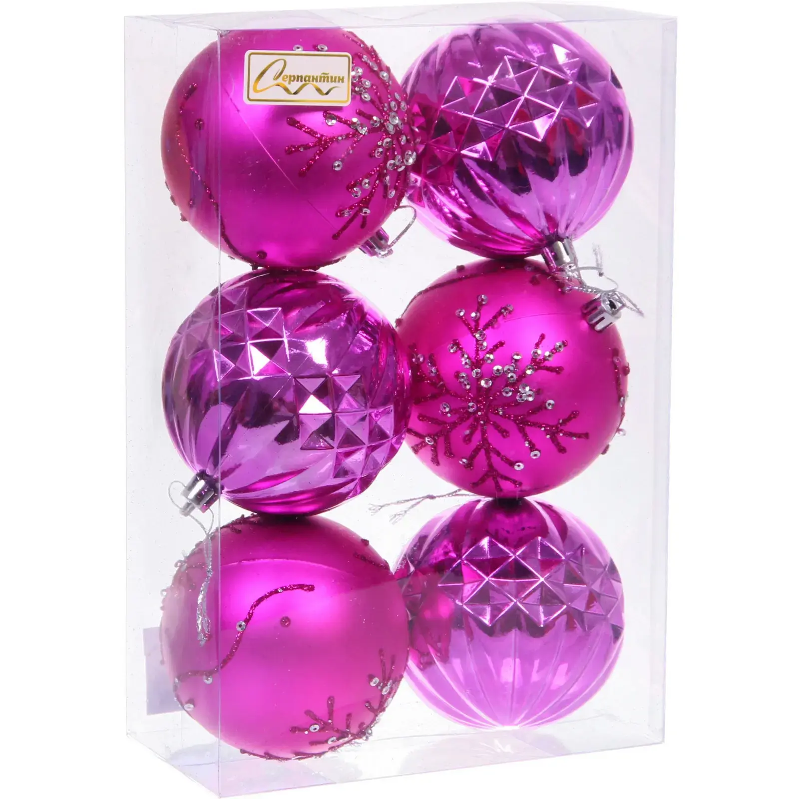 Новогодние шары «Волшебный бал» — это идеальный выбор для тех, кто хочет добавить яркие акценты в праздничный декор. Эти шары диаметром 8 см выполнены в фиолетовом и фуксиевом цветах, что придаст вашей елке уникальный и стильный вид. Каждый шарик украшен различными текстурами и узорами, включая снежинки и блестки, что делает их не только красивыми, но и интересными для глаз.