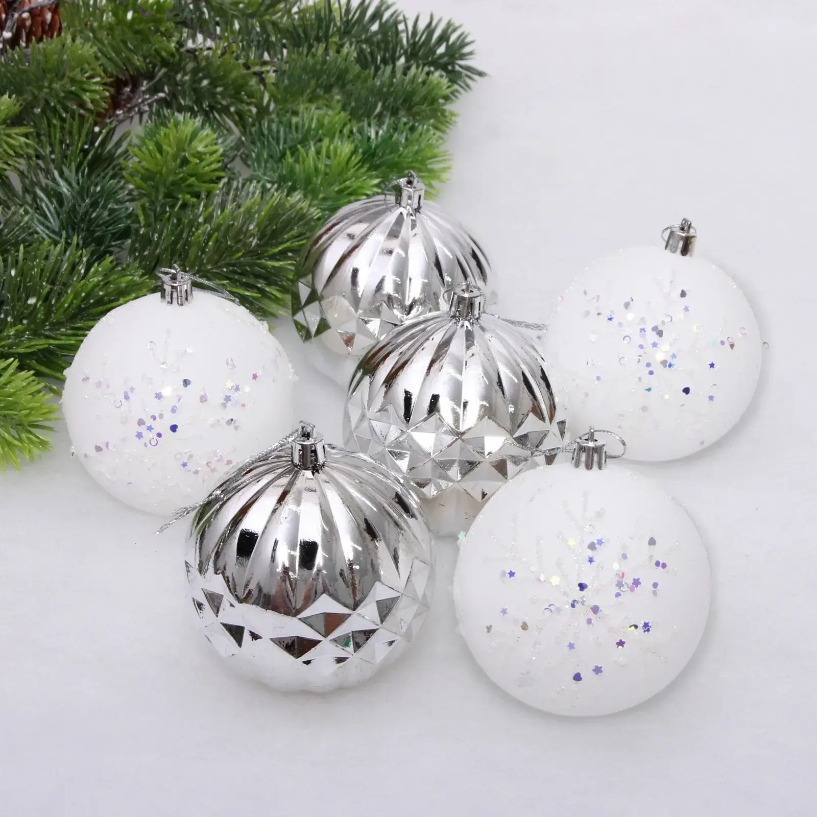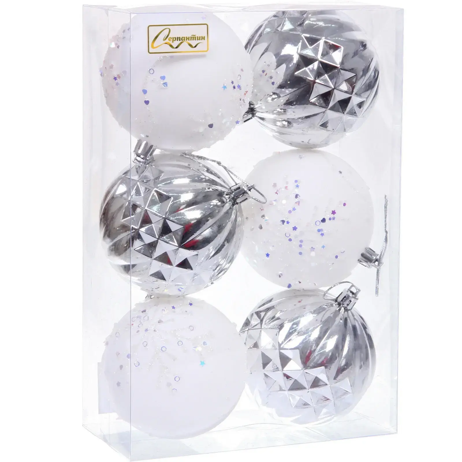 Размер каждого шара составляет 8 см, что делает их универсальными для елок любого размера. В наборе представлены три шара серебристого цвета и три белых, гарантируя гармоничное сочетание оттенков.