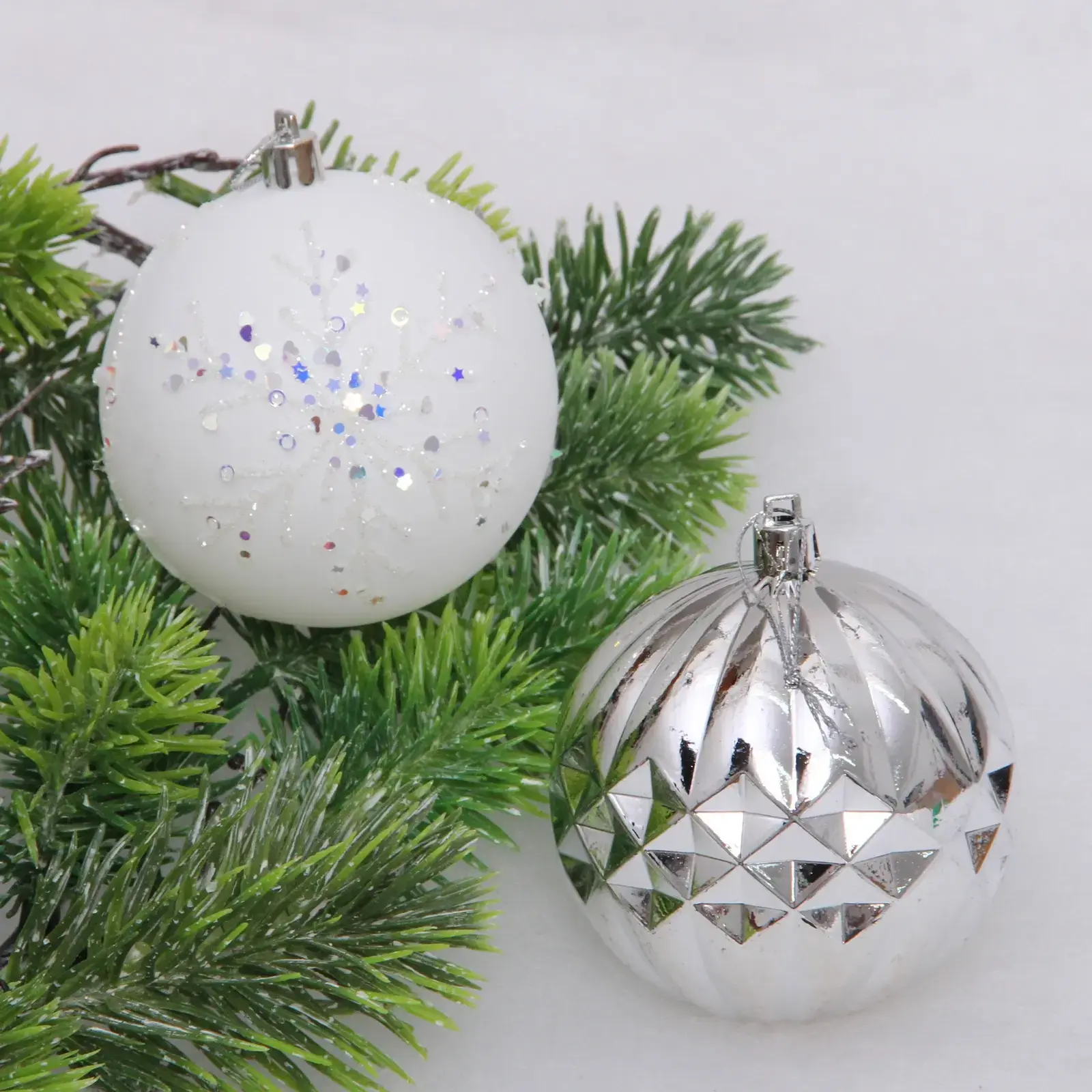 Каждый шар из набора имеет особую текстуру: серебристые шары с гофрированной поверхностью переливаются при свете, а белые украшены изящными узорами и блестками. Металлические петли обеспечивают надежное крепление на ветках.