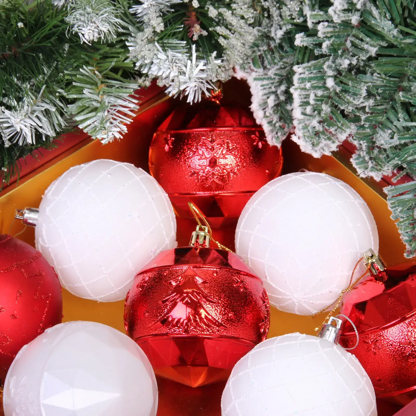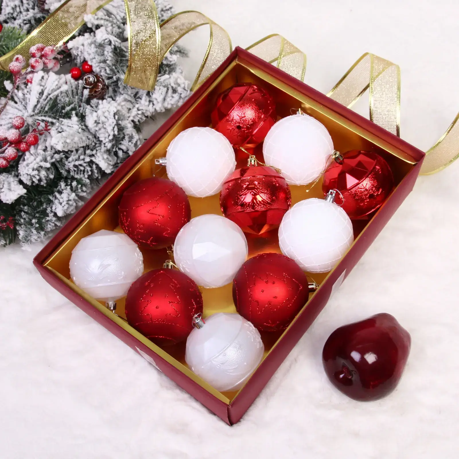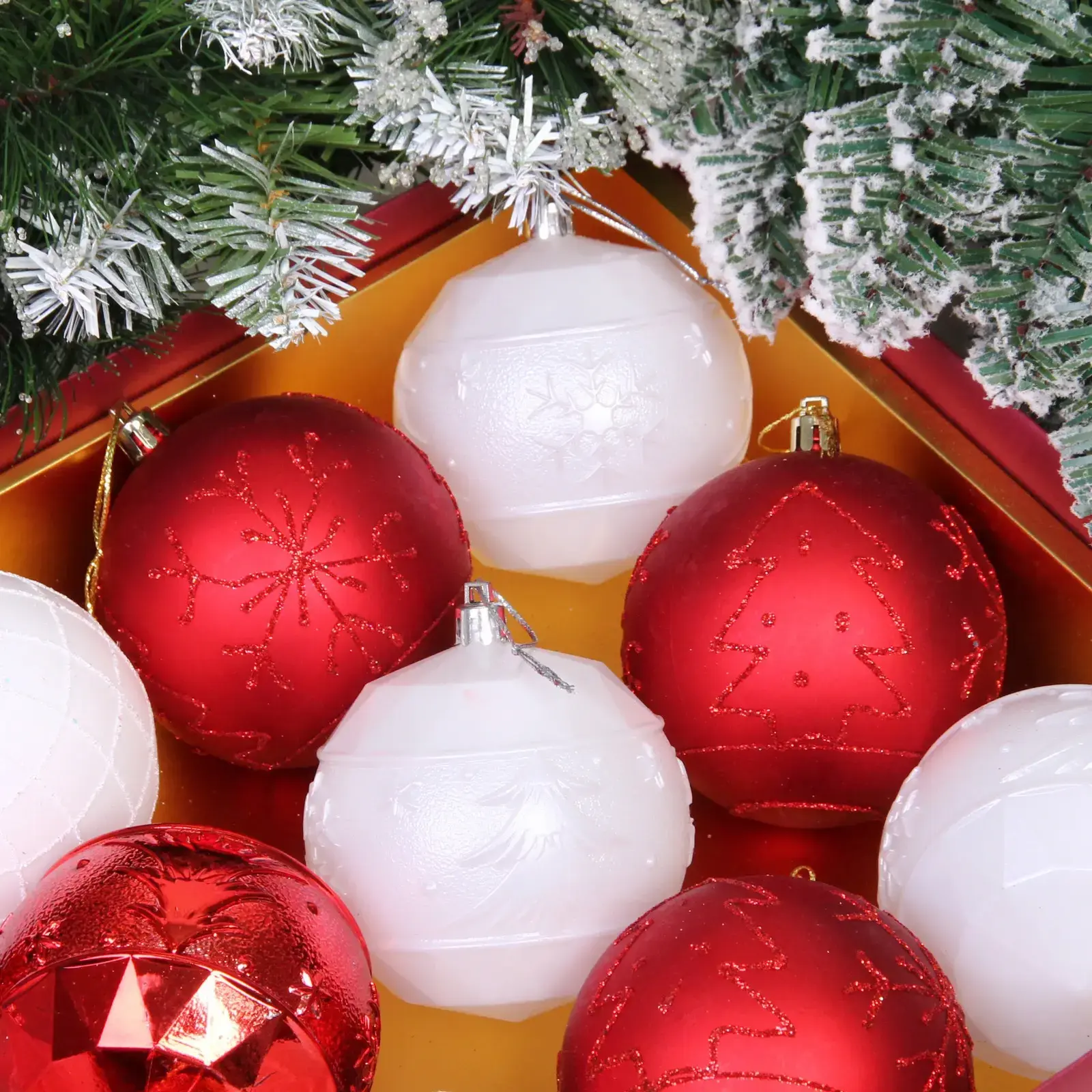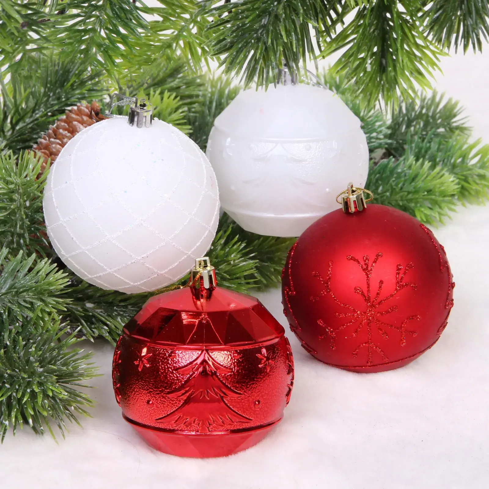 Шары диаметром 8 см выполнены из прочного пластика и представлены в двух цветовых решениях: классический красный и благородный белый. Разнообразие фактур – от гладкой до рельефной с узорами – позволяет создать гармоничную композицию на вашей ёлке.