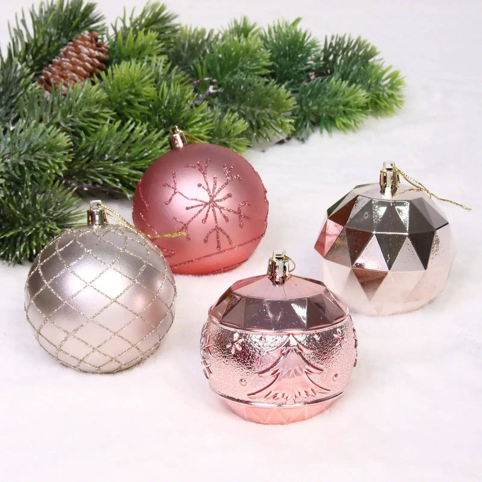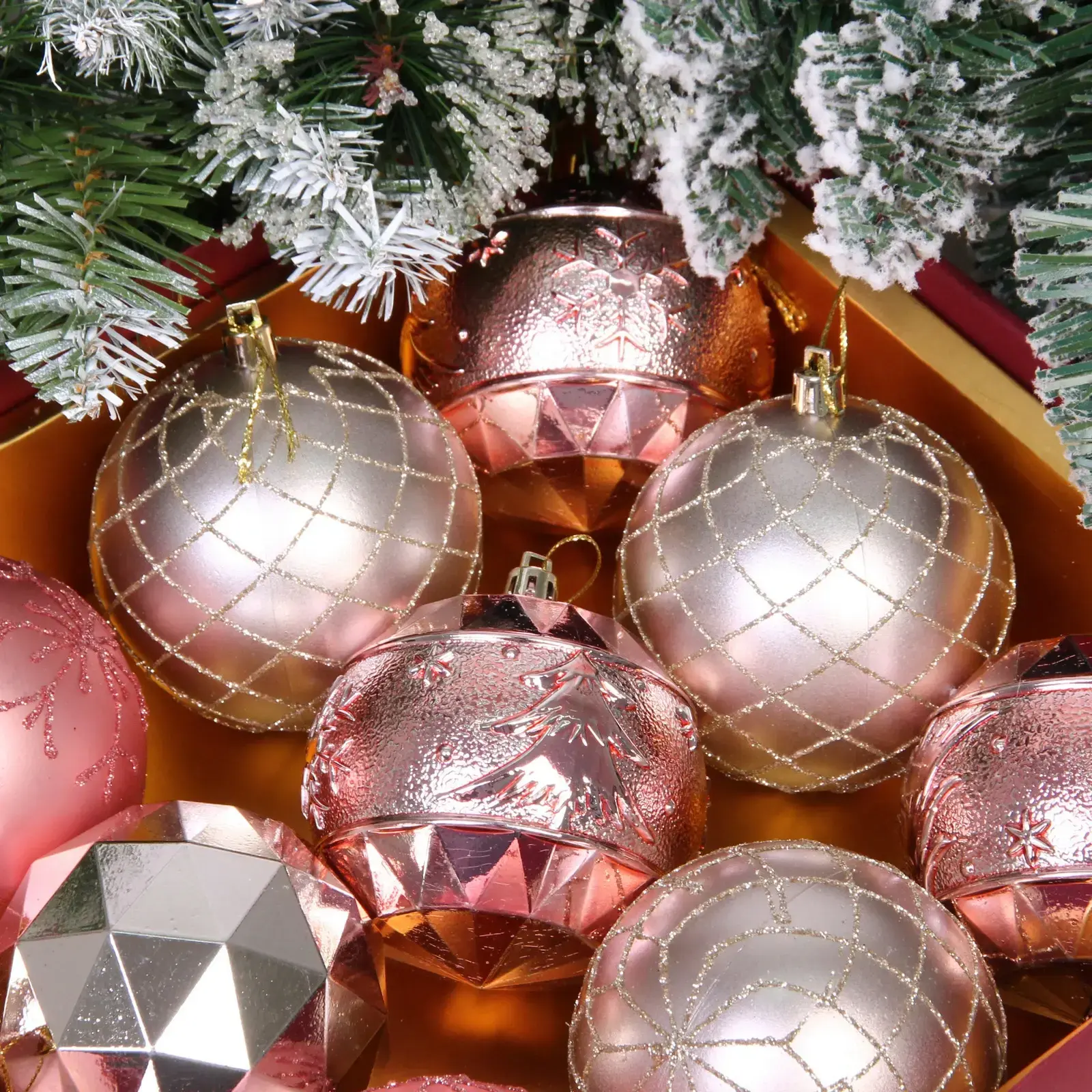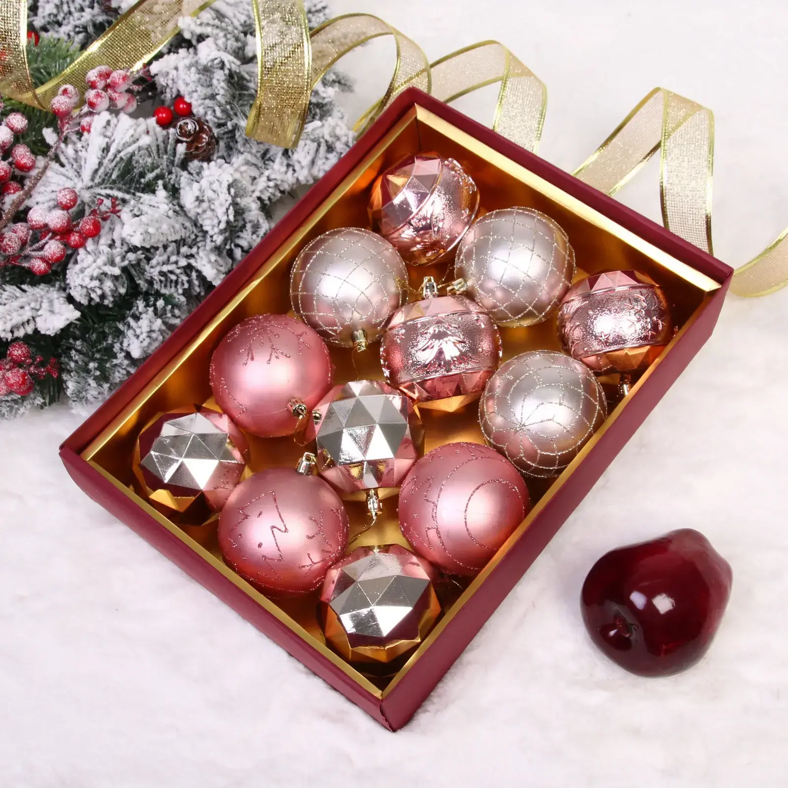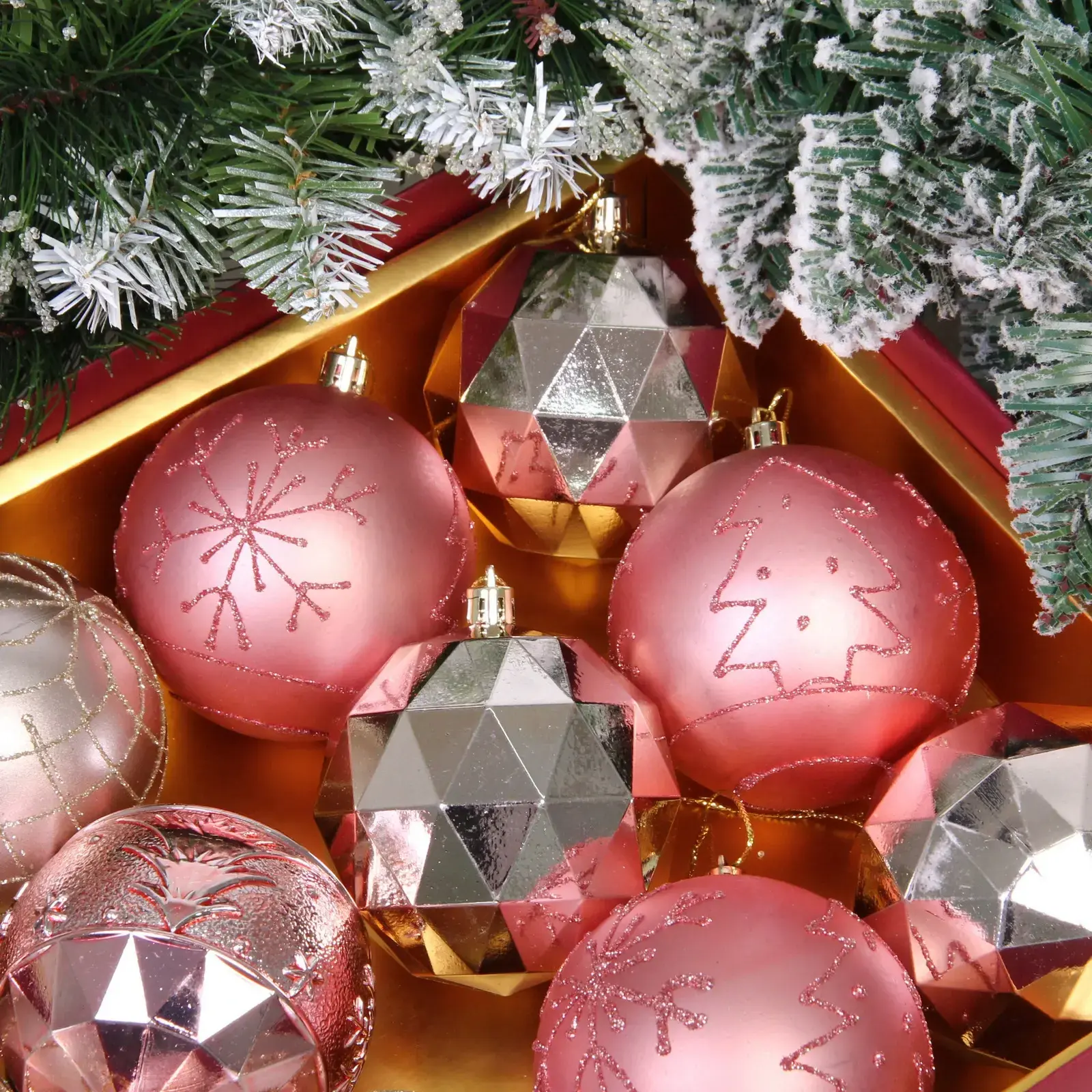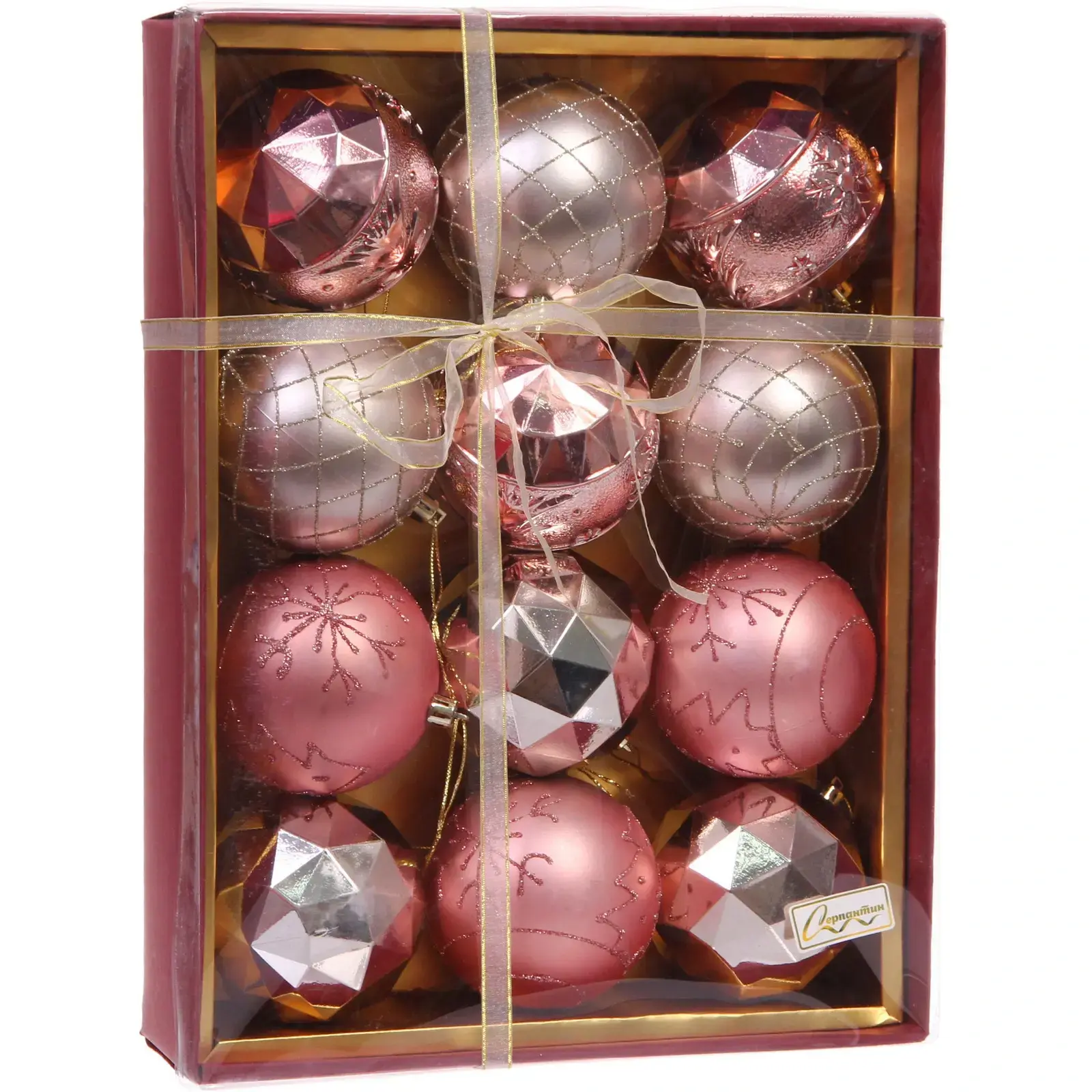 Набор из 12 дизайнерских шаров в розово-золотой гамме станет идеальным украшением для елки, интерьера или праздничного декора. Каждый шар выполнен из прочного пластика с детальной проработкой узоров — от классических снежинок до современных геометрических композиций.