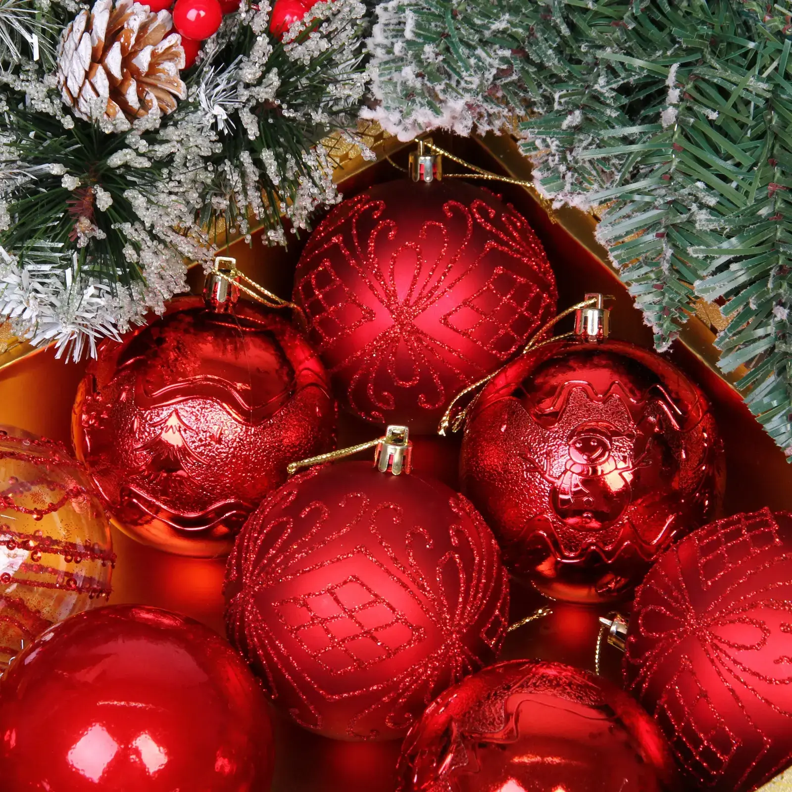 Каждый шар изготовлен из прочного пластика, устойчивого к повреждениям. Разнообразие фактур (глянцевые, матовые, с узорами) позволяет создать многогранный декор. Прозрачный элемент с золотыми акцентами добавляет изысканности.