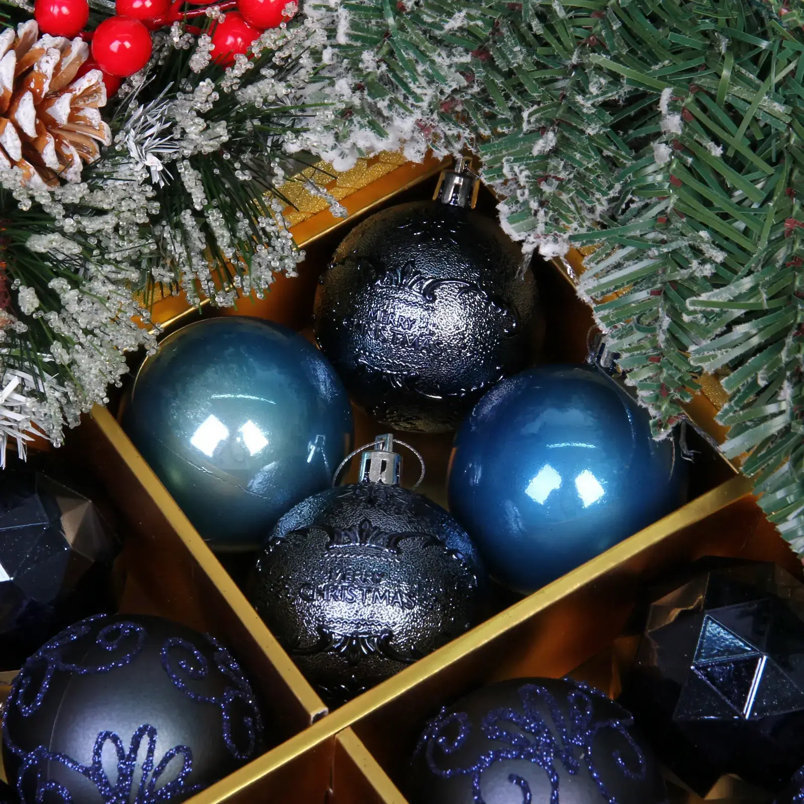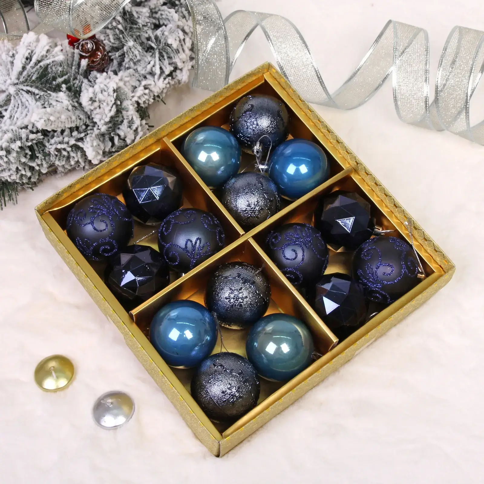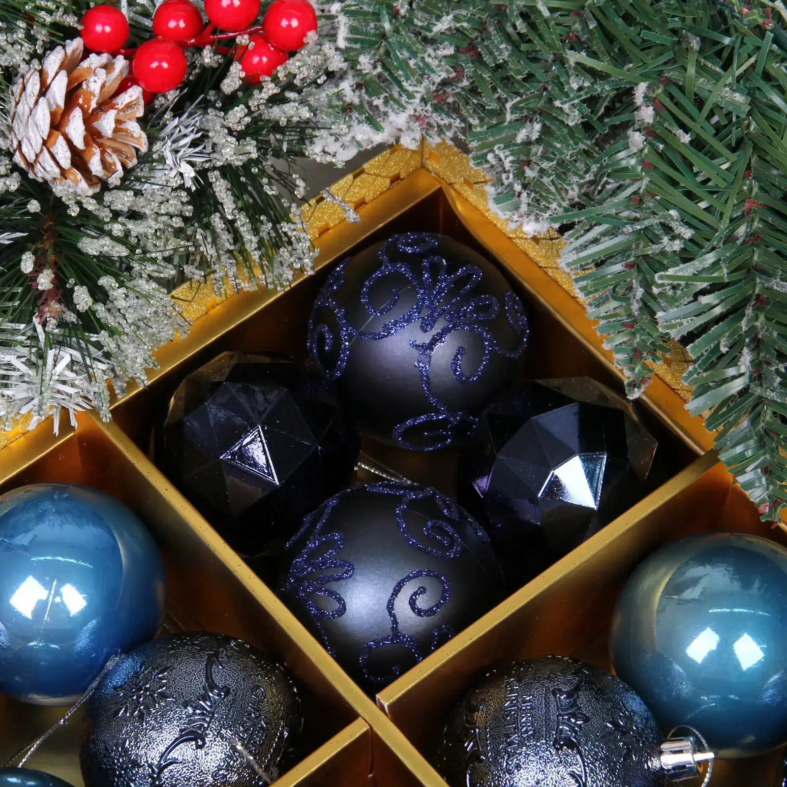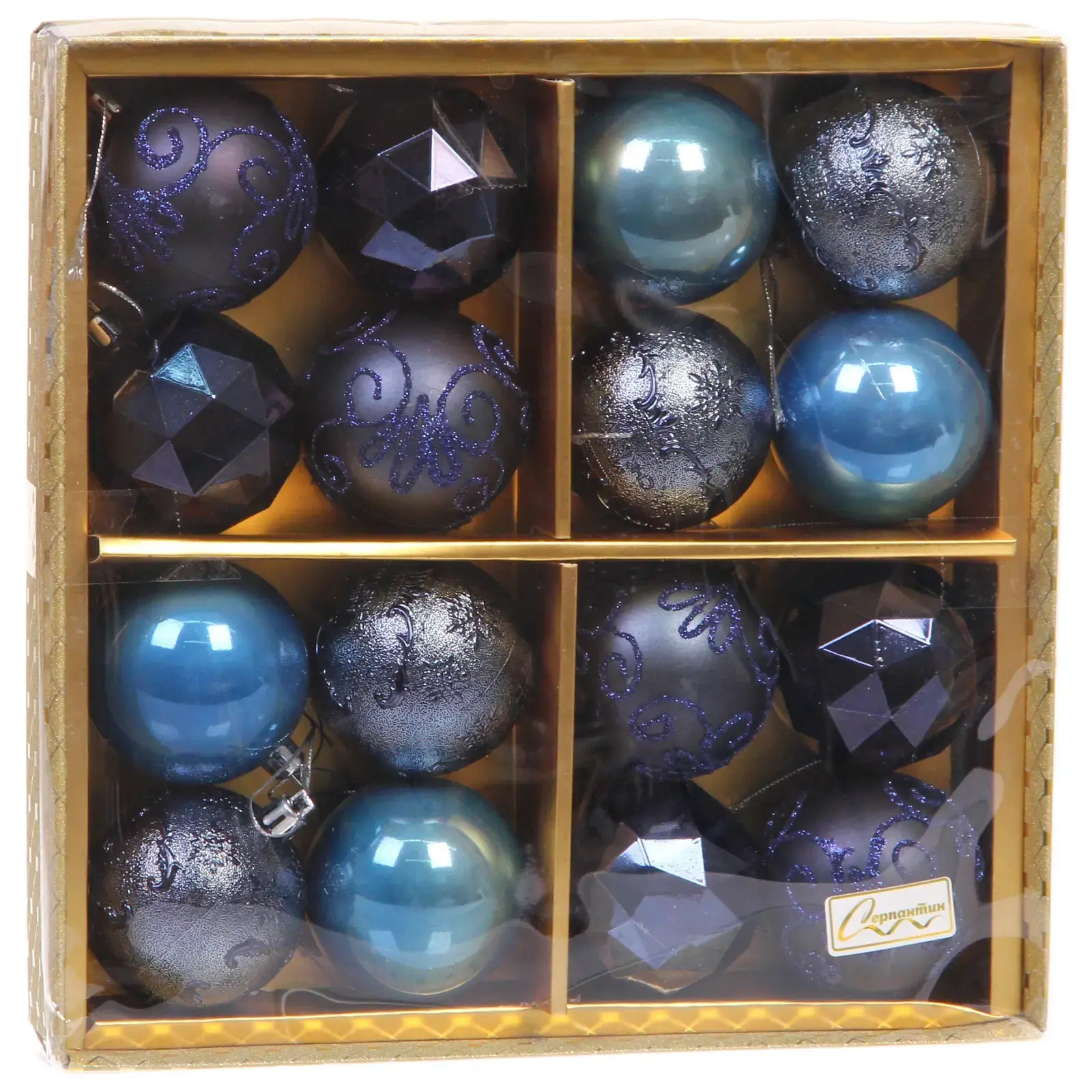 В наборе вы найдете 16 шаров, каждый из которых имеет диаметр 6 см. Они представлены в различных оттенках сапфира, что позволяет комбинировать их с другими украшениями. Упаковка выполнена в квадратной форме с прозрачной крышкой, что делает хранение удобным и стильным.