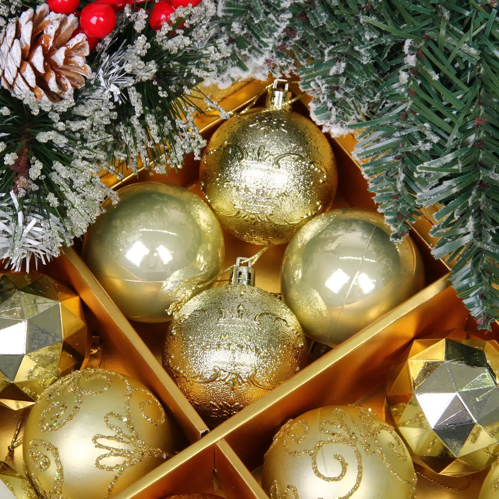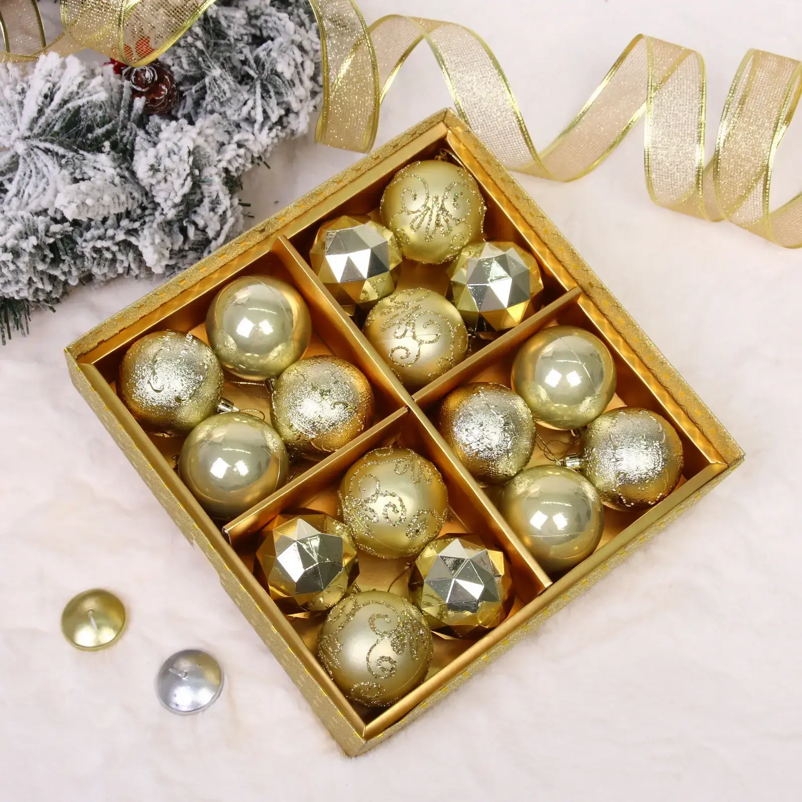 Комплект упакован в подарочную коробку с золотым тиснением, готов к презентации без дополнительного оформления. Идеальный выбор для тех, кто ценит гармоничность декора и долговечность праздничных аксессуаров.