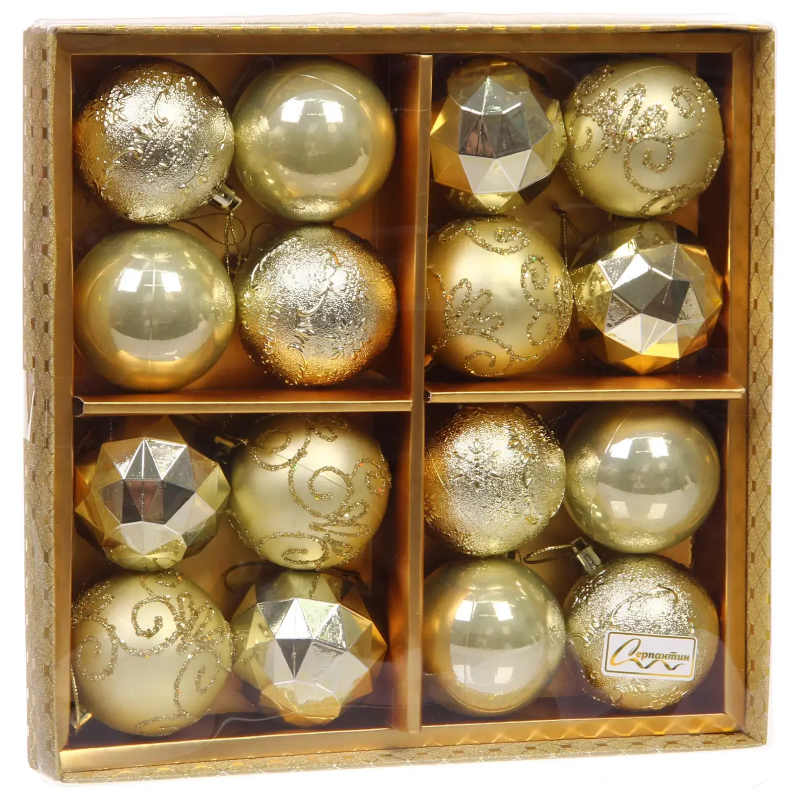 Набор из 16 изысканных елочных шаров разных форм и фактур превратит вашу новогоднюю ёлку в сияющий арт-объект. Каждый шар диаметром 6 см выполнен из прочного пластика с металлизированным покрытием, устойчивым к сколам и выцветанию.