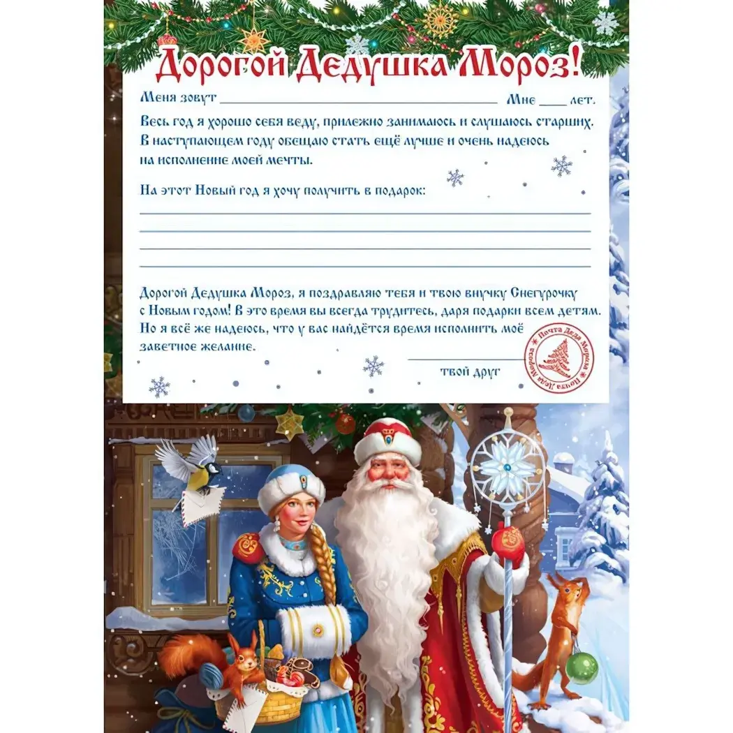 Размер бланка письма составляет 29,5х21 см, что позволяет удобно писать и оформлять пожелания. Наклейки формата А6 добавляют дополнительный элемент веселья и творчества. Набор станет отличным подарком для детей, которые верят в чудеса и хотят поделиться своими мечтами с Дедушкой Морозом.